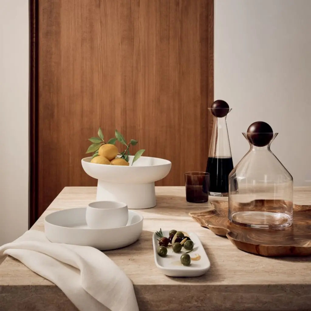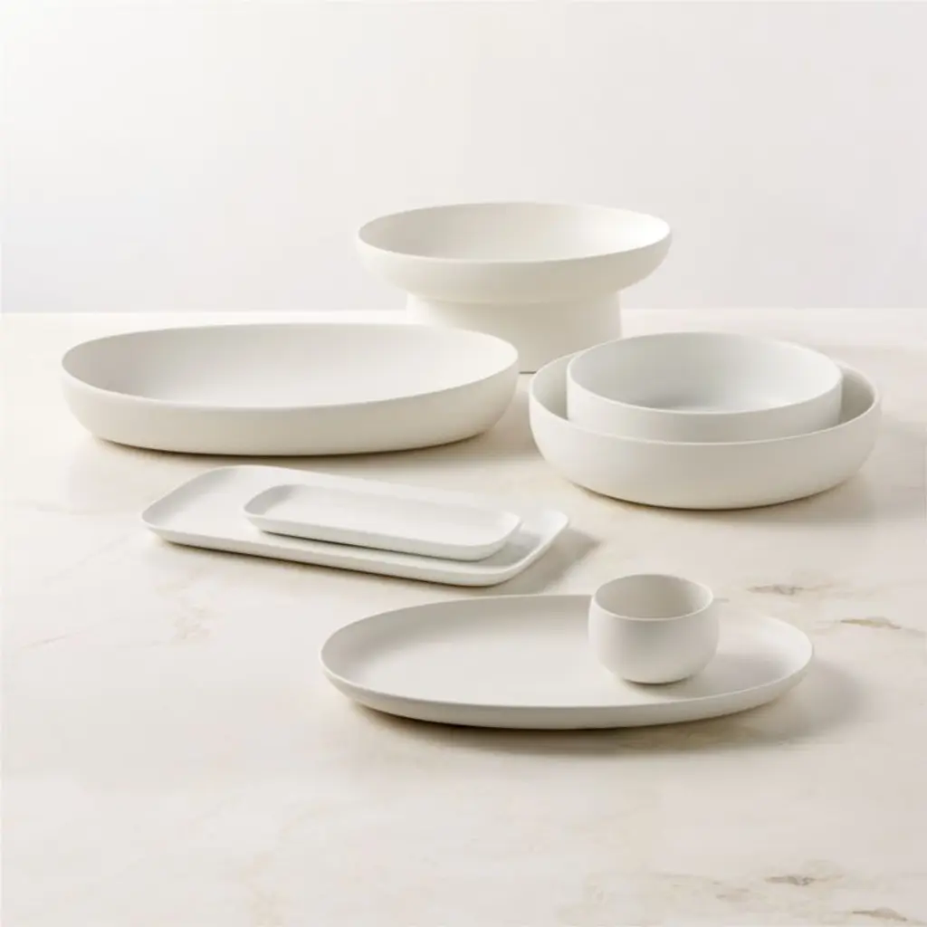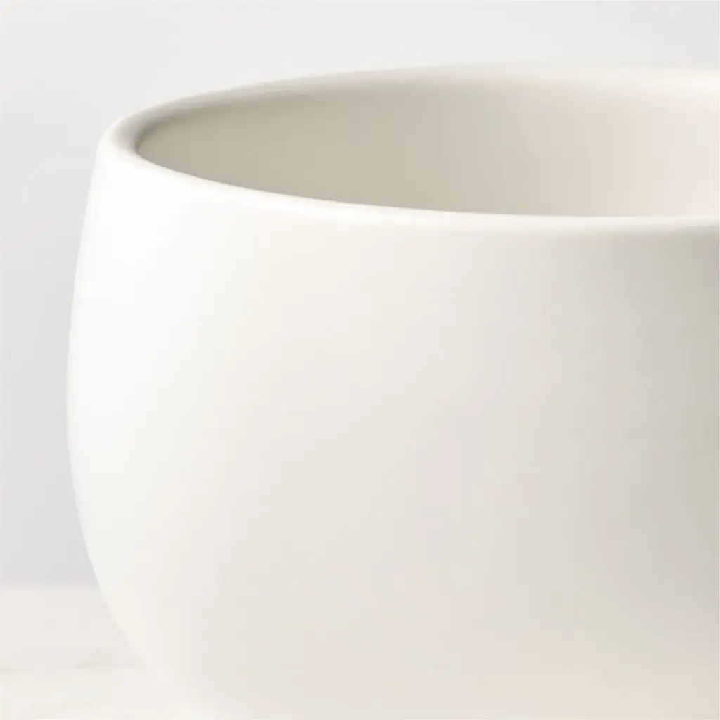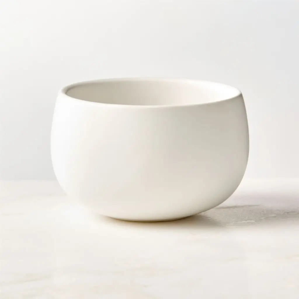 The petite dip bowl from award-winning Japanese designer Ryuichi Kozeki easily transitions from casual to formal settings. Featuring raised edges, the round bowl is glazed by hand in crisp matte white. Provides a modern backdrop for dip, nuts or olives. Layer with the other pieces in the Mori dinnerware and serveware collections. CB2 exclusive.
