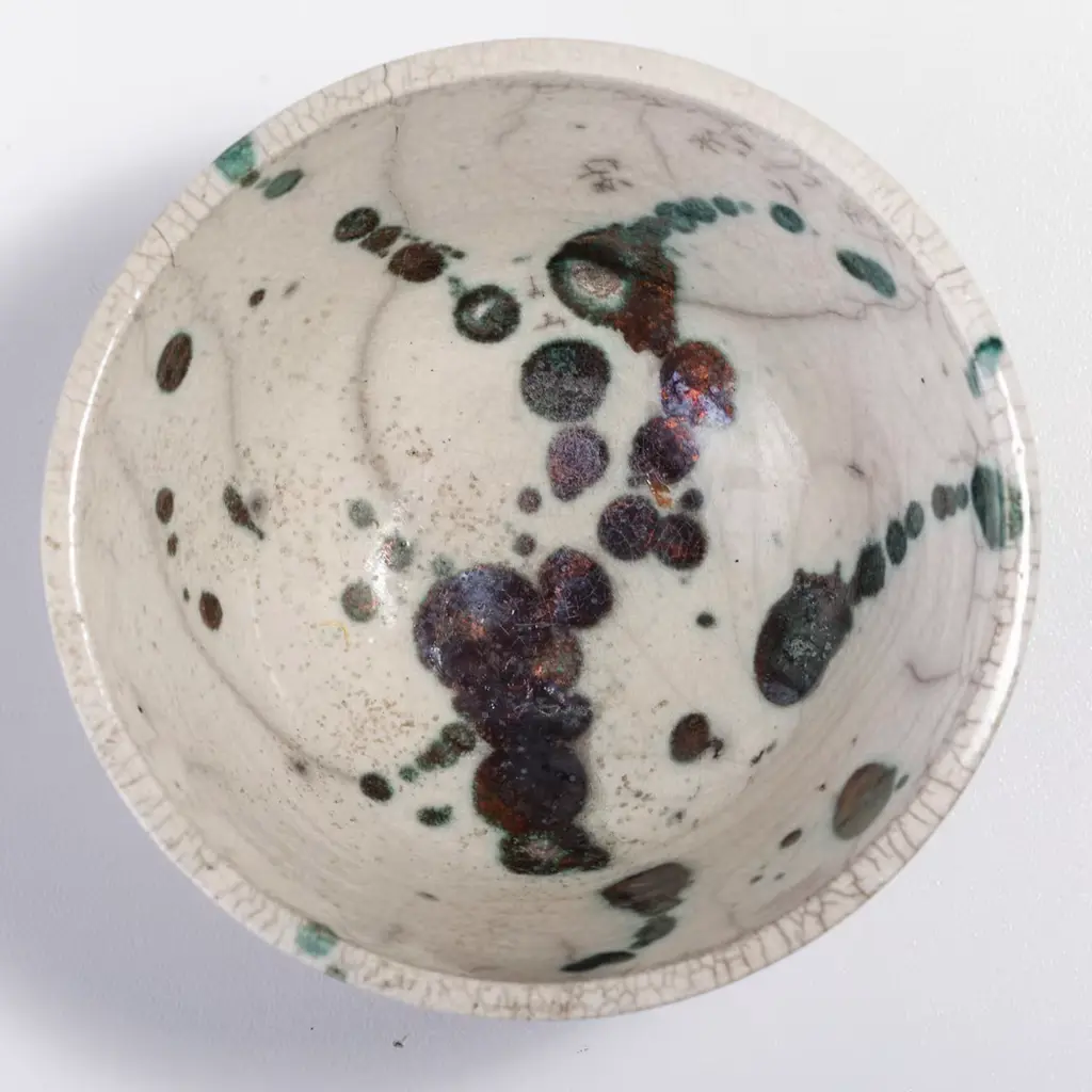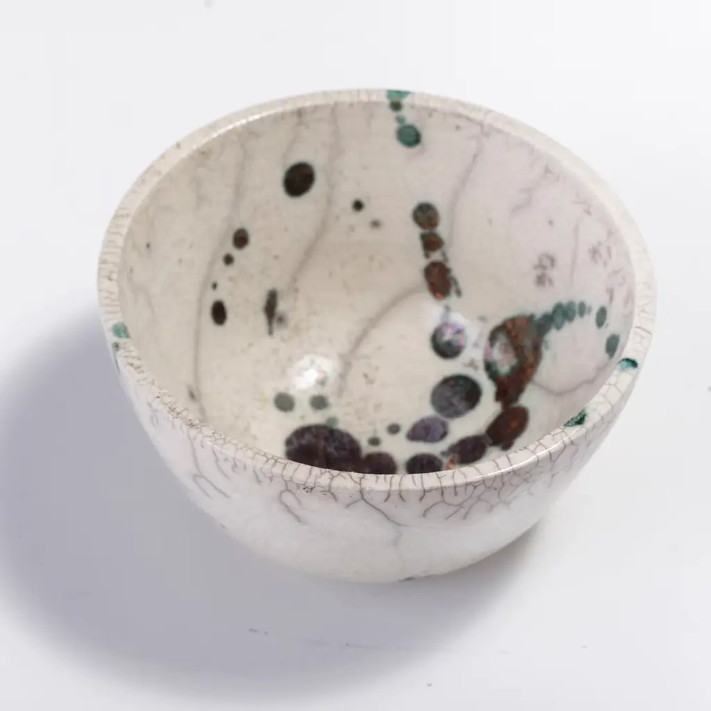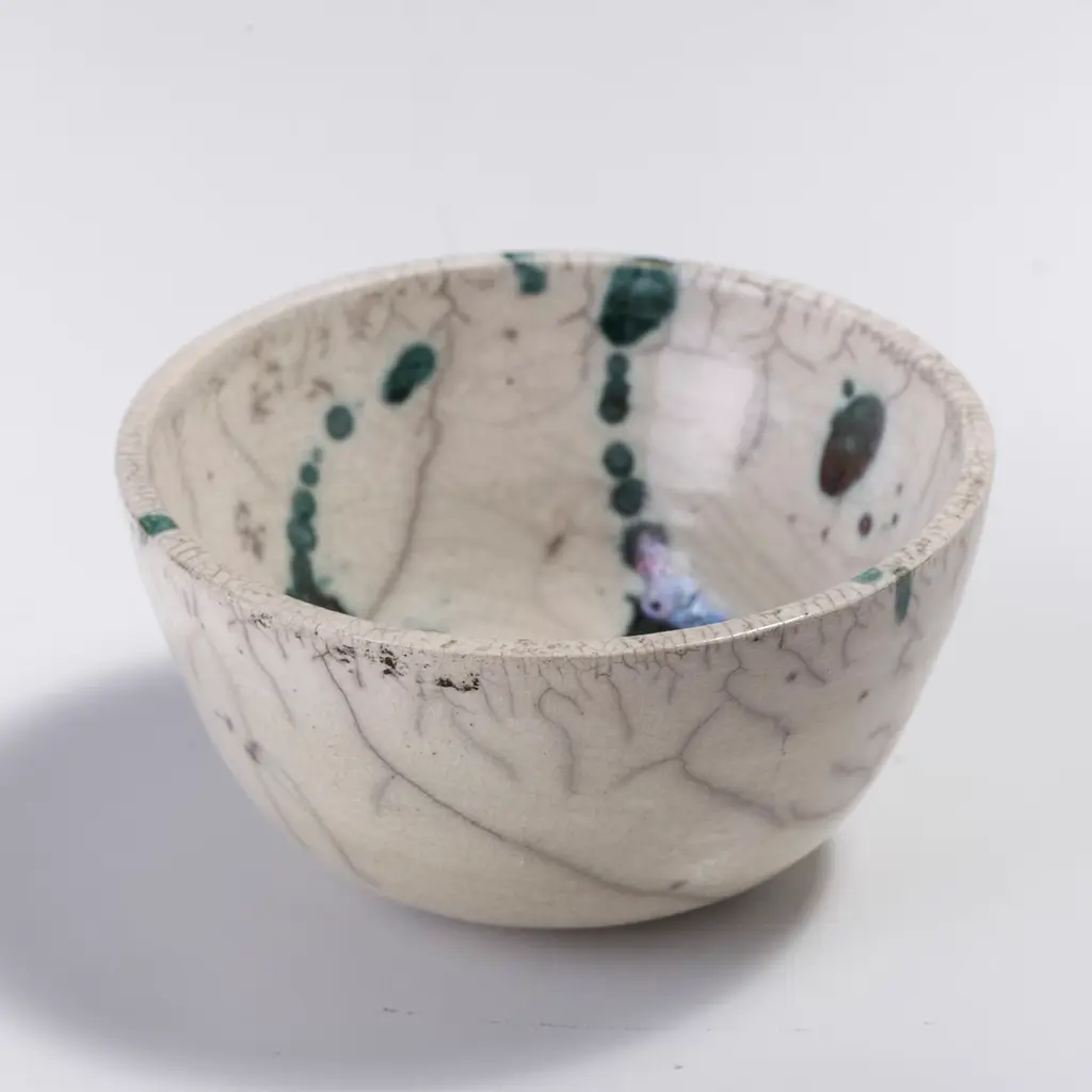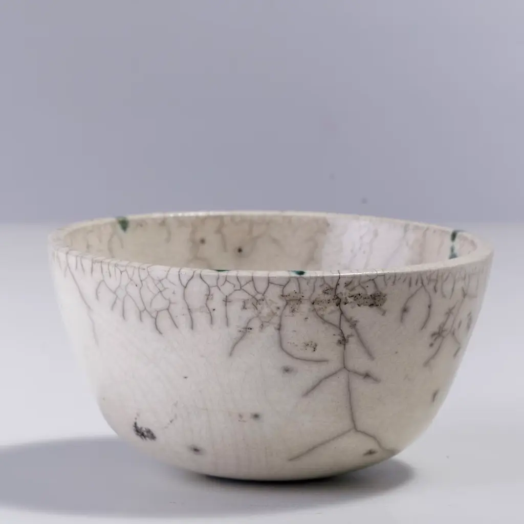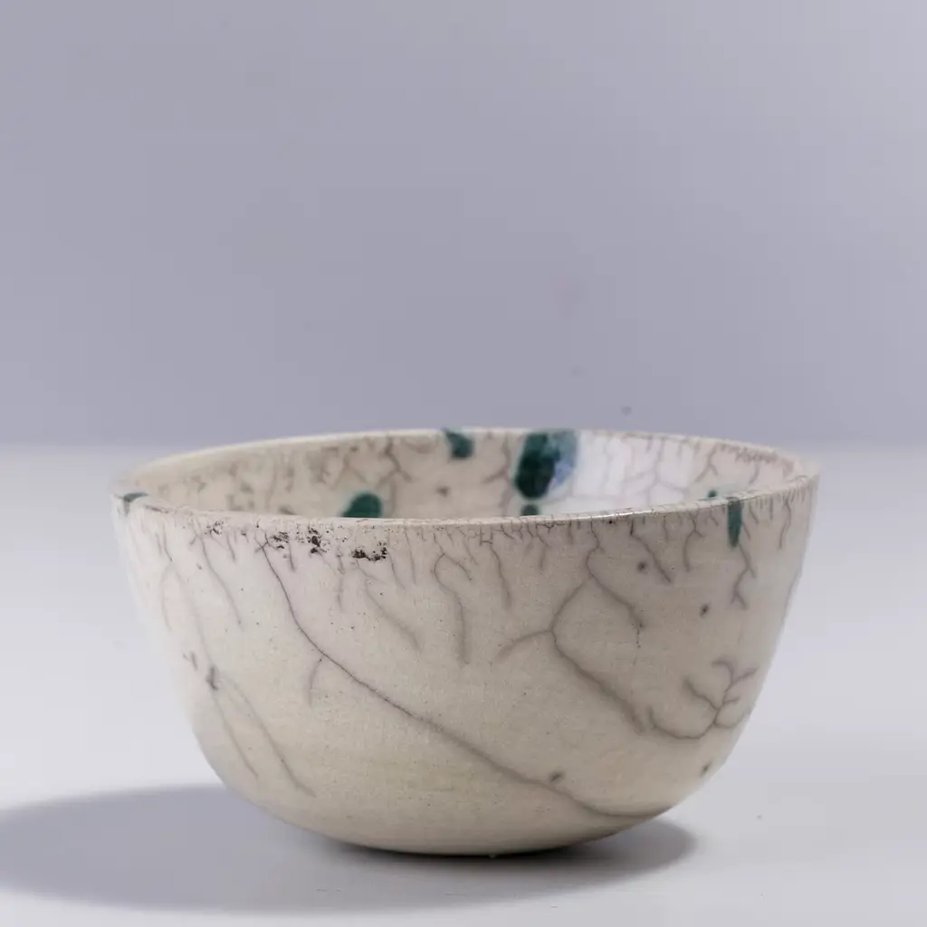 A visually impressive yet soft play of shades describes the mesmerizing flair of this spectacular bowl, marked by a natural white color enriched with rusty green spots and a gray patchwork. A unique objet d'art, it is handcrafted of ceramic following the Japanese technique of naked Raku firing, which makes each piece a one-of-a-kind design of unprecedented charm.