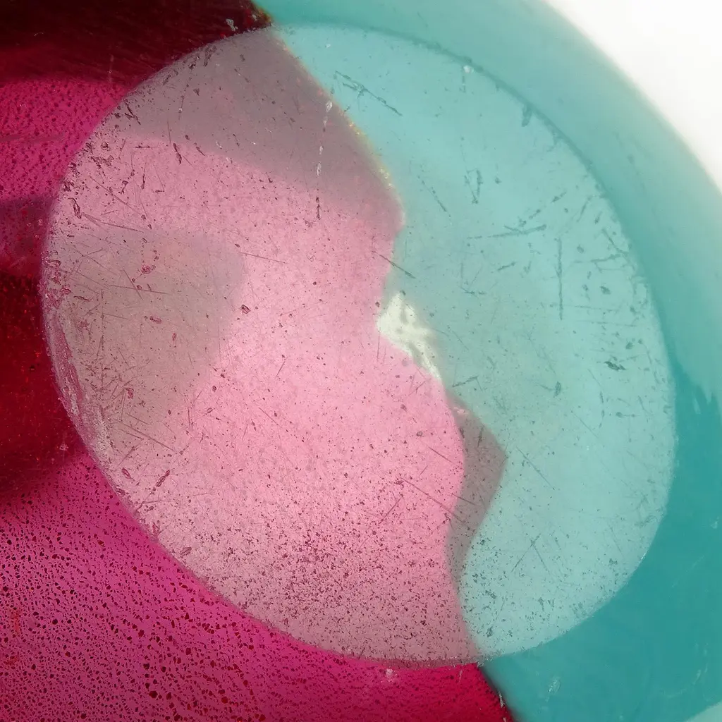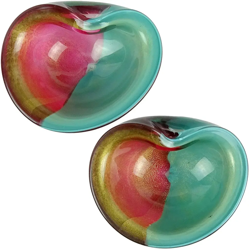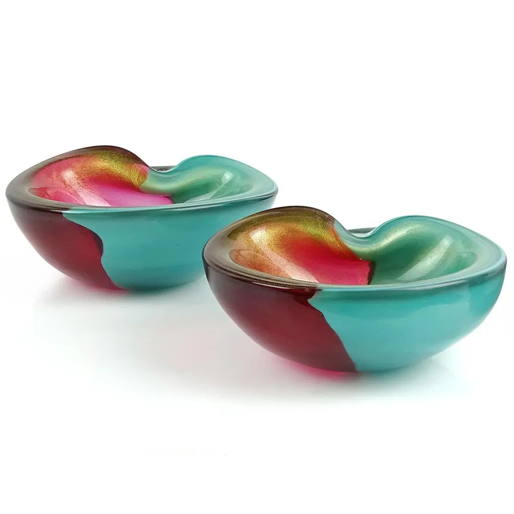 Priced Per Item (2 bowls available as shown) Beautiful vintage Murano handblown bi-color amethyst purple and aqua green gold flecks Italian art glass bowl or ashtray. Documented to designer Alfredo Barbini, circa 1950-1960s. Cover in gold leaf on the inside. Would make a great display piece on any desk or coffee table. Use it as a catchall, or candy dish. Mid-century era. Please see condition and all photos. FREE Shipping via Priority Mail, Insured with Signature Confirmation, 5 Day estimated delivery.