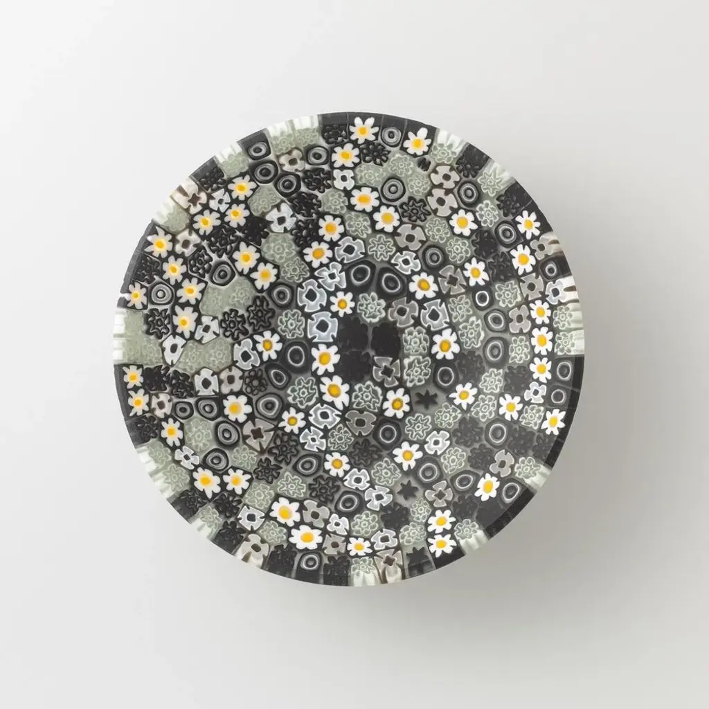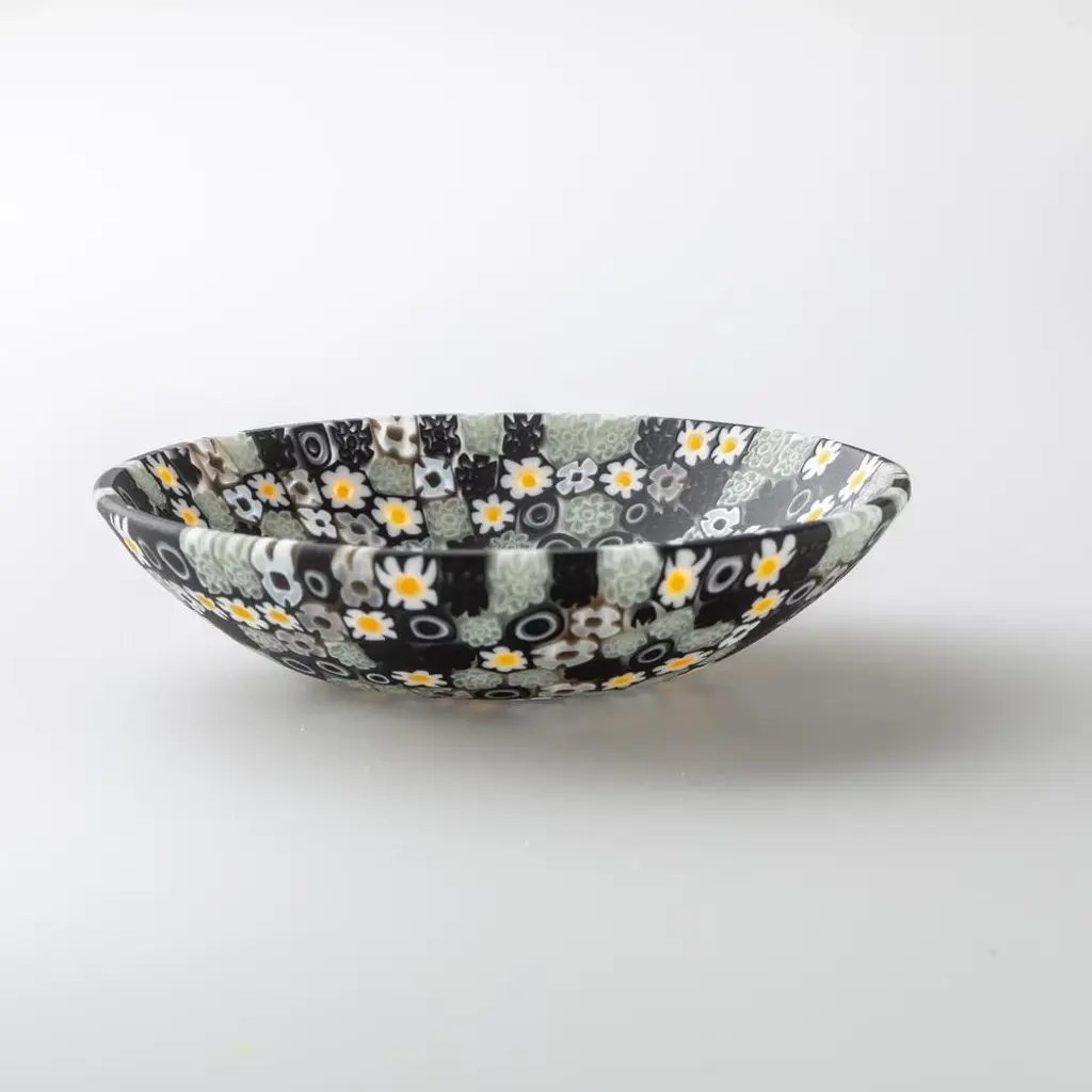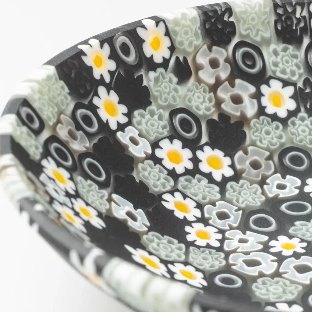 Murano glass bowl made by melting together sections of glass rods in a furnace, with each section depicting a small decorative motif. This technique is called “Millefiori Murrina Glass”. A murrina with the initial “M” for Moretti is inserted during the composition. Each bowl is marked with the “Vetri Artistico Murano” brand that certifies its origin. Sold with gift box. Signed by Maker