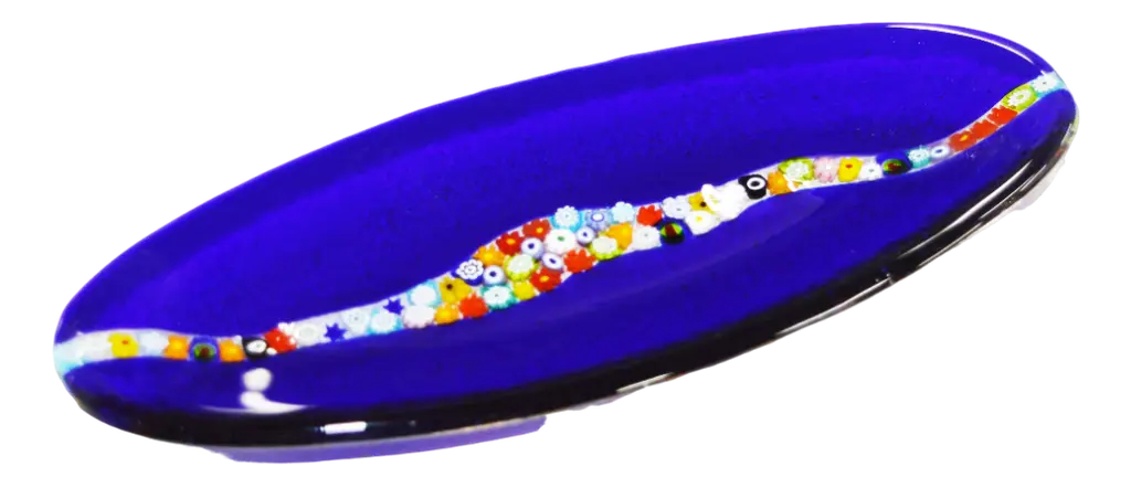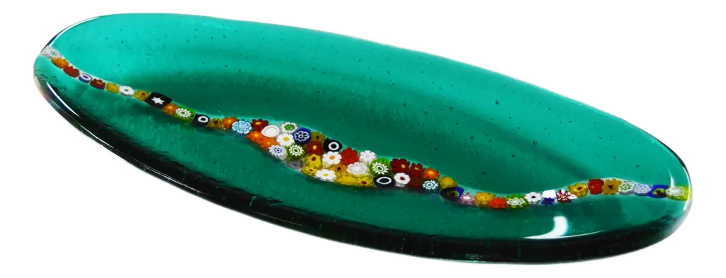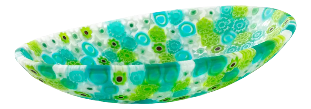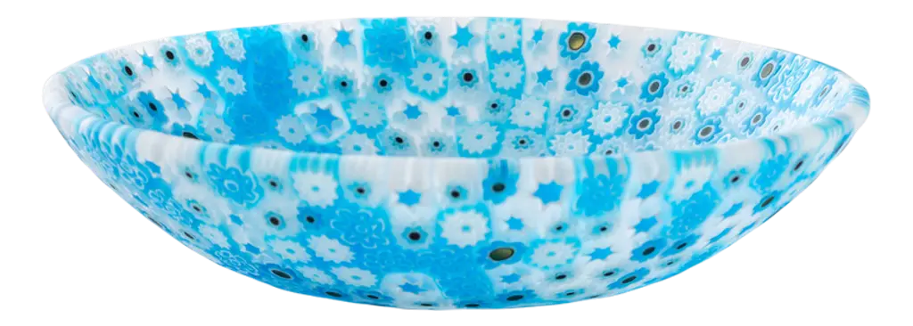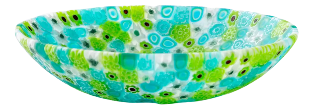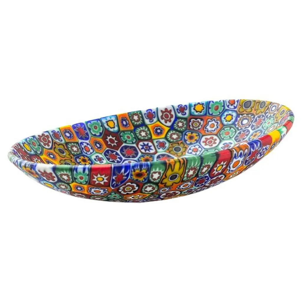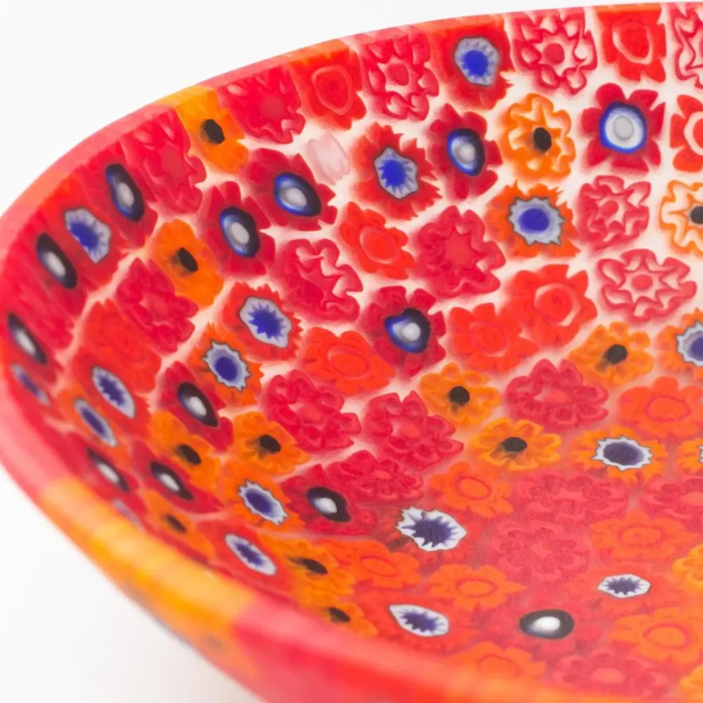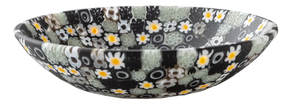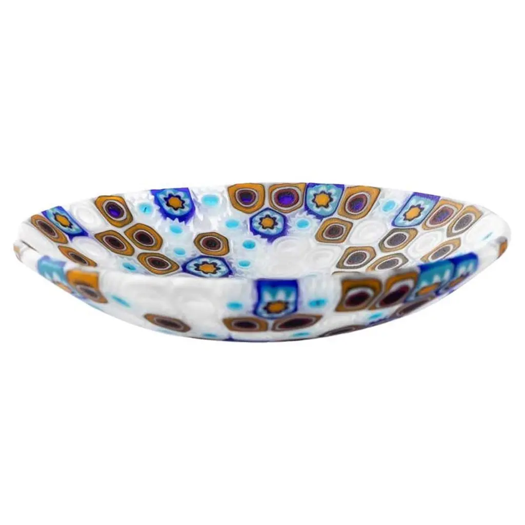 Murano glass bowl made by melting together sections of glass rods in a furnace, with each section depicting a small decorative motif. This technique is called “Millefiori Murrina Glass”. A murrina with the initial “M” for Moretti is inserted during the composition. Each bowl is marked with the “Vetri Artistico Murano” brand that certifies its origin. Sold with gift box. Signed by Maker
