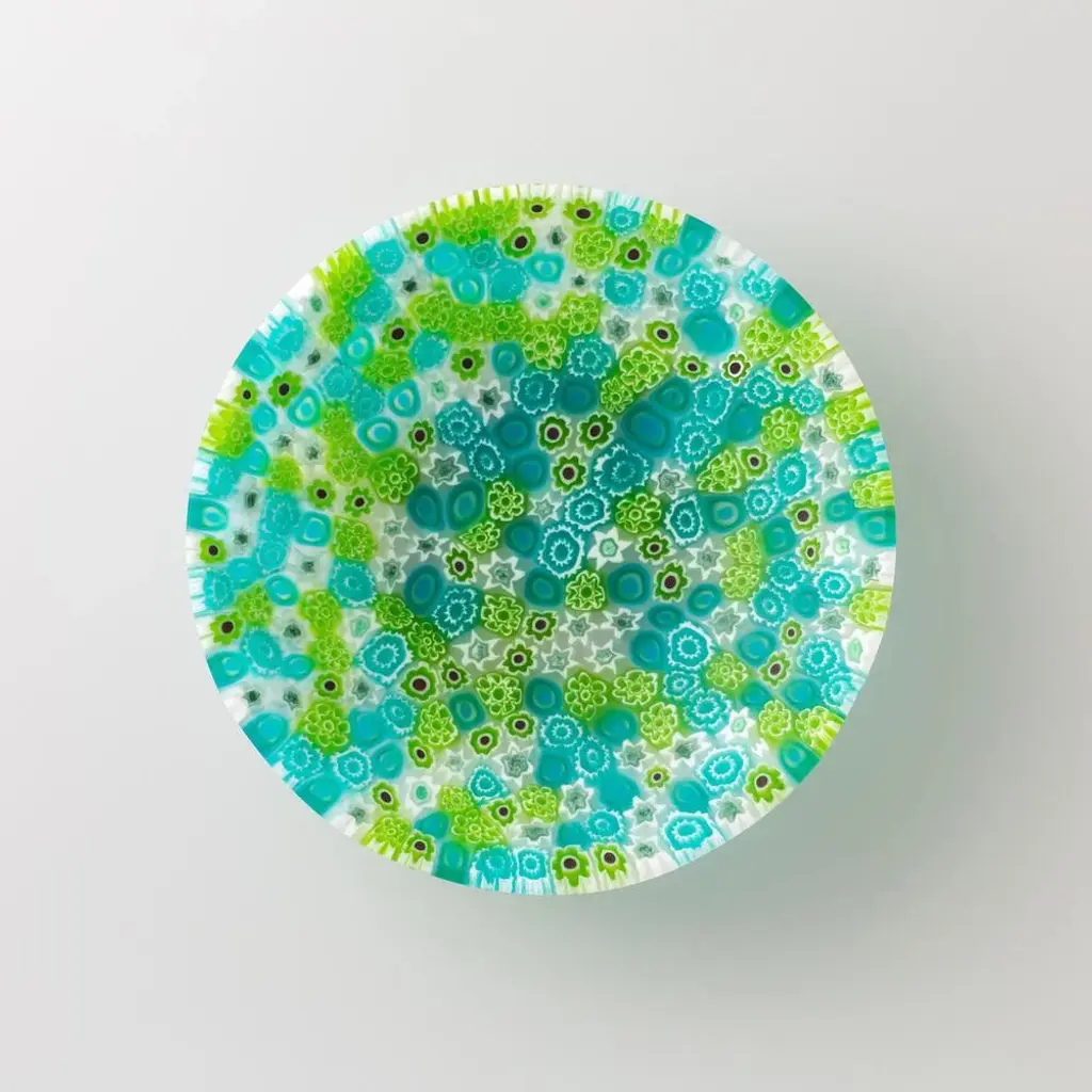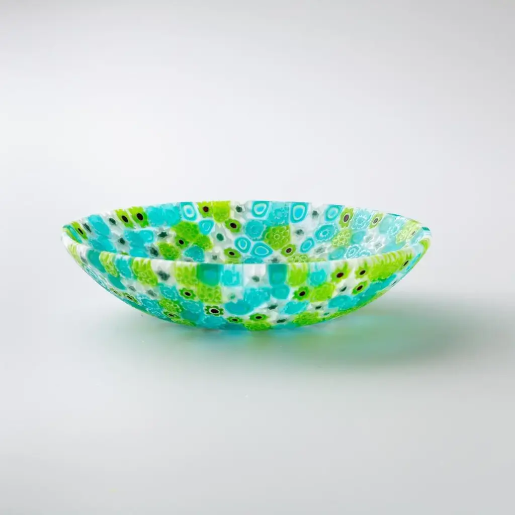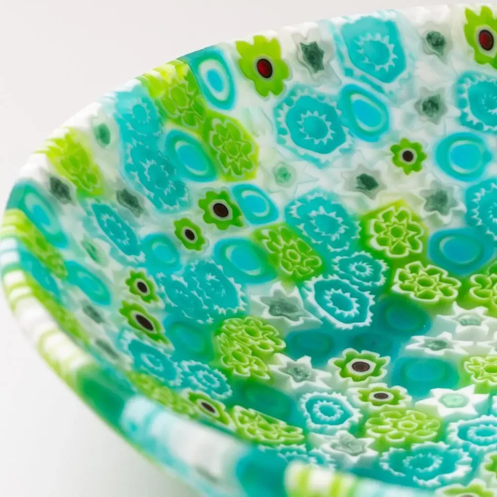 Murano glass bowl made by melting together sections of glass rods in a furnace, with each section depicting a small decorative motif. This technique is called “Millefiori Murrina Glass”. A murrina with the initial “M” for Moretti is inserted during the composition. Each bowl is marked with the “Vetri Artistico Murano” brand that certifies its origin. Sold with gift box. Signed by Maker
