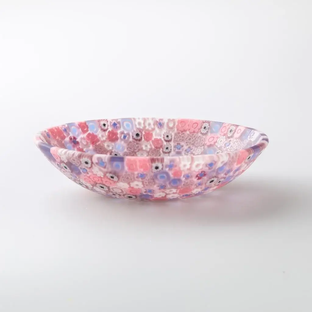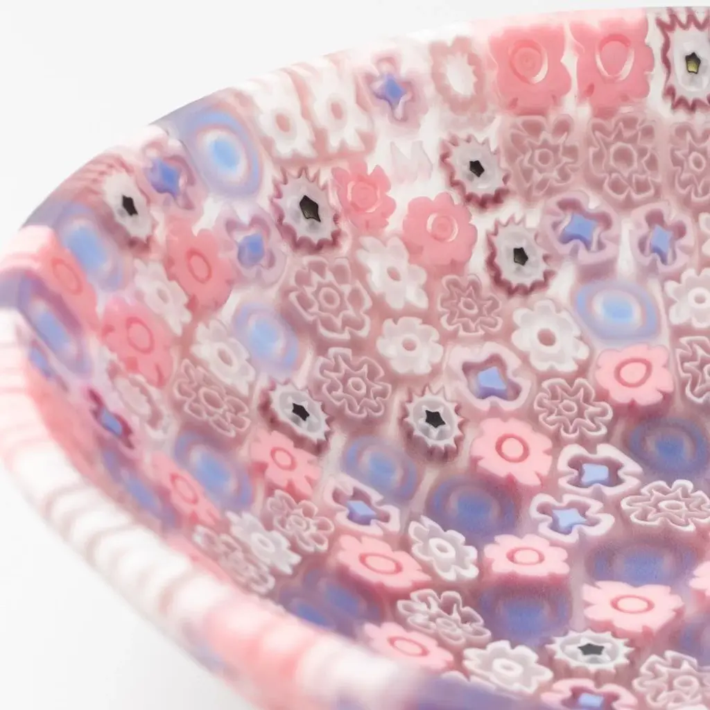 Murano glass bowl made by melting together sections of glass rods in a furnace, with each section depicting a small decorative motif. This technique is called “Millefiori Murrina Glass”. A murrina with the initial “M” for Moretti is inserted during the composition. Each bowl is marked with the “Vetri Artistico Murano” brand that certifies its origin. Sold with gift box. Signed by Maker