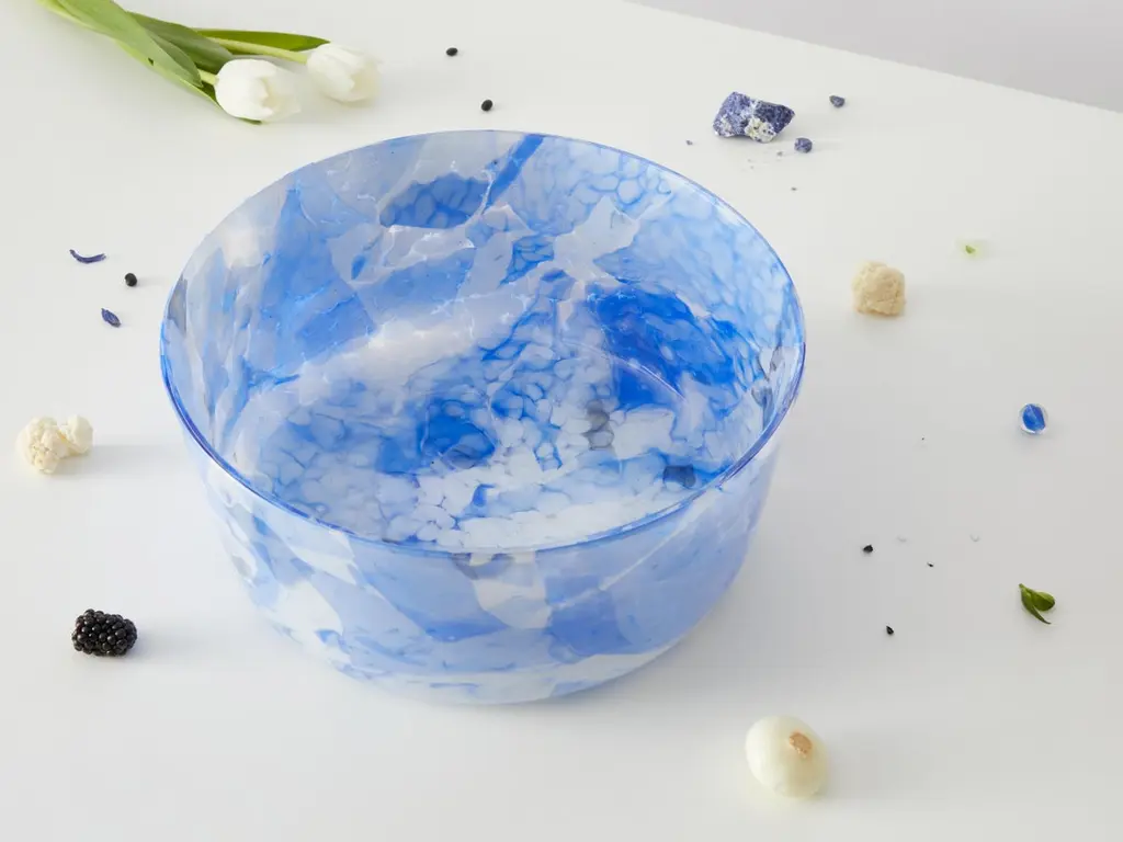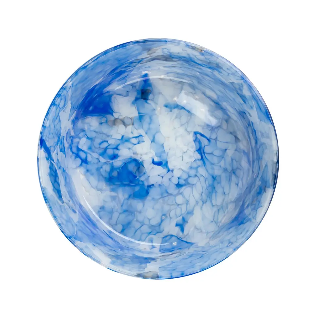 Our glass bowl is meticulously crafted by skilled artisans in Venice. Its stunning blue color effortlessly enchants the eyes, bringing a touch of sophistication to any space. Each bowl is meticulously formed using the ancient Murano glassblowing technique, a tradition that spans centuries. Through our distinctive Nougat technique, colored glass shards are delicately melted onto an ivory glass base, resulting in a mesmerizing fusion of ever-changing hues. The graceful blend of blue and ivory creates a captivating contrast, both striking and delicate in its allure. This Murano blown glass bowl serves as the perfect centerpiece for your dining table, coffee table, or display shelf. Its versatile size allows for a myriad of creative arrangements, from stylish fruit displays to artful combinations of flowers and candles. It effortlessly enhances any interior decor, seamlessly fitting into both classic and contemporary settings, while adding a touch of elegance and refinement. Immerse yourself in the allure of Italian craftsmanship and the joy of owning a truly unique piece. Experience the timeless beauty that only Murano glass can offer by shopping now.