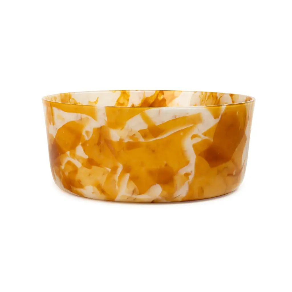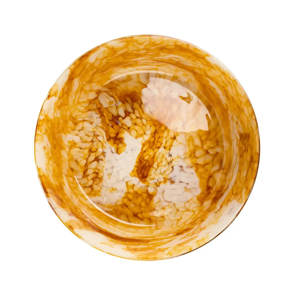 Our glass bowl is meticulously crafted by skilled artisans in Venice. Its stunning deep amber color effortlessly enchants the eyes, bringing a touch of sophistication to any space. Each bowl is meticulously formed using the ancient Murano glassblowing technique, a tradition that spans centuries. Through our distinctive Nougat technique, colored glass shards are delicately melted onto an ivory glass base, resulting in a mesmerizing fusion of ever-changing hues. The graceful blend of amber and ivory creates a captivating contrast, both striking and delicate in its allure. This Murano blown glass bowl serves as the perfect centerpiece for your dining table, coffee table, or display shelf. Its versatile size allows for a myriad of creative arrangements, from stylish fruit displays to artful combinations of flowers and candles. It effortlessly enhances any interior decor, seamlessly fitting into both classic and contemporary settings, while adding a touch of elegance and refinement. Immerse yourself in the allure of Italian craftsmanship and the joy of owning a truly unique piece. Experience the timeless beauty that only Murano glass can offer by shopping now.