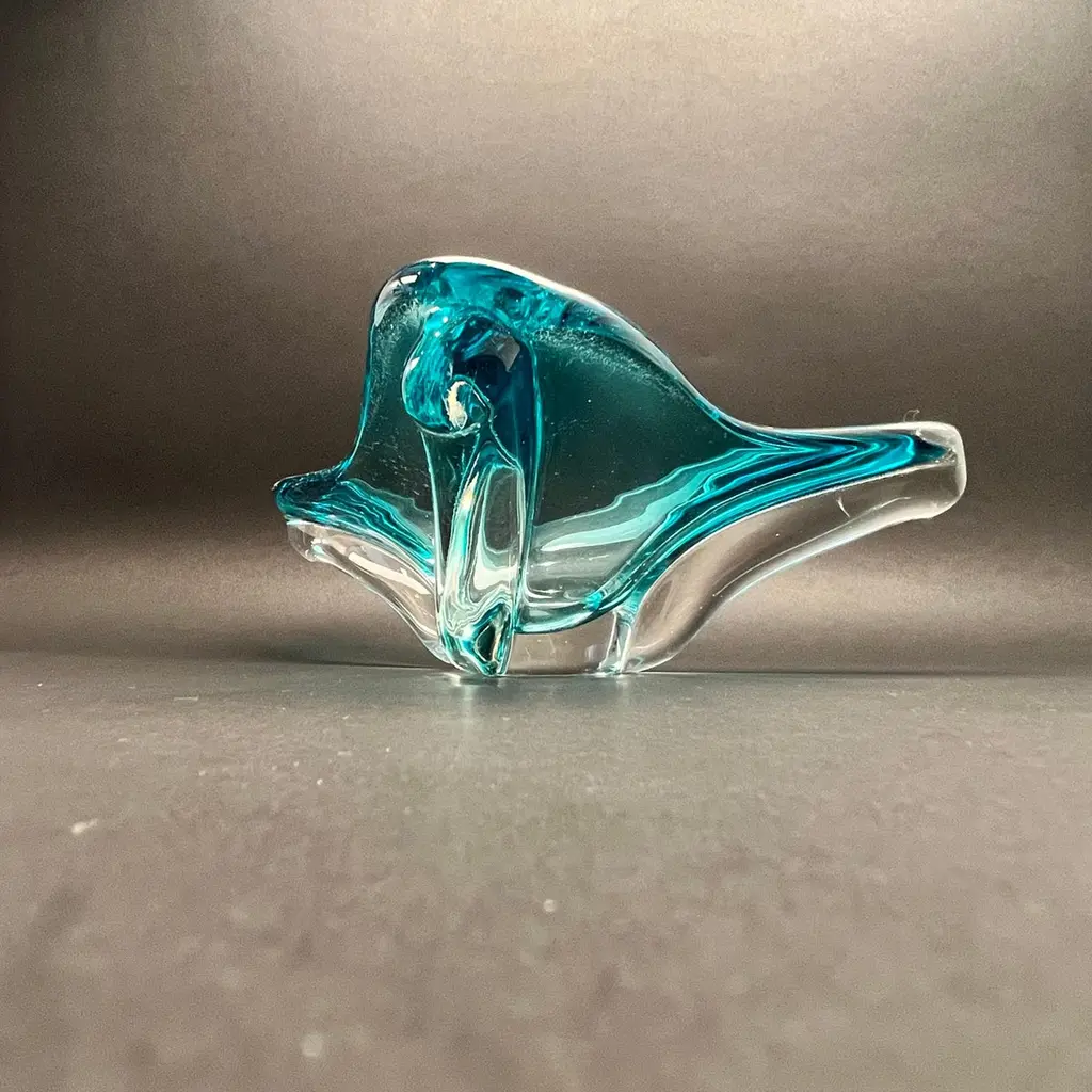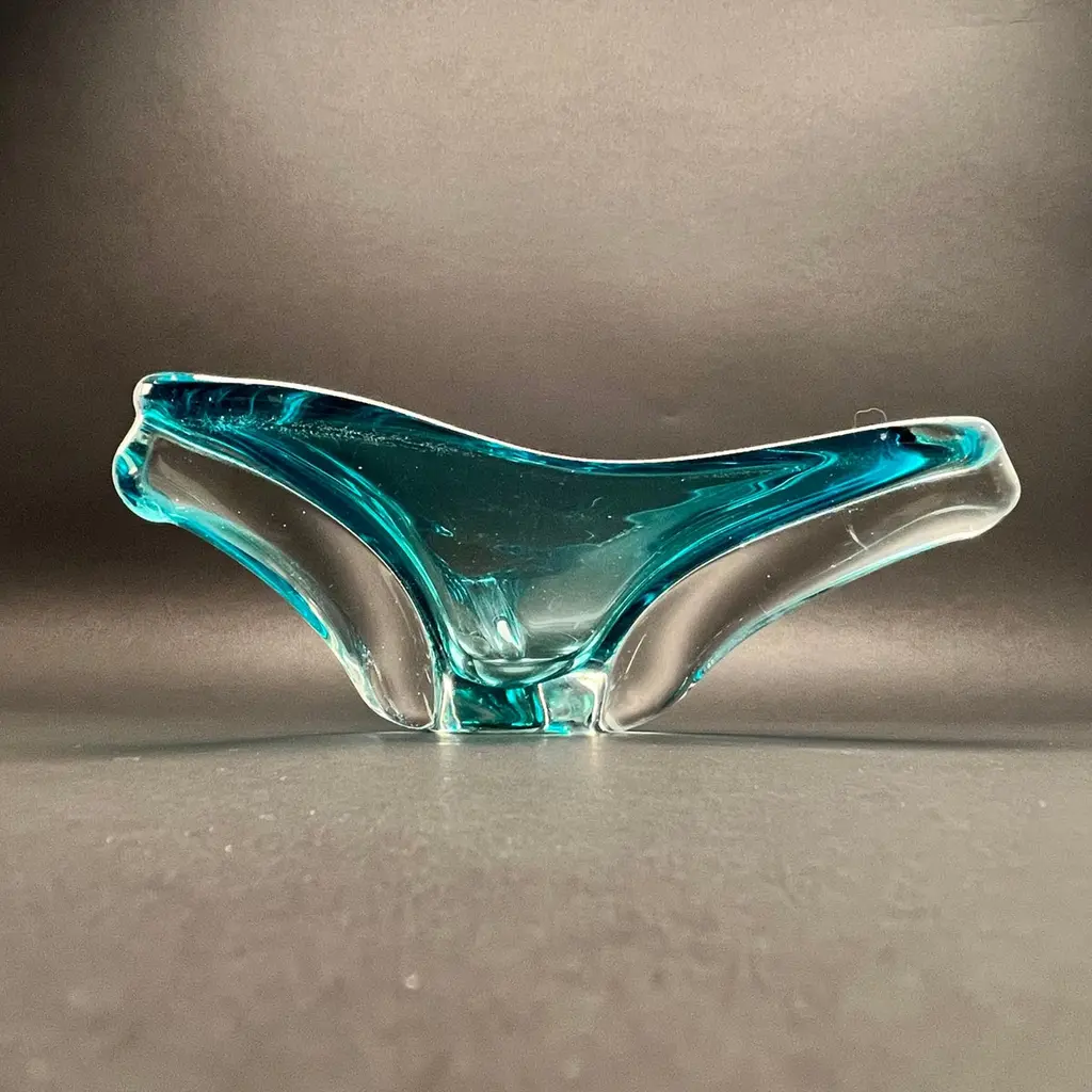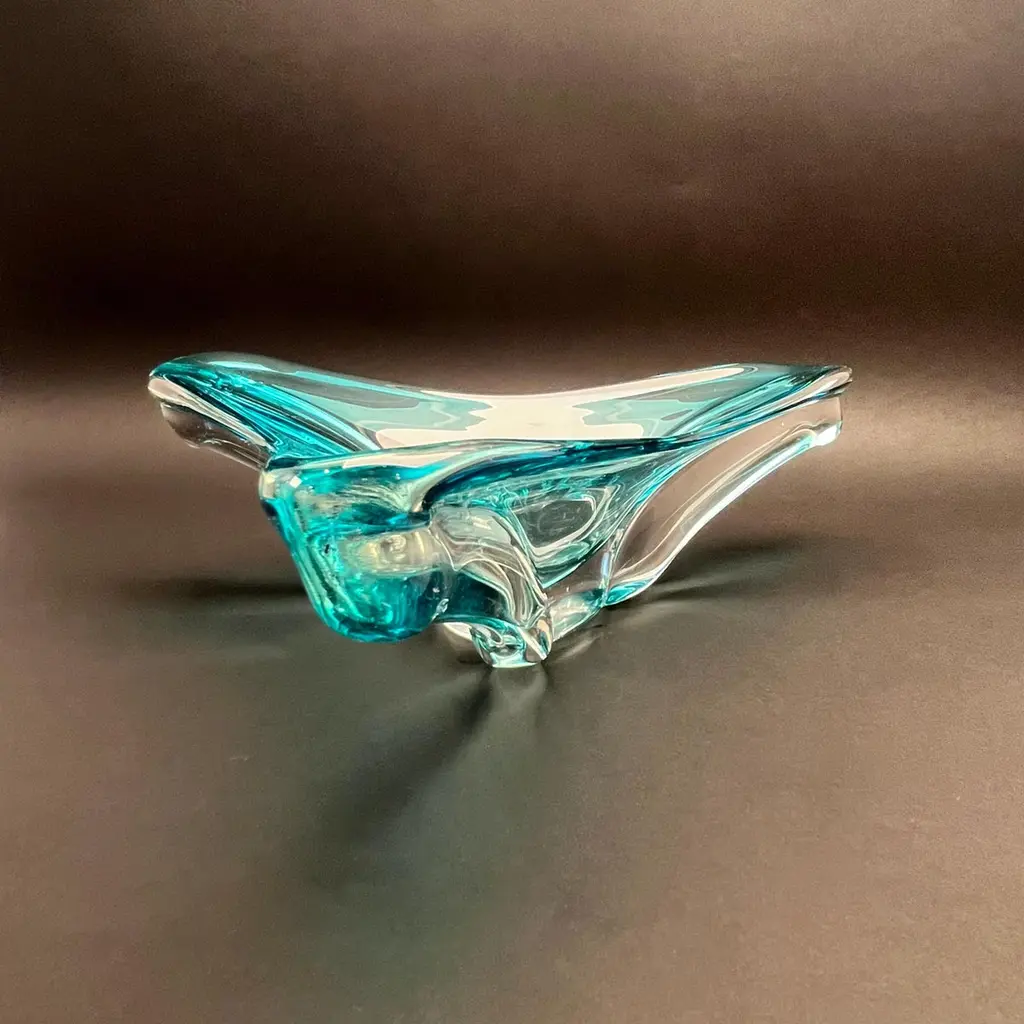 A beautiful blue murano hand-blown glass bowl. This item shows all the mastery of Italian glassblowers. It is simple yet unique example of midcentury modern design. In perfect condition without chips or cracks. Made in Italy, 1970sDimensions: - lenght 30cm;- height 9cm.