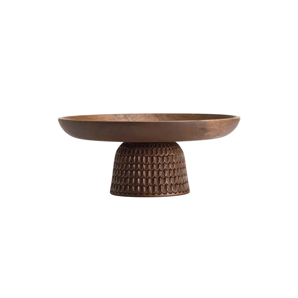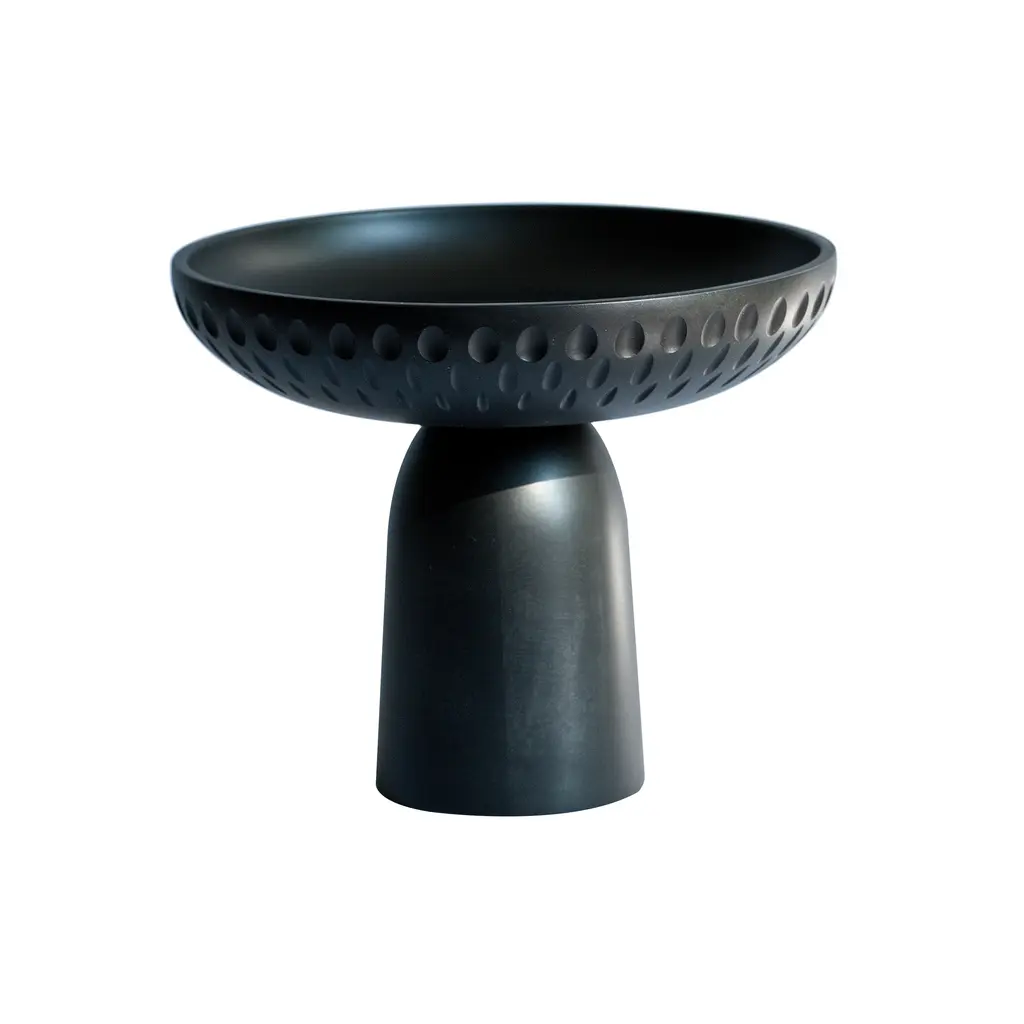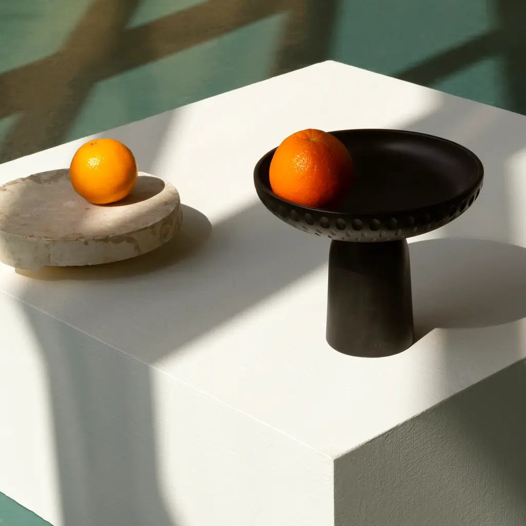 Nera’s exceptional run of footed solid-wood bowls embodies pleasing proportions, sculptural refinement and meticulously executed carving details. In 3 different sizes and a choice of natural and black-stained maple as well as walnut, they are hand-crafted by Zanat’s artisans from sustainably sourced timbers. The larger version features a custom choice of motifs surrounding the raised bowl while the medium and smaller versions have a standardized pattern incised at the base.