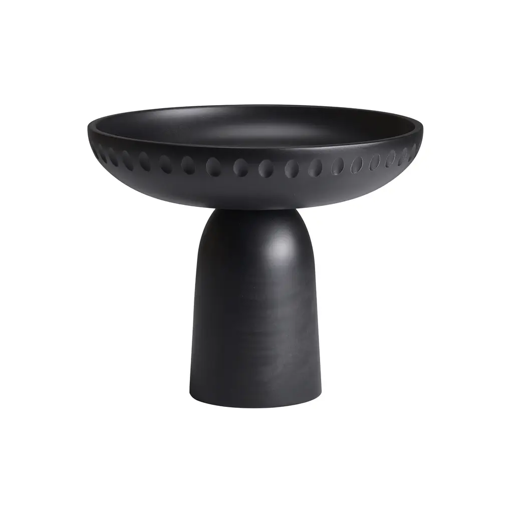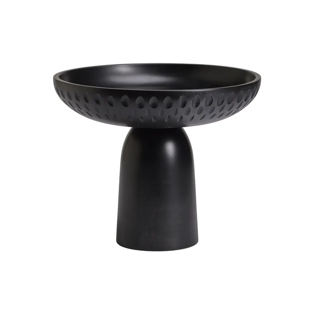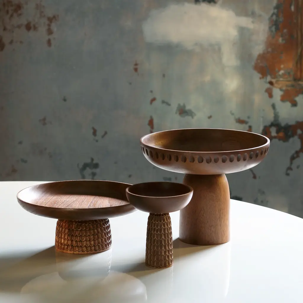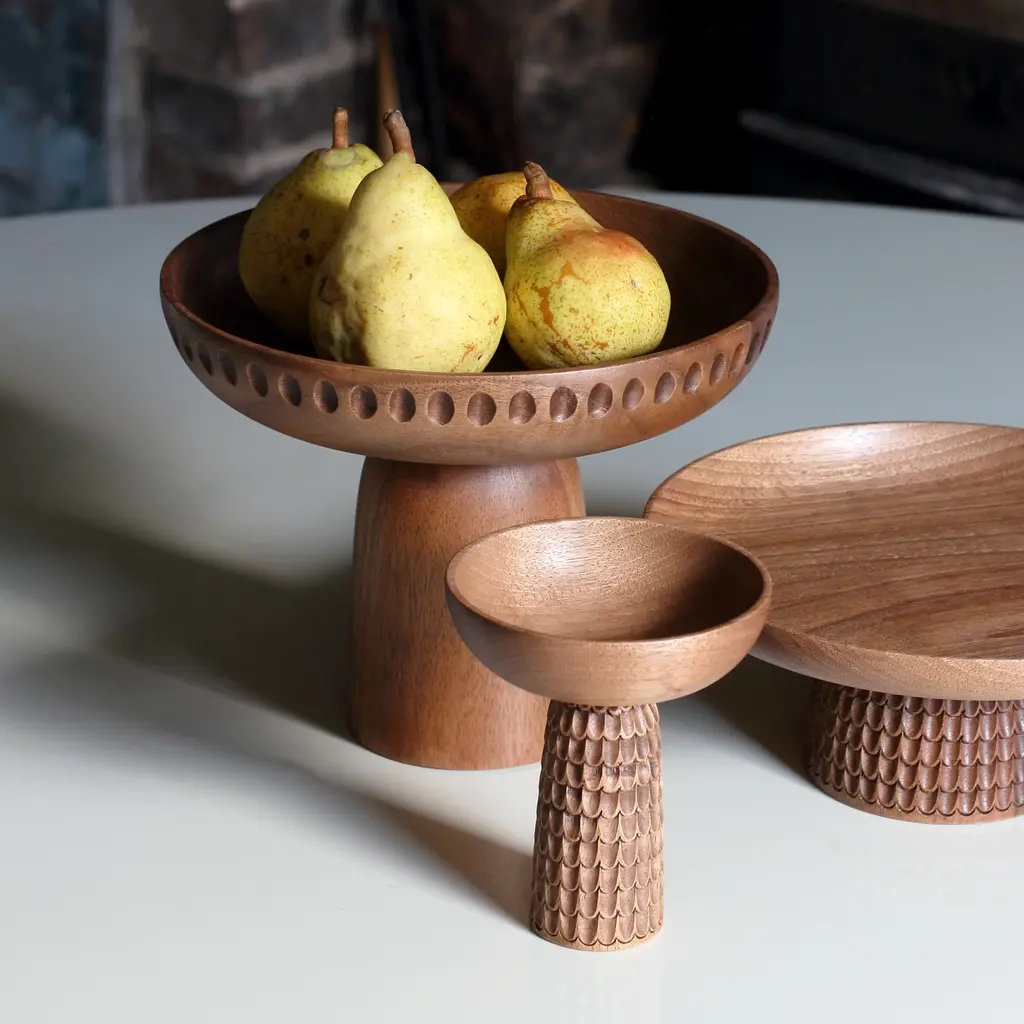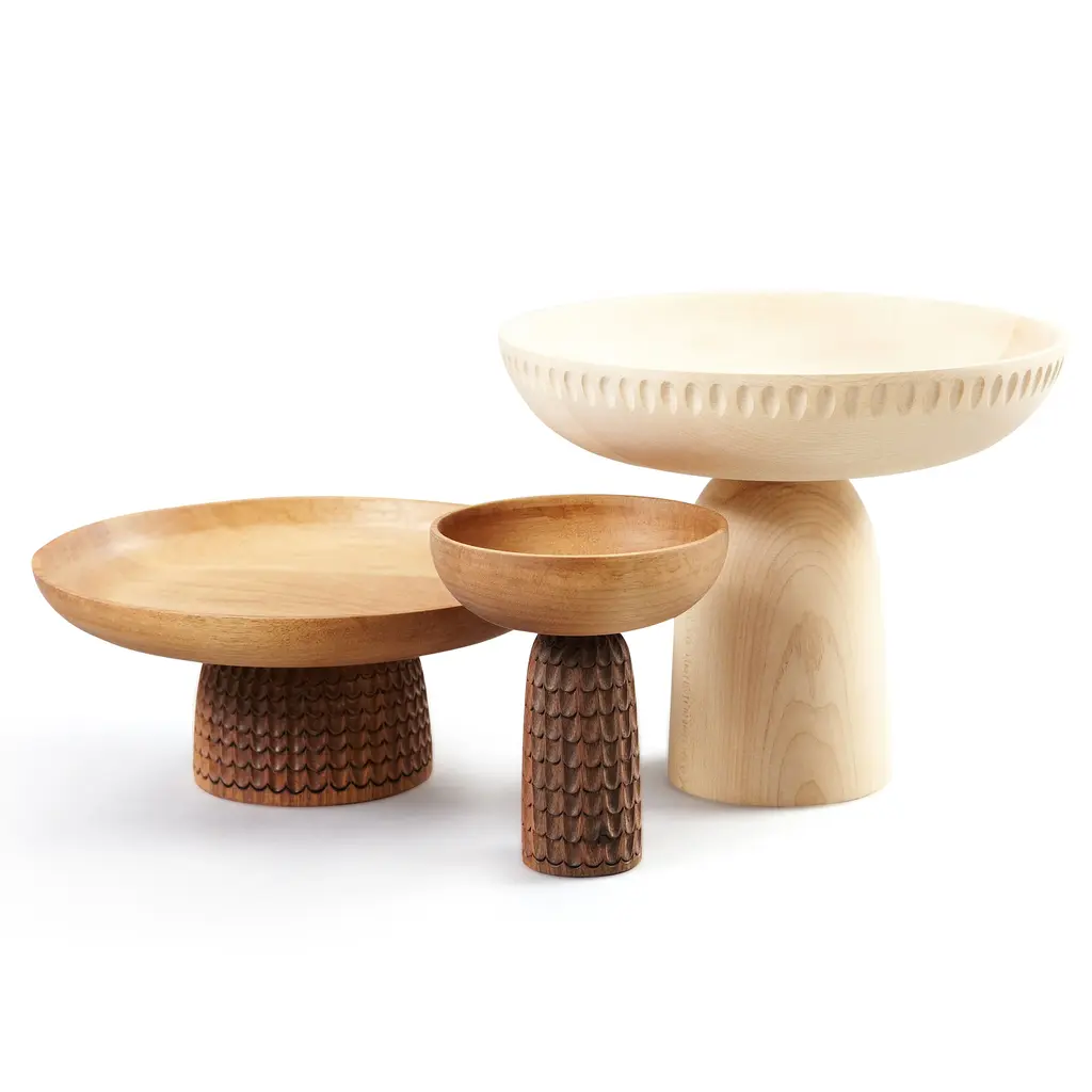 Nera’s exceptional run of footed solid-wood bowls embodies pleasing proportions, sculptural refinement and meticulously executed carving details. In 3 different sizes and a choice of natural and black-stained maple as well as walnut, they are hand-crafted by Zanat’s artisans from sustainably sourced timbers. The larger version features a custom choice of motifs surrounding the raised bowl while the medium and smaller versions have a standardized pattern incised at the base.
