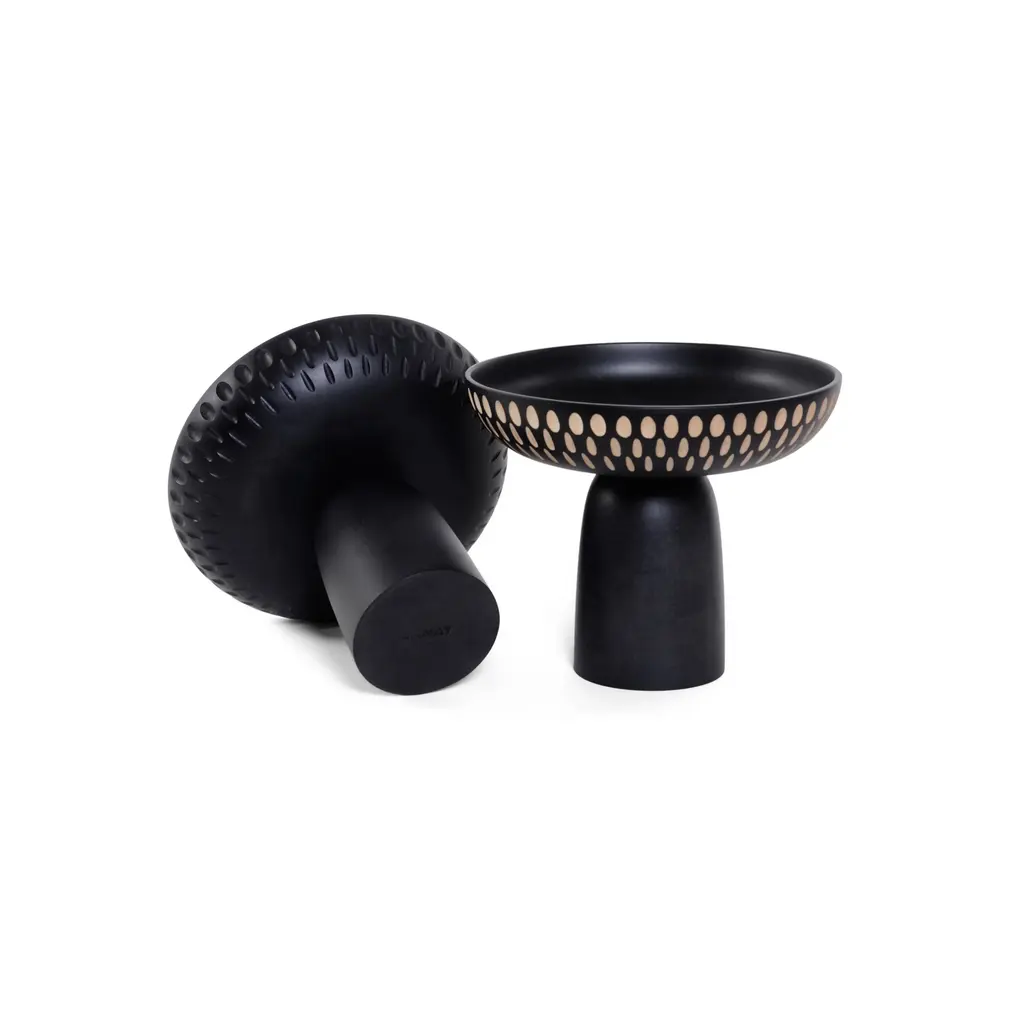 Nera’s exceptional run of footed solid-wood bowls embodies pleasing proportions, sculptural refinement and meticulously executed carving details. In 3 different sizes and a choice of natural and black-stained maple as well as walnut, they are hand-crafted by Zanat’s artisans from sustainably sourced timbers. The larger version features a custom choice of motifs surrounding the raised bowl while the medium and smaller versions have a standardized pattern incised at the base.