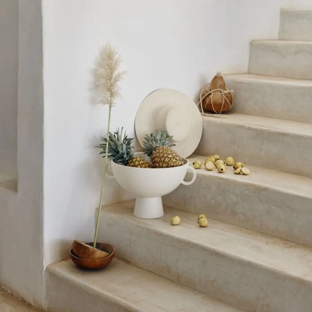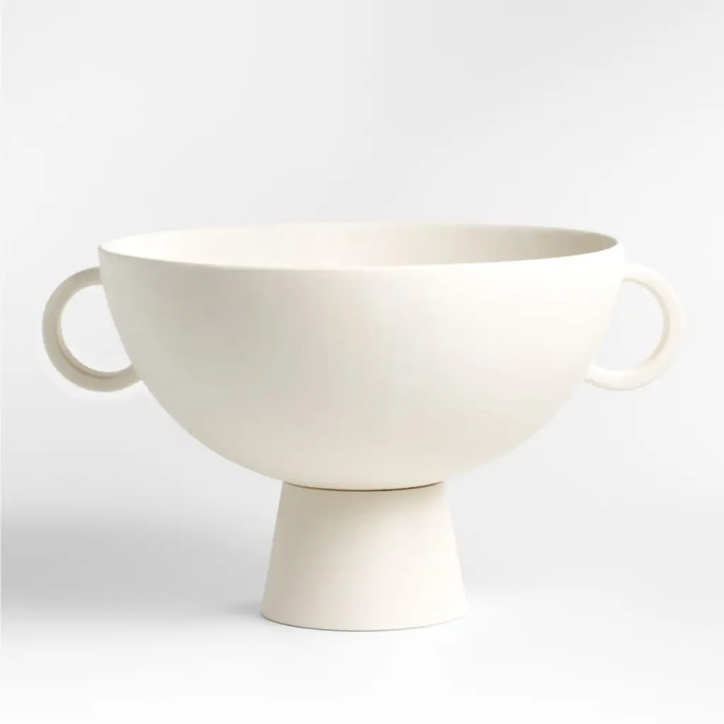Elevate pine cones, seashells and other seasonal bowl fillers and botanicals in our dramatically oversized Nerida centerpiece bowl. Perched upon a tapered base, the graceful bowl evokes the silhouette of a Roman drinking cup in earthenware glazed creamy white. Looped handles complete the soft geometry of the clean-curved bowl and invite you to reposition it beyond the dining table. Our Nerida white footed centerpiece bowl is a Crate & Barrel exclusive.