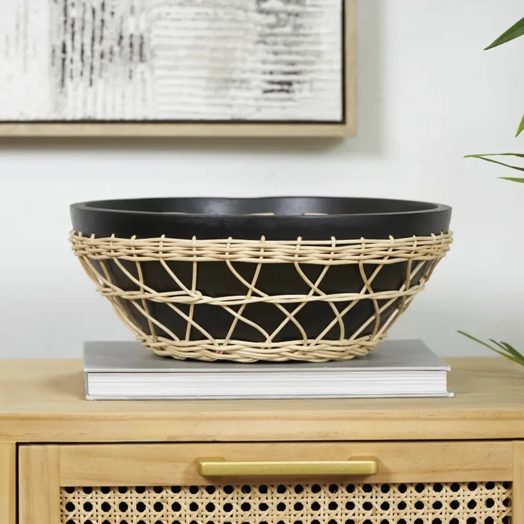 This bowl can be used to store small items or as a centerpiece for any room. This item ships in 1 carton. Please note that this item is for decorative purposes only and is not food safe. Mango wood decorative bowl makes a great gift for any occasion. Due to the handmade nature of this item, no two will be alike, there will be slight differences in shape, size, and color. Suitable for indoor use only. This item ships fully assembled in one piece. Made in India. This is a single black colored display bowl. Bohemian style.
