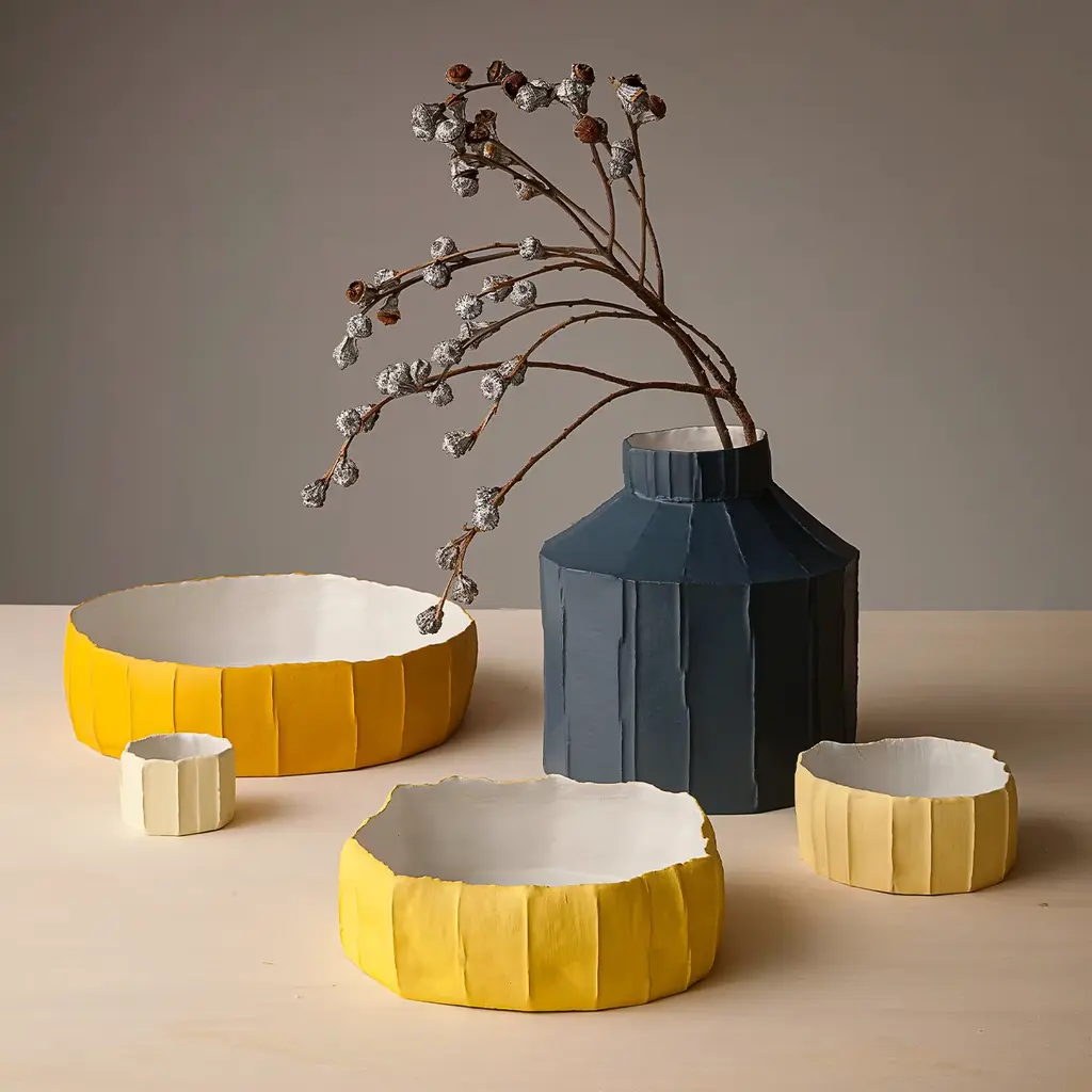Every one of Paola Paronetto’s creations is unique. Slight variations in shape, colour and size are to be considered a guarantee of authenticity and value. They are finished with non-toxic satin-finish enamels. Although very rarely, it is possible for them to leak after long periods of exposure to water. It is therefore advisable to test their water resistance before using them on delicate surfaces. They should not be used as dining utensils. The white pieces can be washed with water or sanitizing products, whereas the coloured pieces must be treated more gently and cleaned with a feather duster or a soft cloth, dry or moistened very slightly with water.