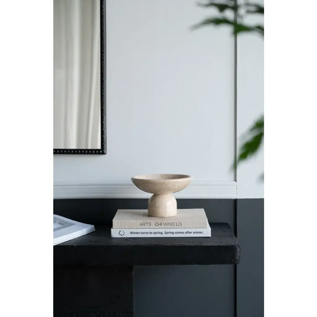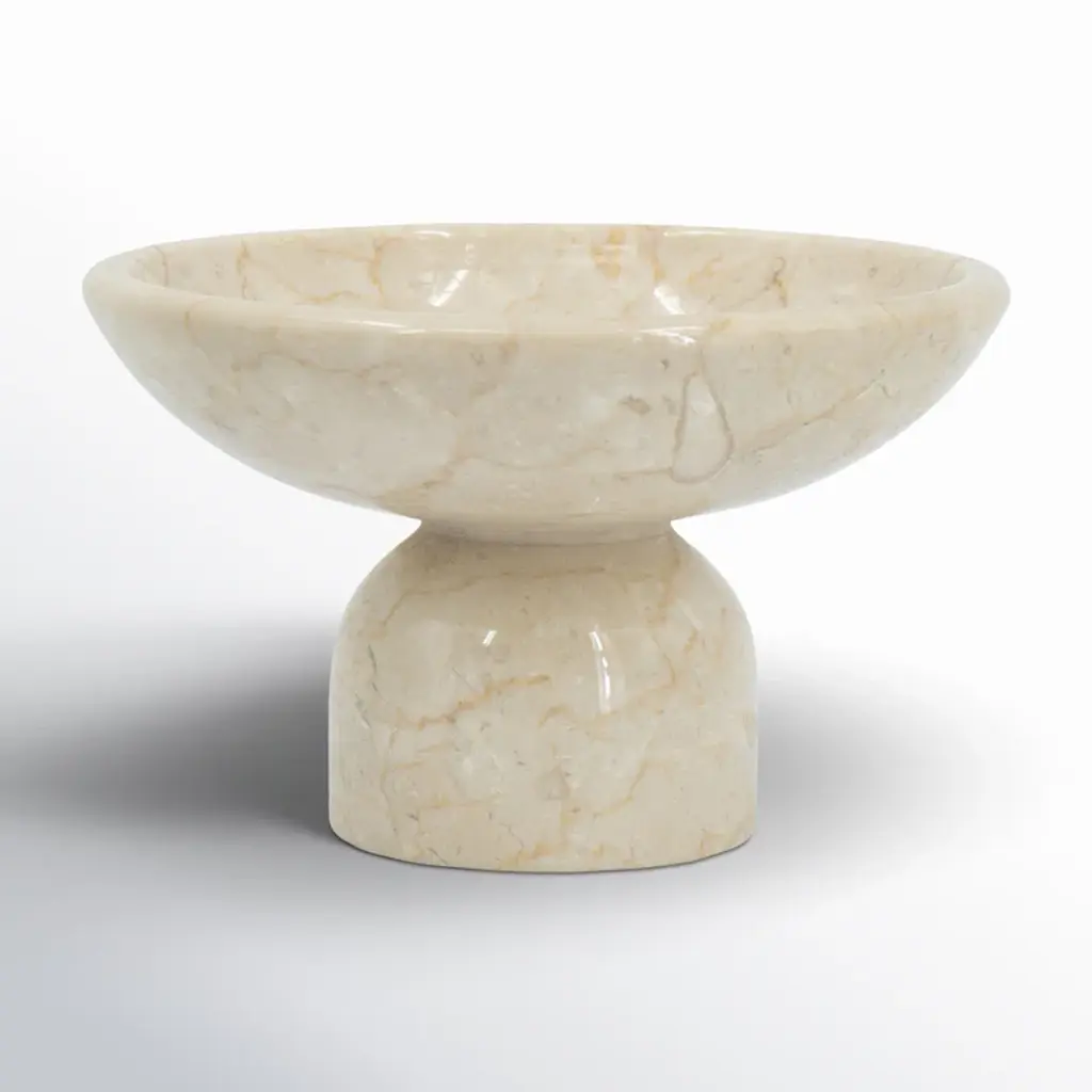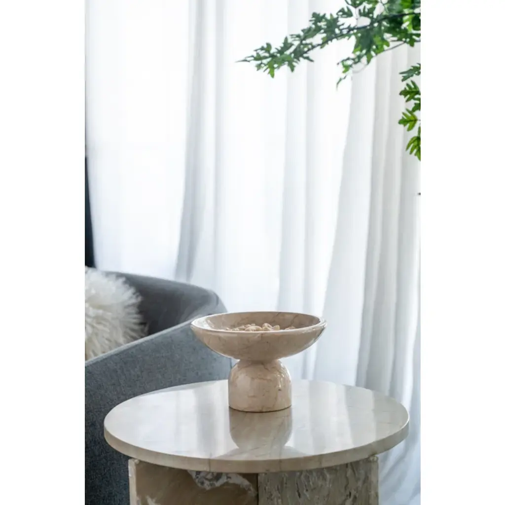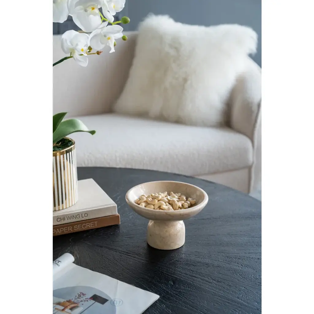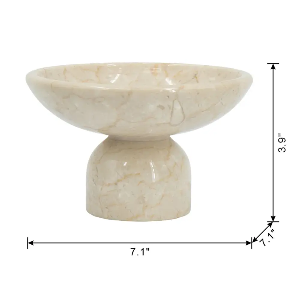 Organic modern style meets natural charm in this decorative accent bowl. Crafted from 100% premium marble and finished in an alluring cream hue, this piece boasts a smooth, spacious dish atop a round pedestal base. As versatile as it is eye-catching, this bowl could be used to display fruit, and colorful decor pieces, or it could even thrive on its own as part of a creative ensemble.