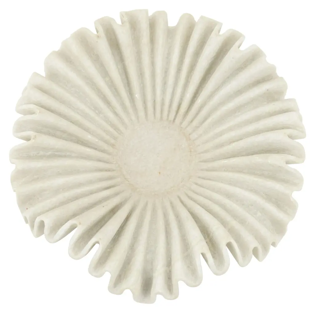 Simple and sculptural, our Norah Bowl is a practical work of art. This vintage-inspired dish is hand-carved from a solid block of white marble with delicate swirls of grey veining. Norah’s elegant, ruffled edges give it a light, fluid feel, which contrasts nicely with its weighty, natural stone material. Beautifully functional filled with fruits or vegetables on the kitchen counter, Norah is also perfect as a sophisticated centerpiece, especially when filled with an arrangement of feather moss and cut echeveria. •white marble •hand carved •food safe for dry foods only •hand wash•each is unique Dimensions •15" diameter x 6"H