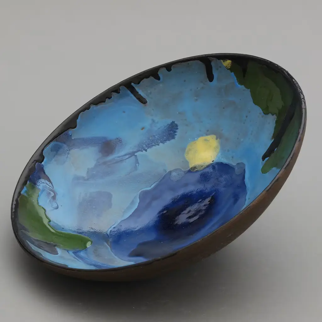 This superb, one-of-a-kind ceramic bowl handcrafted by master ceramist Pier Paolo Garavini is a tableware take on the leitmotiv of futurist cities envisioned by designer Ennio Nonni. The opaque, dark tone of the exterior - representing the profile of a built-in area - overflows with subtle droplets onto the majolica interior, where an imaginary sky in different shades of blue is enlivened by a bright, yellow sun.
