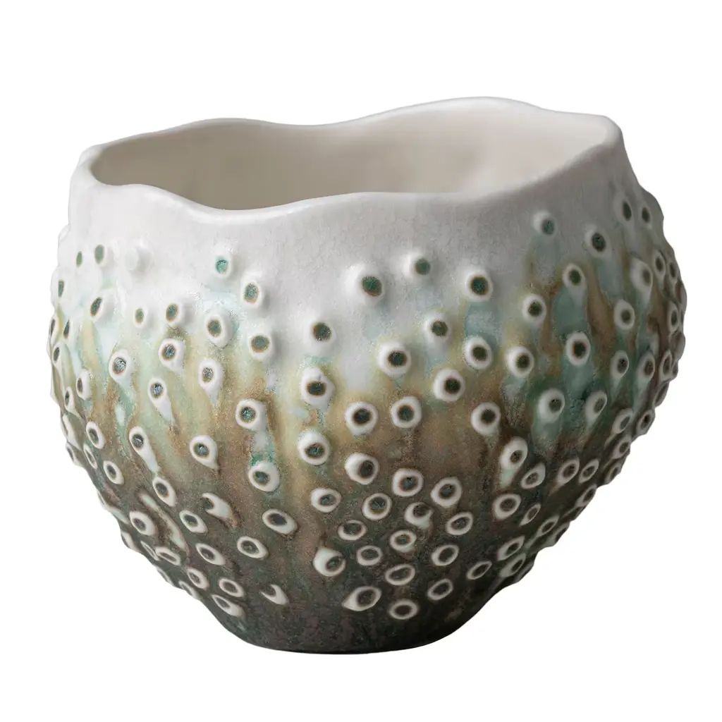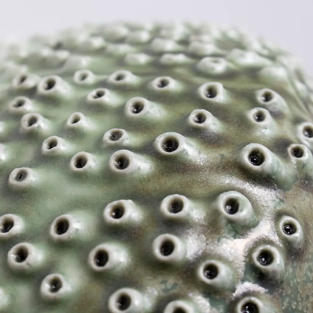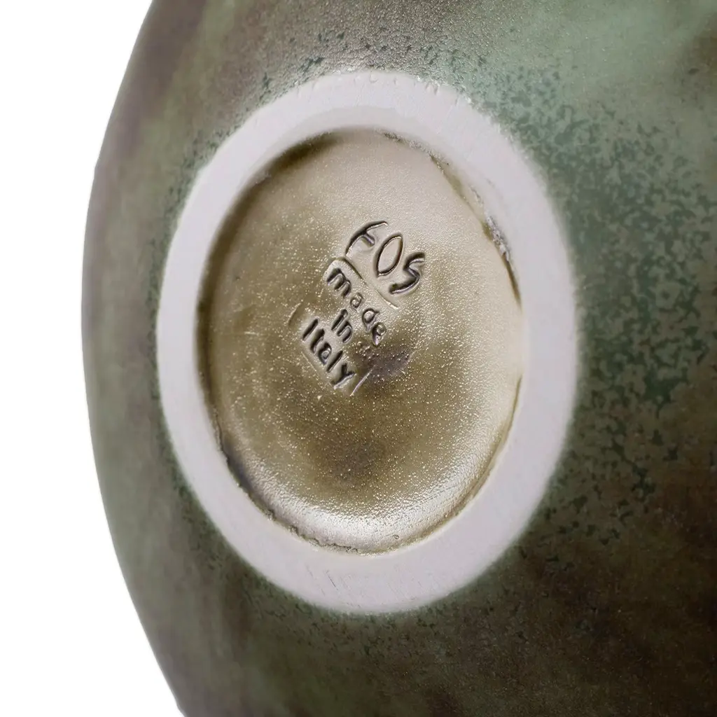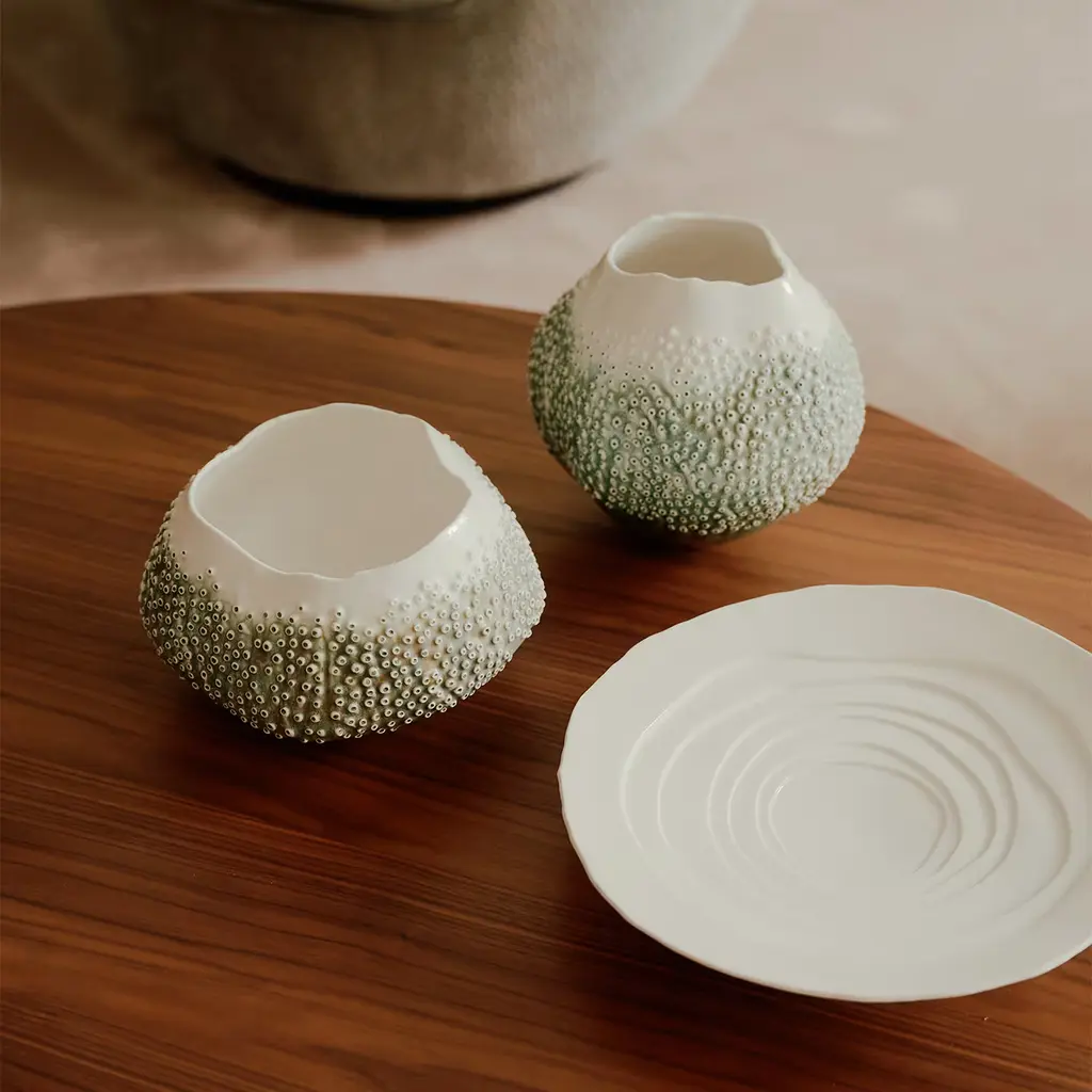 Oceano is a porcelain bowl, part of the Porifera Collection, a hymn to the beauty of the marine world, with a myriad of tiny holes. The texture, inspired by corals, celebrates the Ocean, astonishing for the exotic shapes of its creatures. Each object is decorated with metal oxides, creating a multitude of green shades that are always different, streaked with crystallizations that light up the tones and alternate matt and glossy surfaces. Unique piece, result of a balance between art and craft.