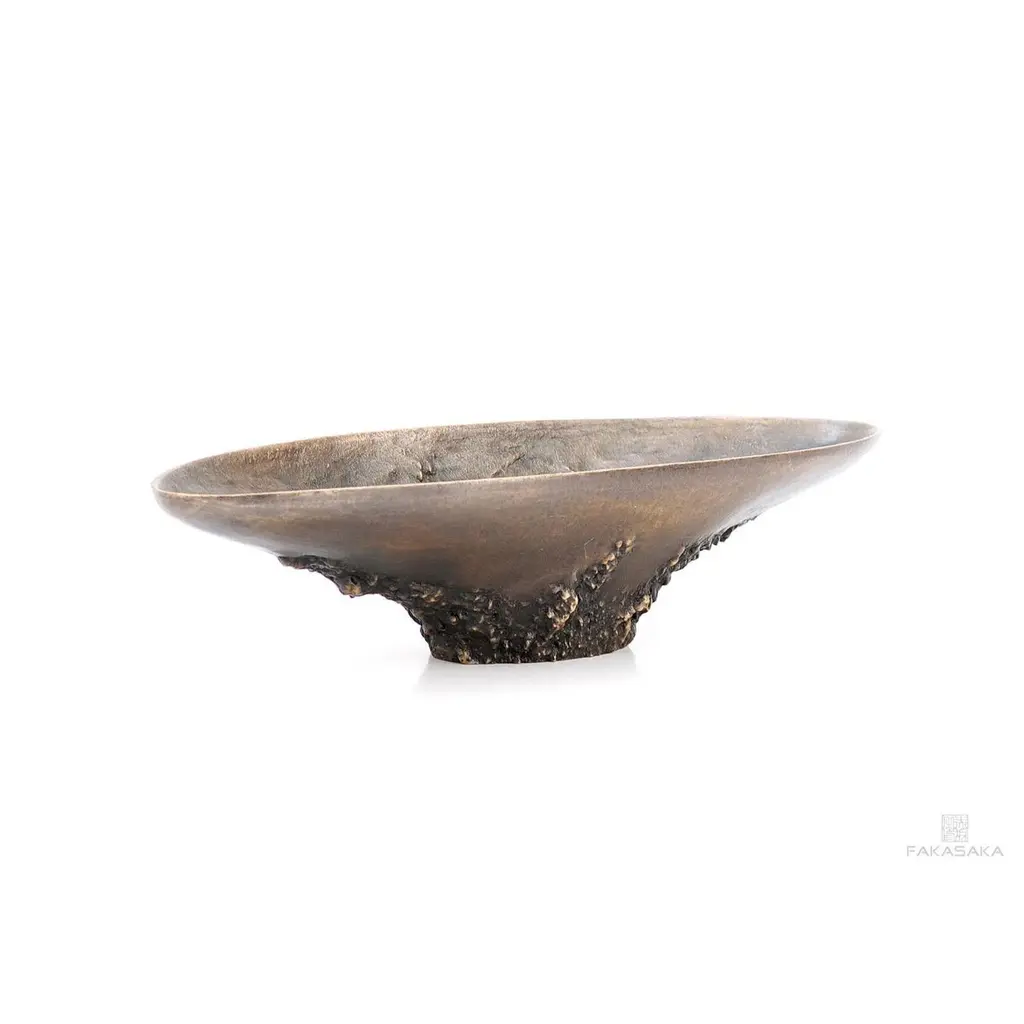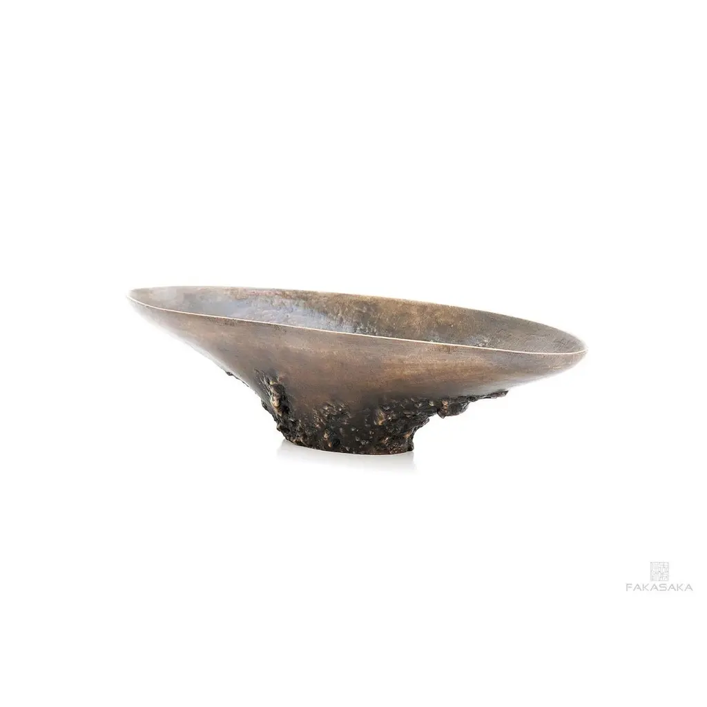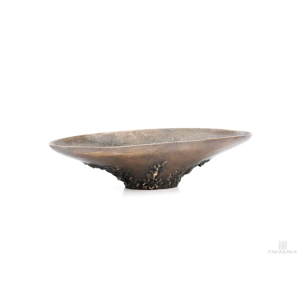 O'Connor bowl by Fakasaka DesignDimensions: W 41.5 cm D 16 cm H 9.5 cm.Materials: dark bronze. FAKASAKA is a design company focused on production of high-end furniture, lighting, decorative objects, jewels, and accessories.Established in 2007, Fakasaka is the eponymous design company by Brazilian artist Fernando Akasaka distinguished by a penchant for producing intricate detailed cast bronze collectible design objects, furniture and jewelries. Fakasaka explores the contrast between the manmade and the natural through shapes and finishes that create a clear aesthetic. The constant challenge to balance elements is met with an outcome that is a striking assortment of bronze furniture and objects in oxidised and polished finishes, accented with precious regional stones, granites and rich prehistoric reptilian motifs.