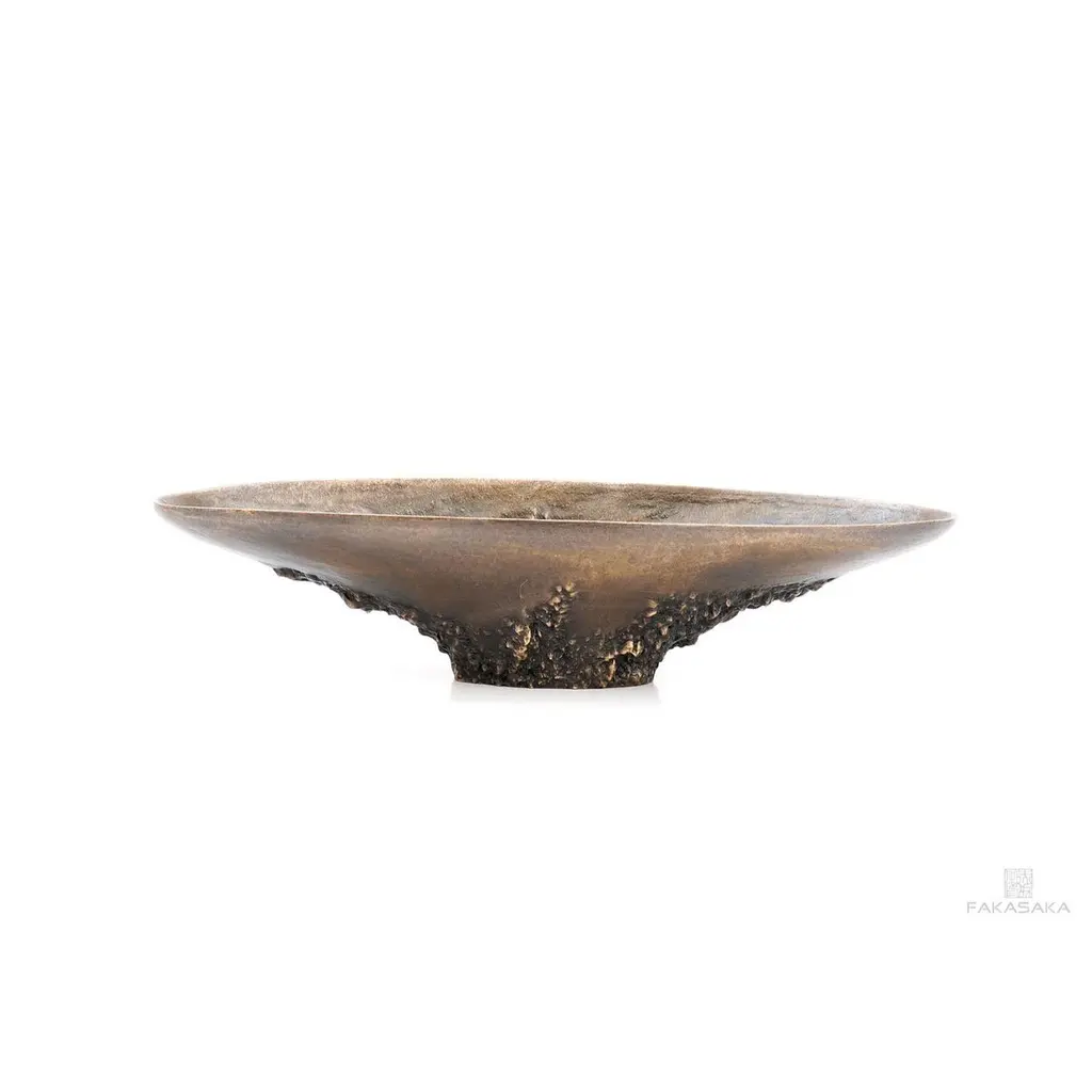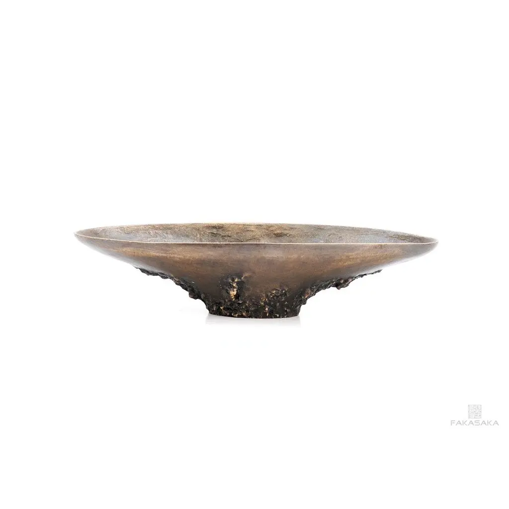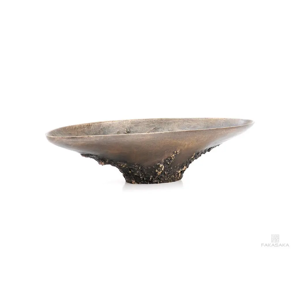 O'Connor bowl by Fakasaka DesignDimensions: W 41.5 cm D 16 cm H 9.5 cm.Materials: dark bronze. FAKASAKA is a design company focused on production of high-end furniture, lighting, decorative objects, jewels, and accessories.Established in 2007, Fakasaka is the eponymous design company by Brazilian artist Fernando Akasaka distinguished by a penchant for producing intricate detailed cast bronze collectible design objects, furniture and jewelries. Fakasaka explores the contrast between the manmade and the natural through shapes and finishes that create a clear aesthetic. The constant challenge to balance elements is met with an outcome that is a striking assortment of bronze furniture and objects in oxidised and polished finishes, accented with precious regional stones, granites and rich prehistoric reptilian motifs.