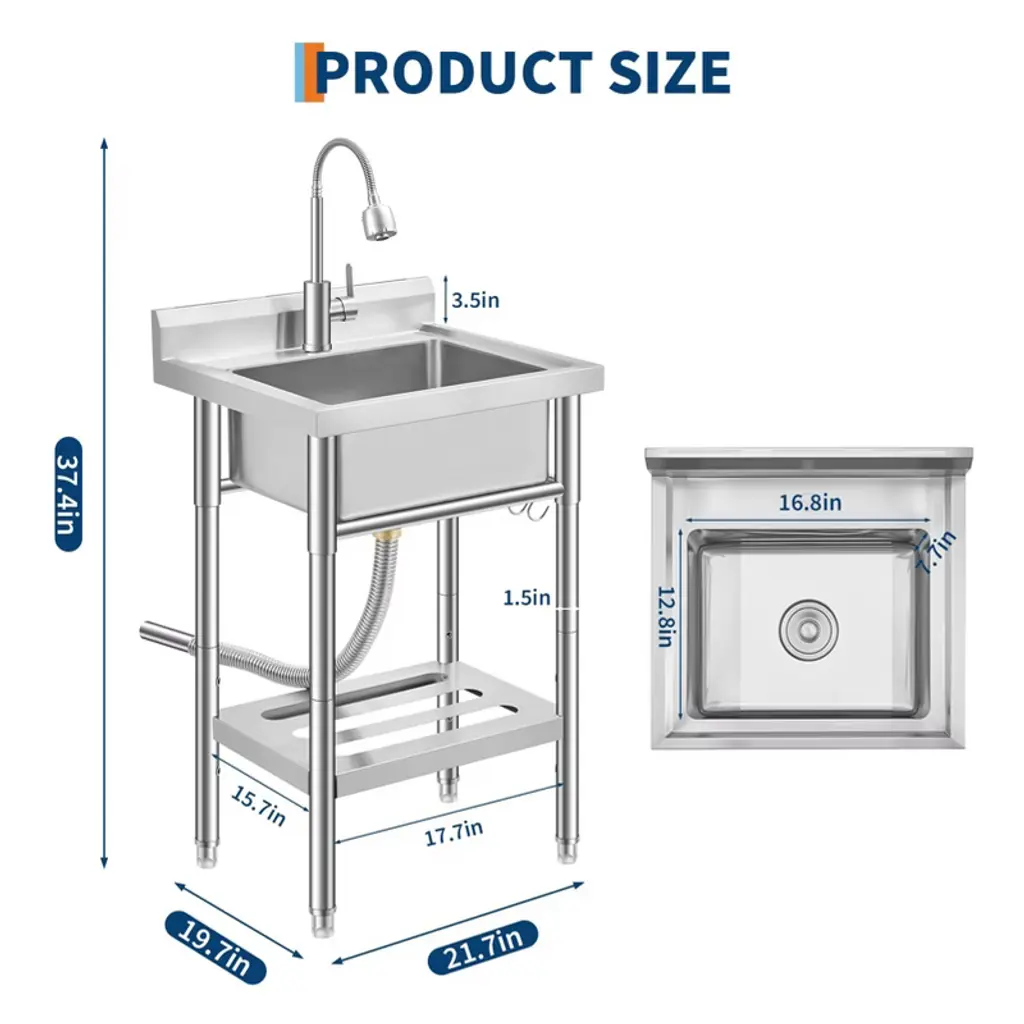 【Durable Stainless Steel Utility Sink】 Crafted from a heavy-duty 201 stainless steel frame with a 0.8mm thick 304 stainless steel bowl, this freestanding utility sink offers excellent rust resistance and load-bearing strength. Ideal as a commercial sink for kitchen, garage, farmhouse, or outdoor utility use