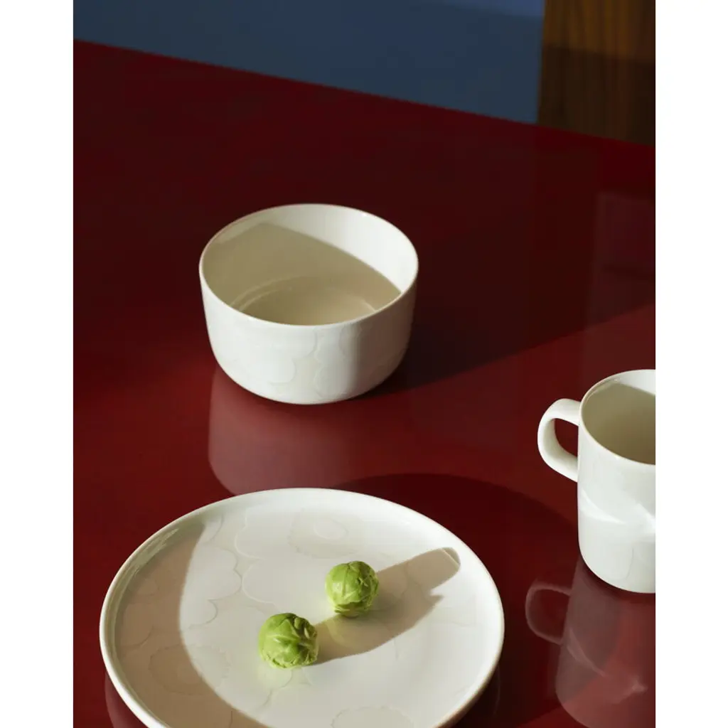 Marimekko’s Unikko bowl features Maija Isola’s iconic floral pattern in natural white hues. The size is ideal for soup, porridge or a larger serving of breakfast cereal. The ceramic bowl is part of the Oiva tableware range, designed by Sami Ruotsalainen, and is easily combinable with monochrome dishware as well as other Marimekko patterns. Why not collect a whole range of Unikkos in different colors? The instantly recognizable Unikko pattern came about in 1964 after Armi Ratia, the founder of Marimekko, had announced in public that no floral fabrics would be made at Marimekko. However, textile designer Maija Isola was not one for rules or restrictions – in protest, she designed a complete collection of bold floral patterns. One of them was named Unikko, Finnish for ”poppy”, and it quickly became a favorite of Ratia, as well. Today, Unikko is one of Marimekko’s best-known patterns, and it adorns a variety of objects from fabrics and bed linen to Sami Ruotsalainen’s clean-lined Oiva tableware collection.