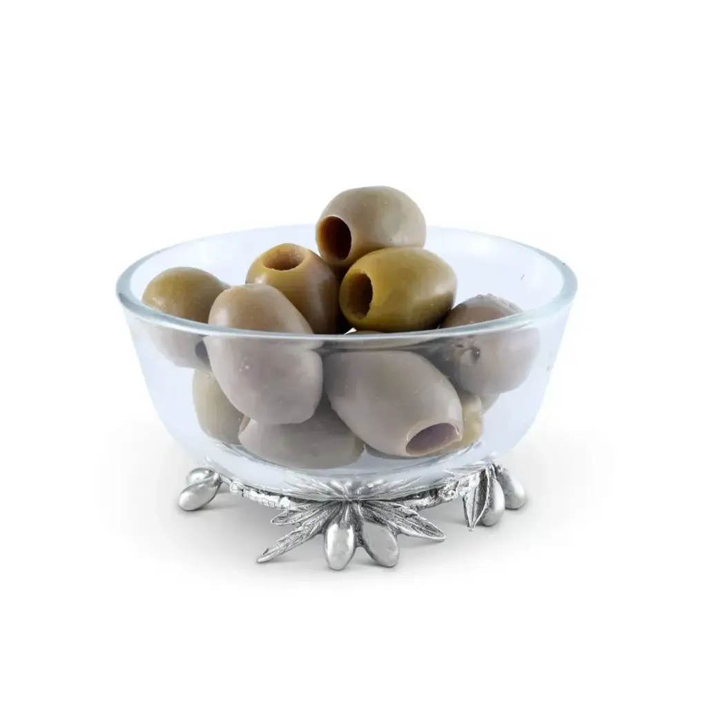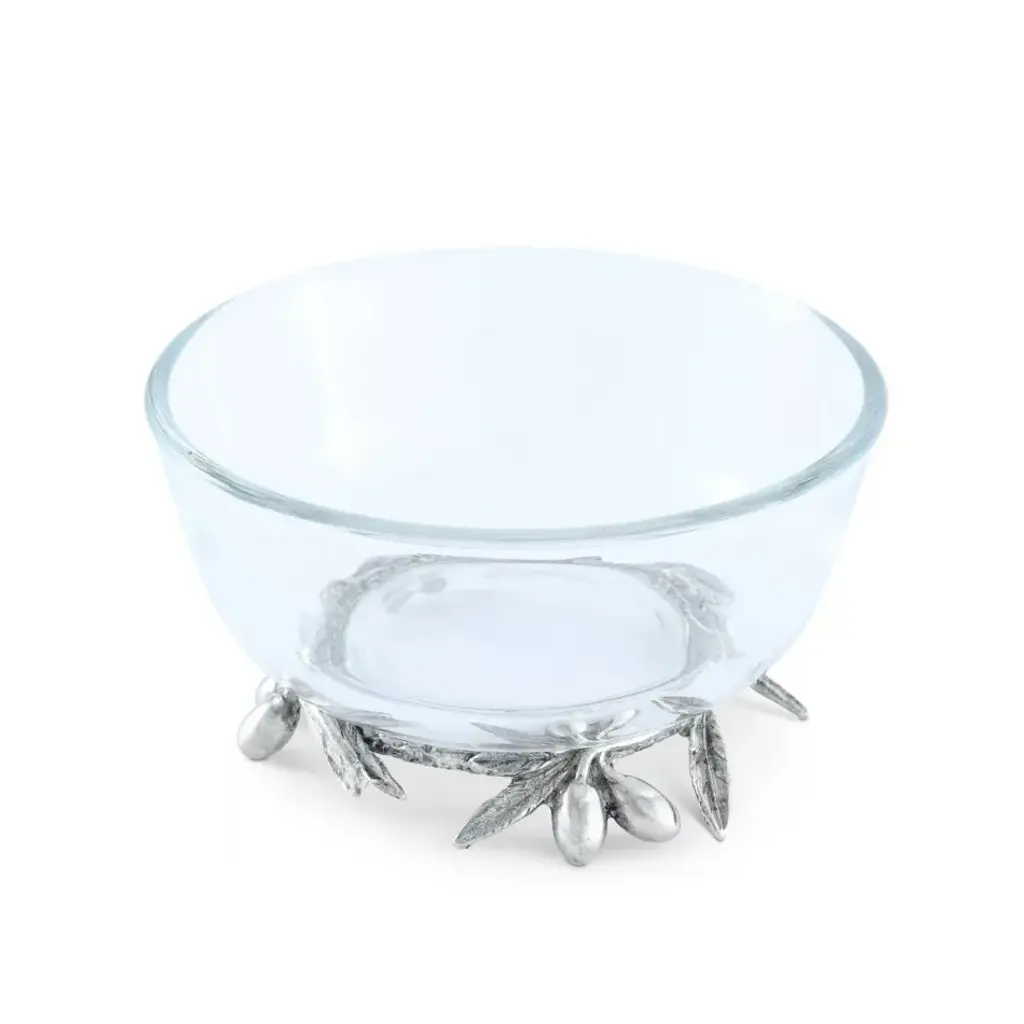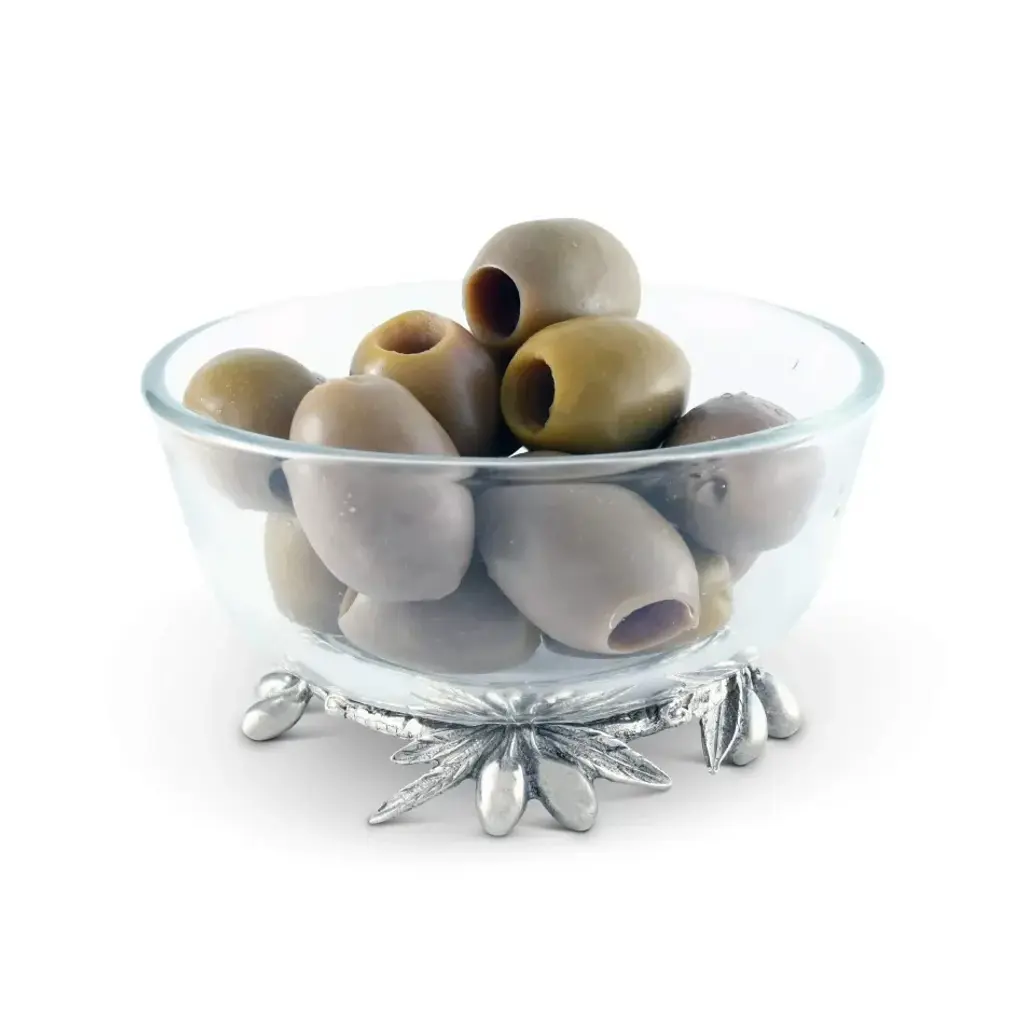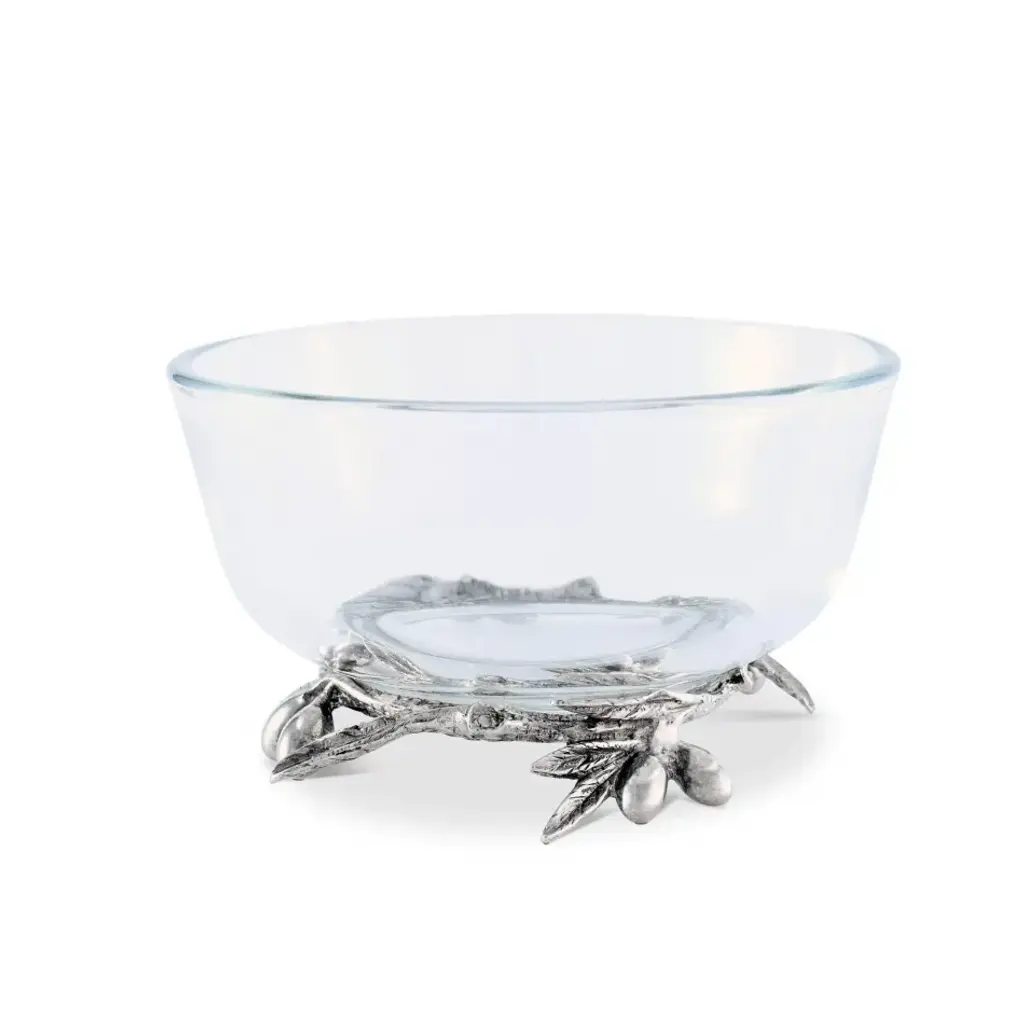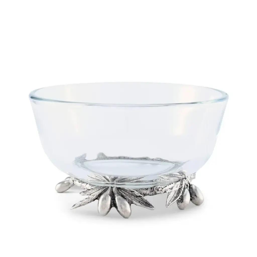 Vagabond House's Olive Grove Pewter Footed Dip Bowl features a clear, glass bowl with slightly rounded sides resting upon an exquisitely detailed, pewter olive wreath. Double clusters of olives form the feet of the bowl. Vagabond House is a family-owned American company specializing in fine pewter tableware, servingware and giftware. Largely inspired by nature, their exclusive products are designed to be unique, functional heirlooms for those who seek to express tradition and style in both family and formal entertaining.