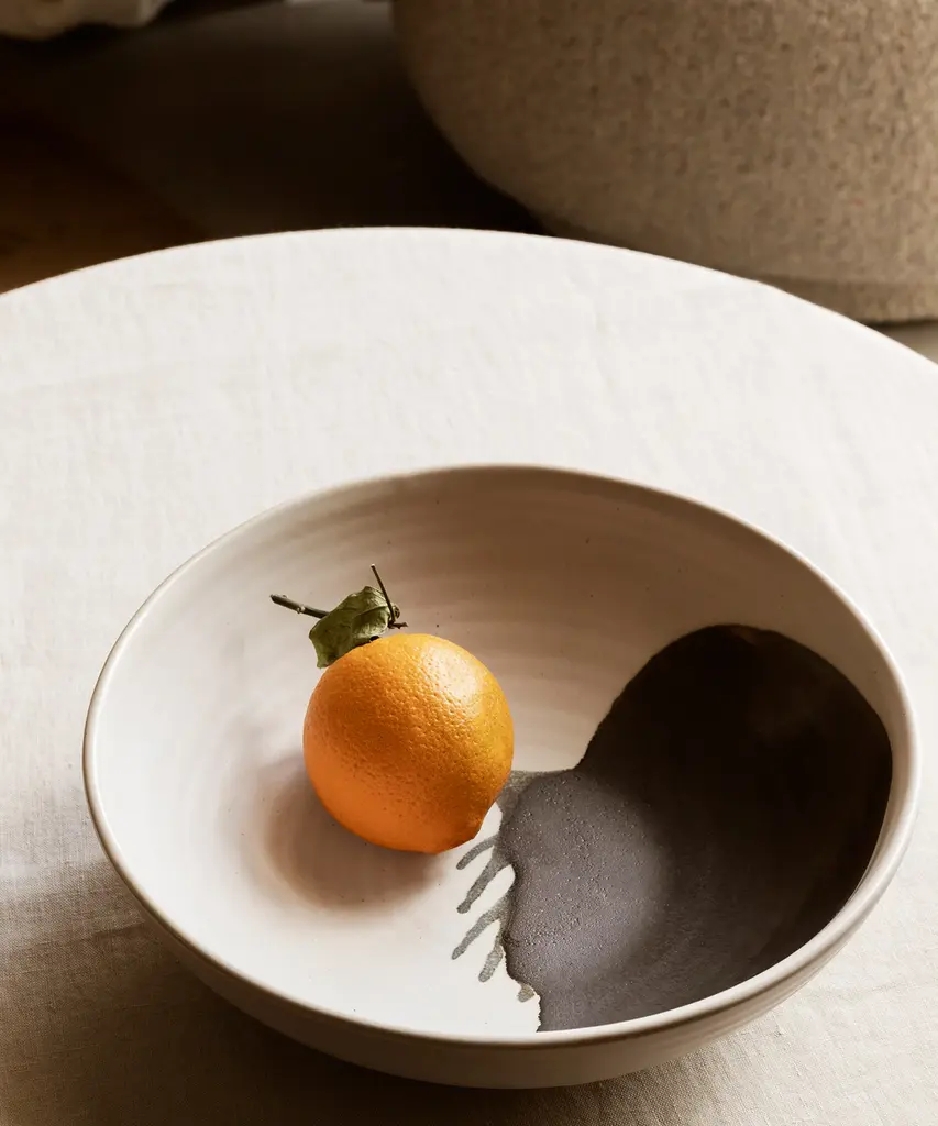 A reflection of the craftsmanship that goes into the production of this bowl, Omhu is the Danish word for making an effort. Each bowl is made from stoneware and features a unique, colored splash pattern, which has been added by hand. Let the Omhu Bowl serve as the perfect canvas for thoughtful, homemade meals while adding an artistic element to your table setting. Designed and produced by the Copenhagen-based studio Ferm Living.