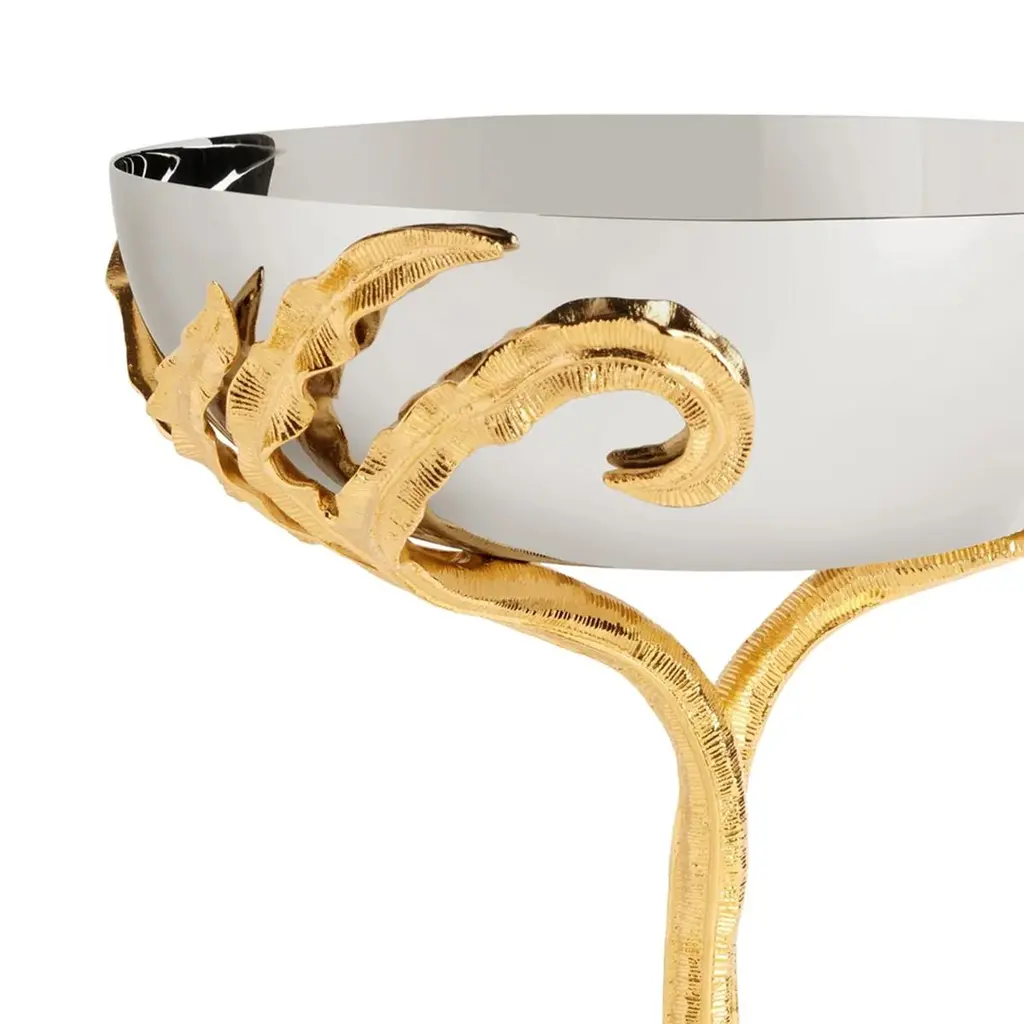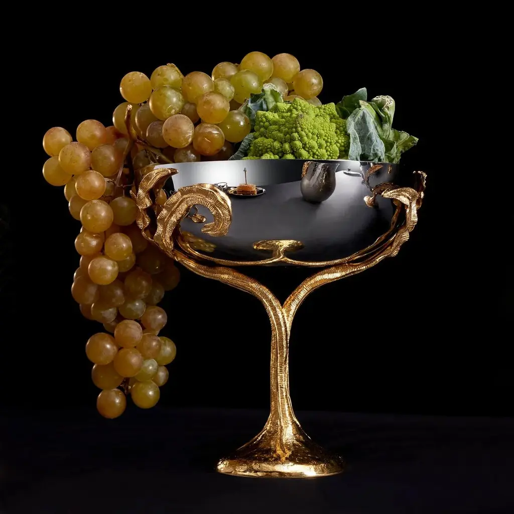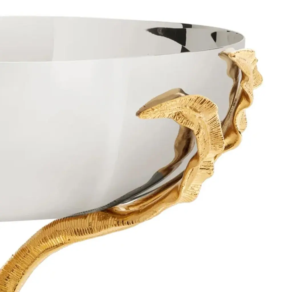 Bowl on Stand Ondulated Leaves with all structure in forged stainless steel. Whit 24k gold plated details.Also available on request in Ondulated Leaves Pitcher, or in Ondulated Leaves Champagne Cooler, or in Ondulated Leaves Bowl.