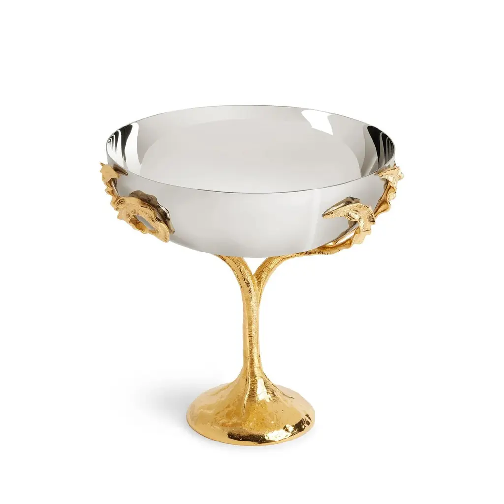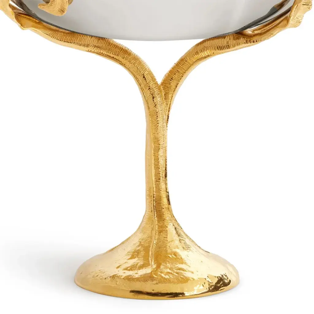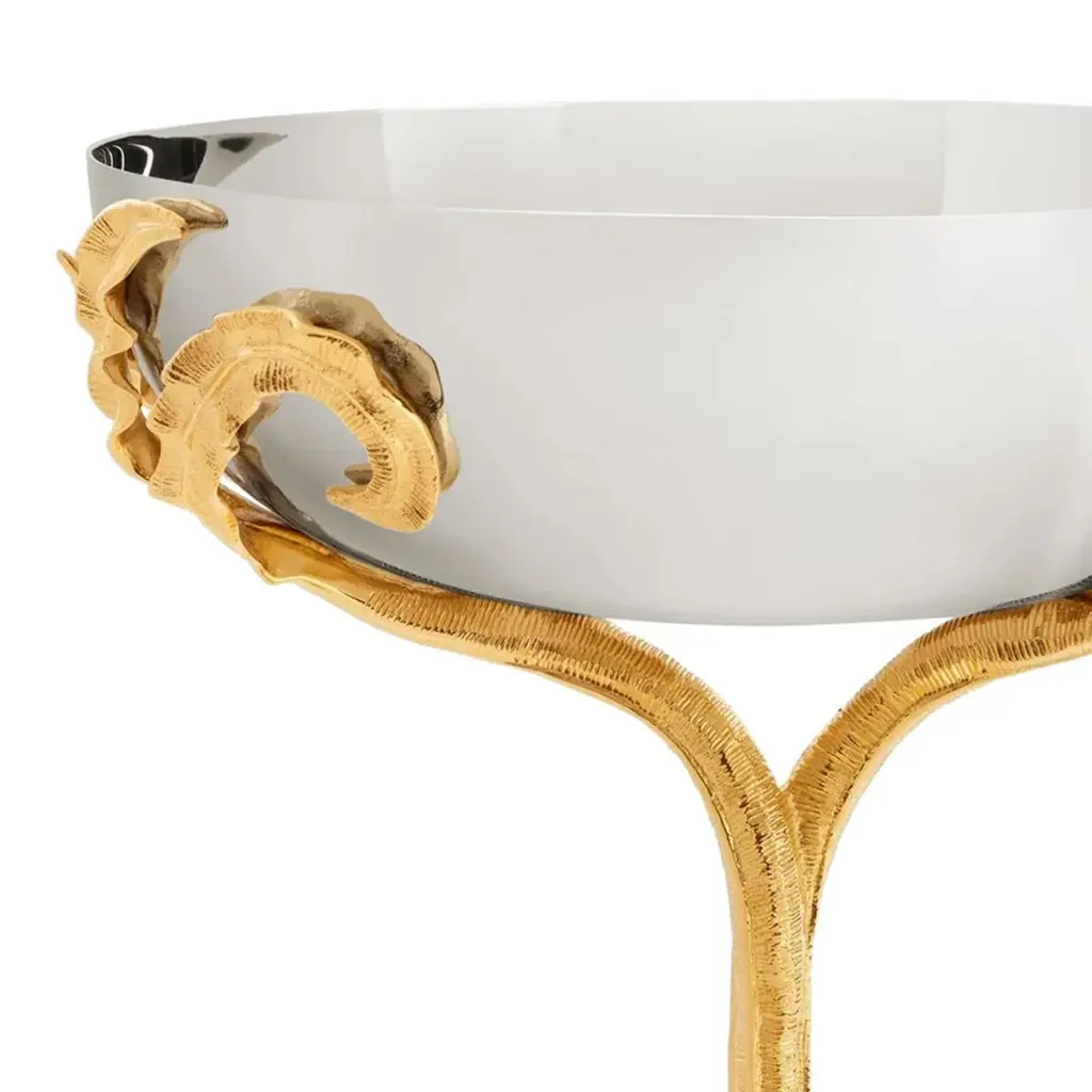 Bowl on Stand Ondulated Leaves with all structure in forged stainless steel. Whit 24k gold plated details.Also available on request in Ondulated Leaves Pitcher, or in Ondulated Leaves Champagne Cooler, or in Ondulated Leaves Bowl.