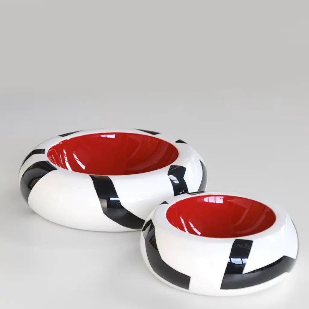 Offered in an intriguing chromatic combination of white, black, and red, this lacquered wooden bowl makes for a stylish addition to contemporary decors. Dynamic black lines emerge neat against the bulging white profiles, while the concave interior flaunts a vibrant red tone. A smaller version measuring 20cm in diameter is also available, please contact the Concierge for pricing.