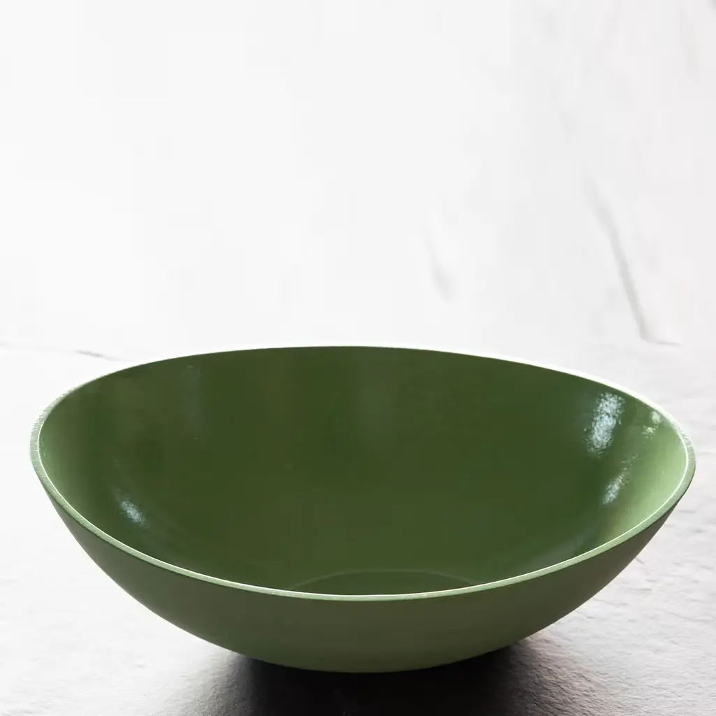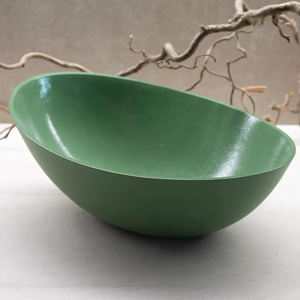 A stunning objet d'art that melds organic form with contemporary minimalism, Sergio Basso's bowl captivates with its exquisite juxtaposition of finishes. With its glossy interior and matte exterior in a captivating green hue, this bowl is a testament to timeless design. Available in white, light and dark gray, deep pink, plum, lilac, deep and light Tiffany, mint, cognac, cayenne, avion, light blue, peach fuzz, and vibrant green. Available in two sizes: 30.5 x 21.5 x 12cm or 24 x 17 x 8.5cm.