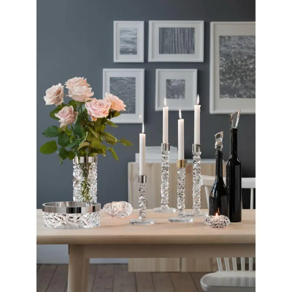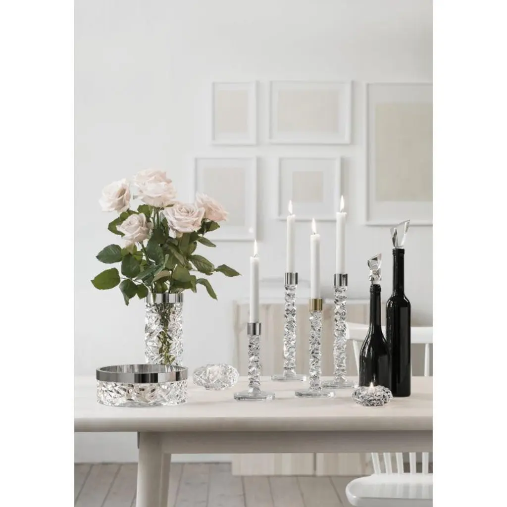 The Carat collection is based on a contemporary interpretation of the traditional cut glass for which Orrefors is world-renowned. The irregular geometry produces beautiful reflections of light in the crystal bowl and provides a clear contrast to the polished metal rim at the top. Designed by Lena Bergström.