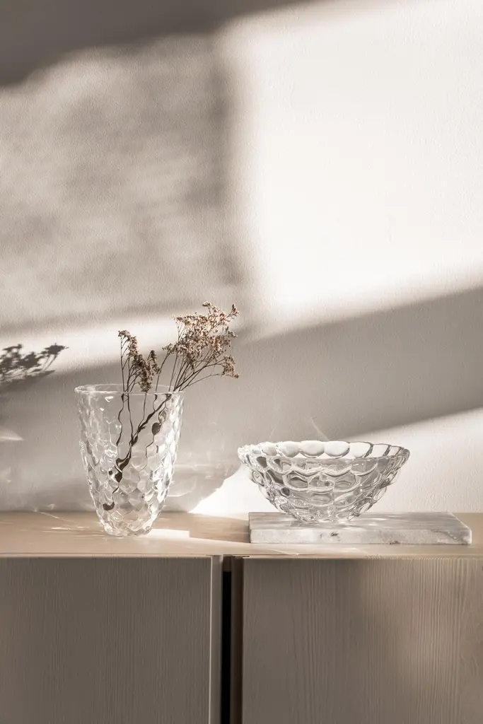 Raspberry is a beloved Orrefors classic. The large bowl in clear crystal has a design resembling a raspberry with its round ‘drupelets’ giving it a soft look. It is ideal for serving side dishes, such as salads, or simply as a decorative object on its own. Designed by Anne Nilsson.