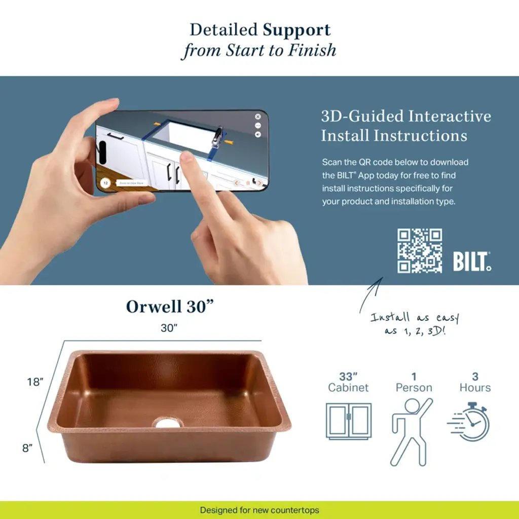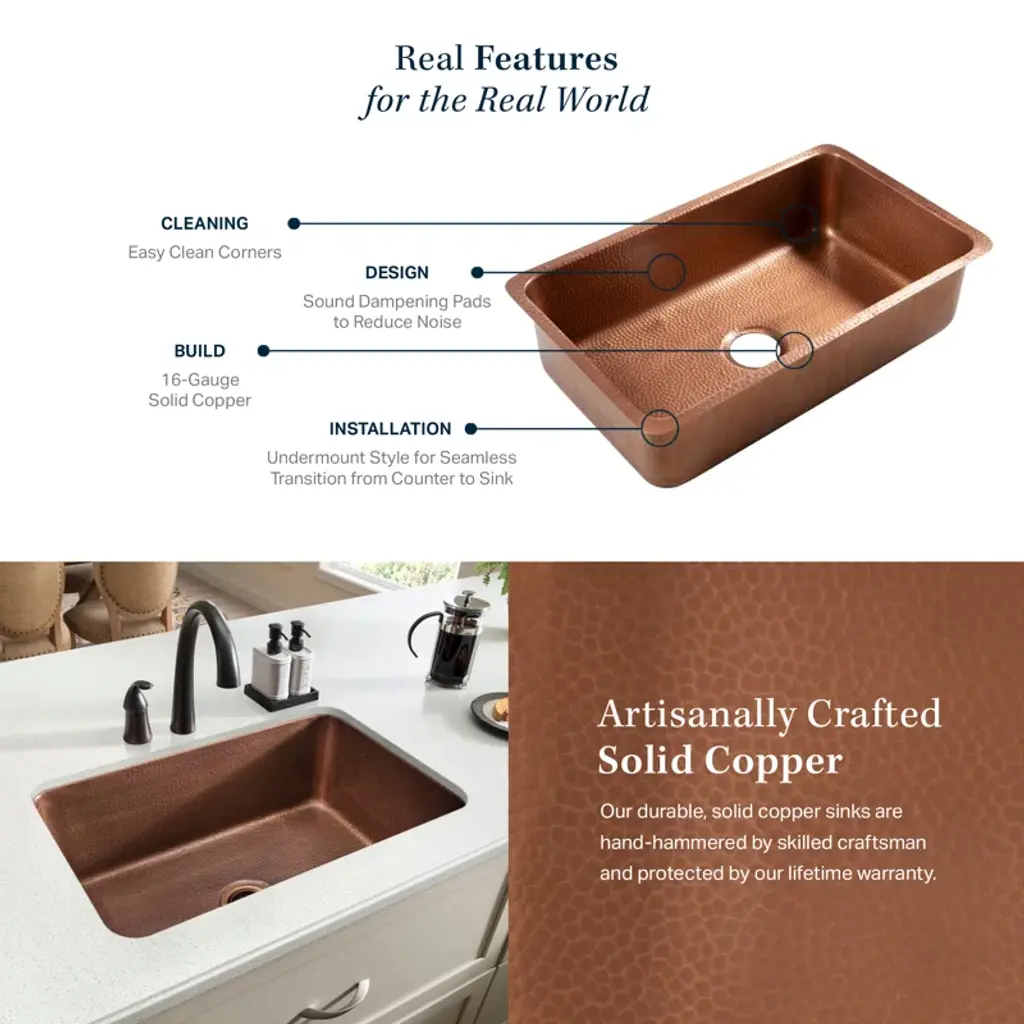 When it comes to cleaning your kitchen, you want it to be as easy as possible. The Orwell undermount copper kitchen sink makes cleaning up easy - ensuring crumbs and moisture go in the sink, not in a seam. The single bowl design allows maximum workspace for cleaning bulky or oversized dishes. Our durable, solid copper sinks are hand-hammered by skilled craftsmen.
