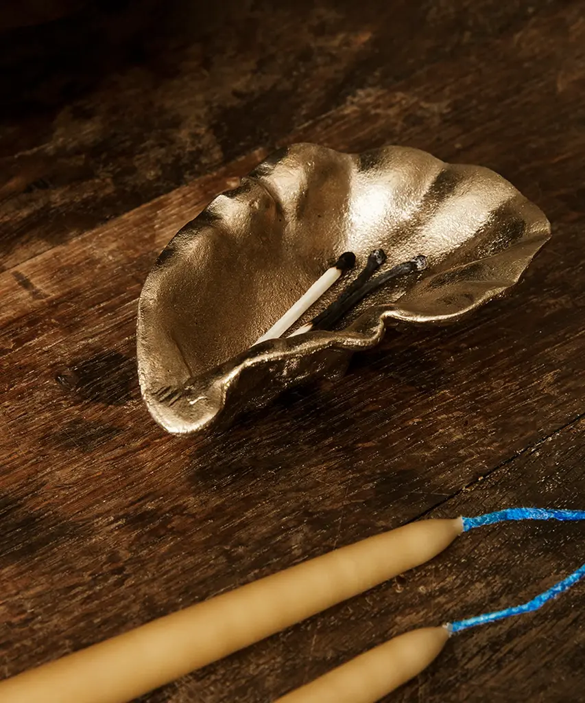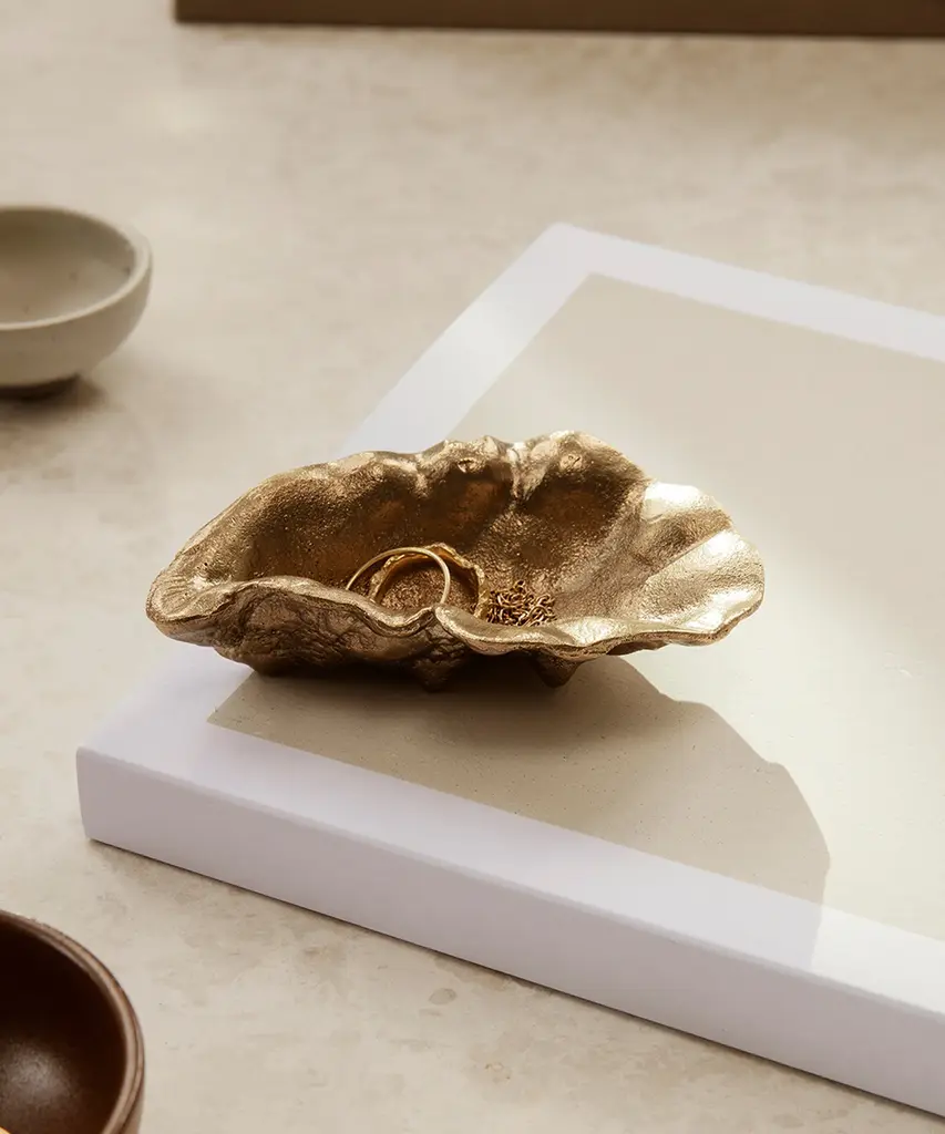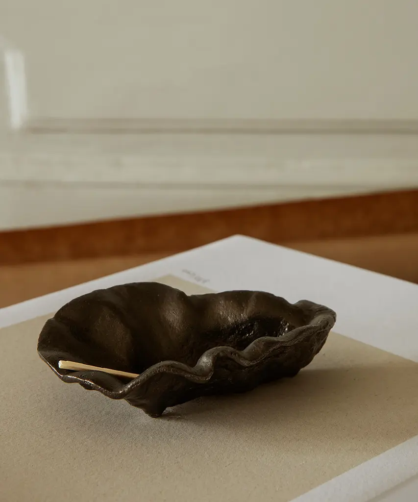 Originally cast from a real oyster shell, this elegant little bowl is a decorative place to store burnt matches, jewelry, or other precious little knick-knacks. Beautifully detailed and made from 100% brass, the solid metal presents a lovely contrast to the bowl's natural, organic form. Designed and produced by the Copenhagen-based studio Ferm Living.
