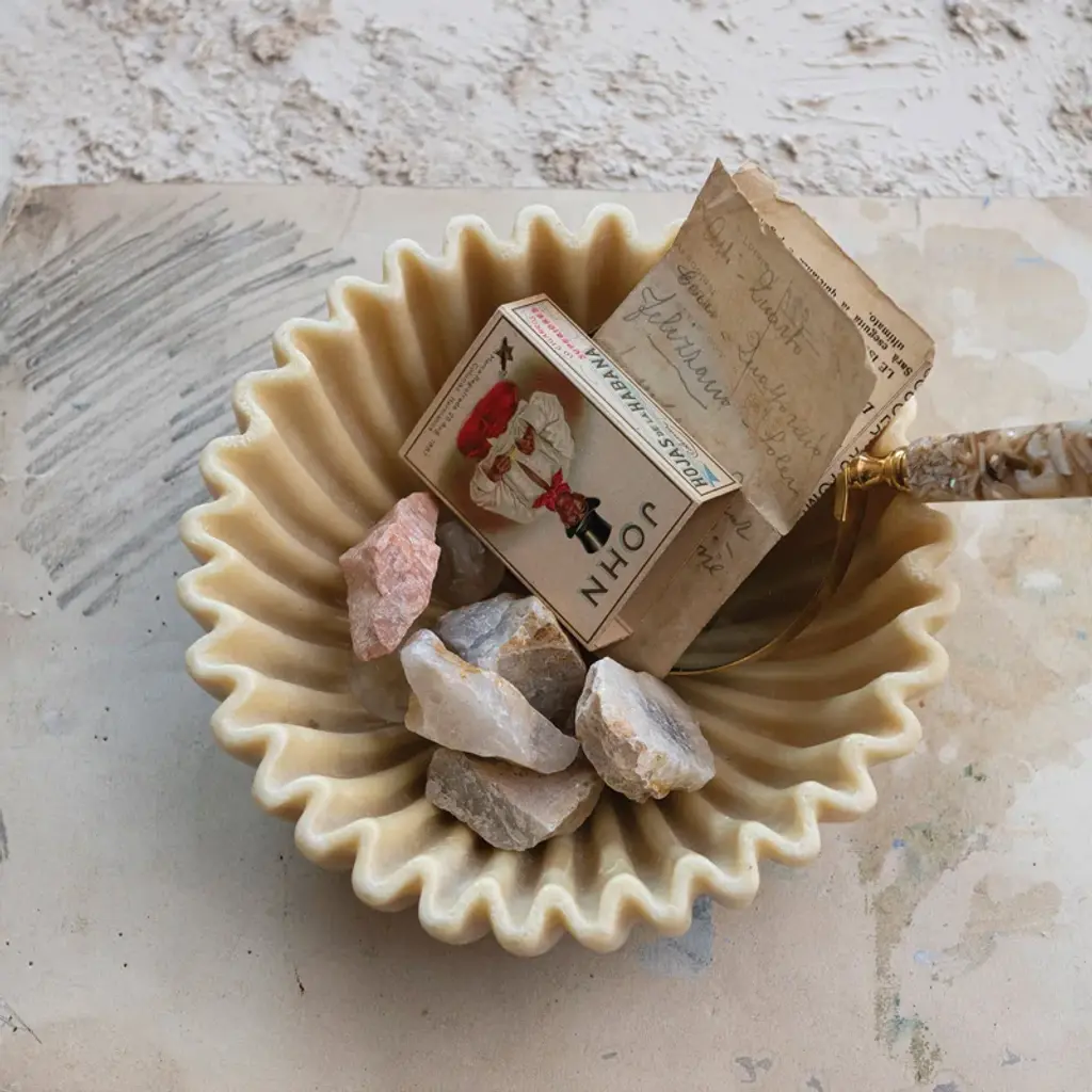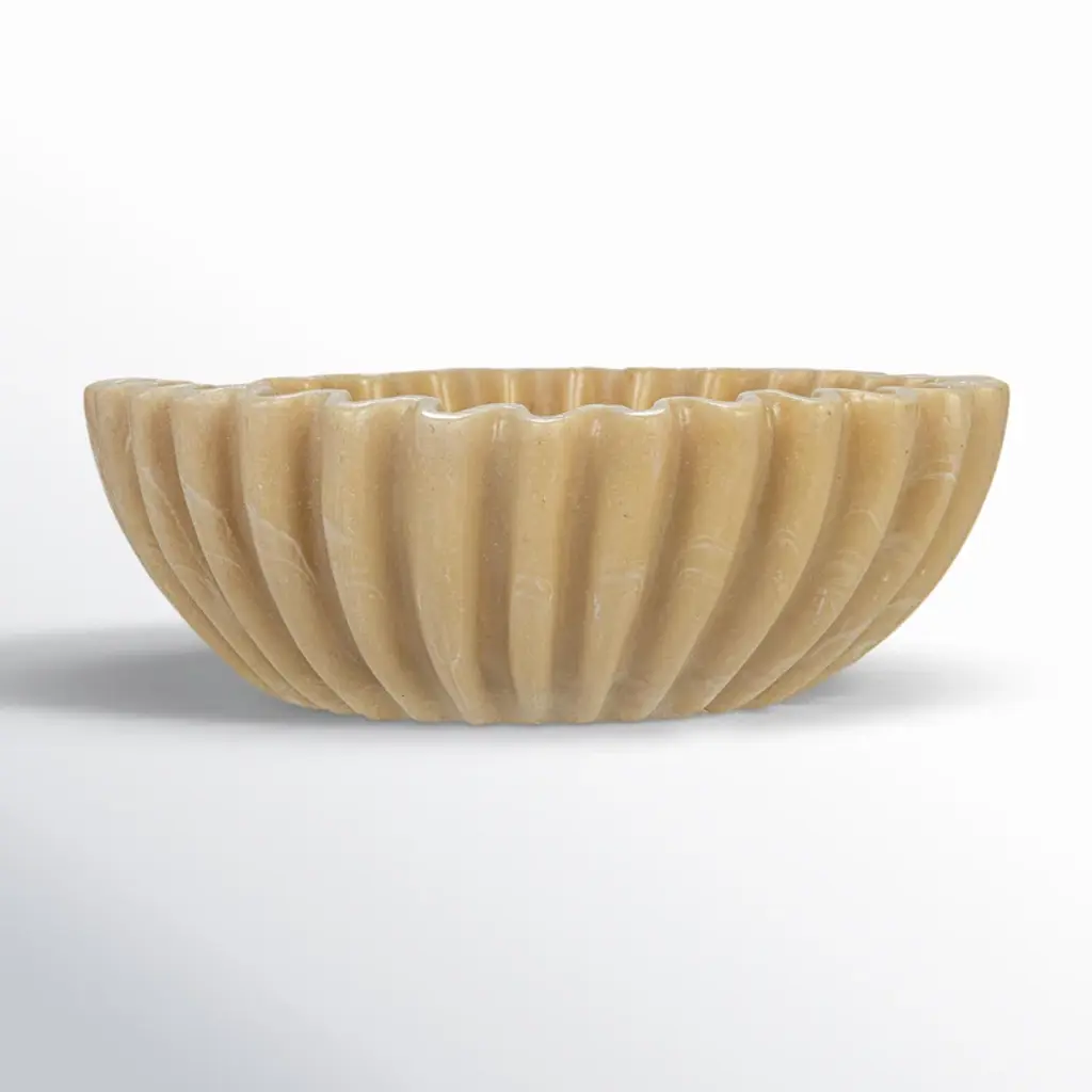 This resin-fluted bowl is a beautiful and functional piece that will enhance any space in the home. The bowl has a round shape and a fluted design that adds texture and dimension to its surface. The bowl has a beige color that blends well with any color scheme and creates a warm and cozy atmosphere. The bowl is made of resin, which is a sturdy and lightweight material that can last for a long time. Use this bowl for various purposes, such as storing small items or displaying it as an artistic piece. The bowl measures 8 inches in diameter and 3 inches in height. It is easy to clean and maintain. This bowl will make a great addition to the home decor, no matter what style one prefers.