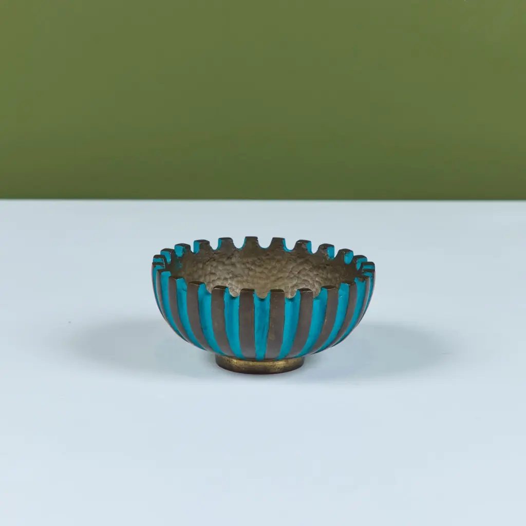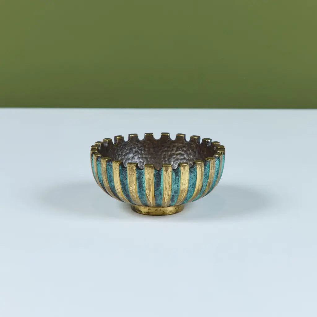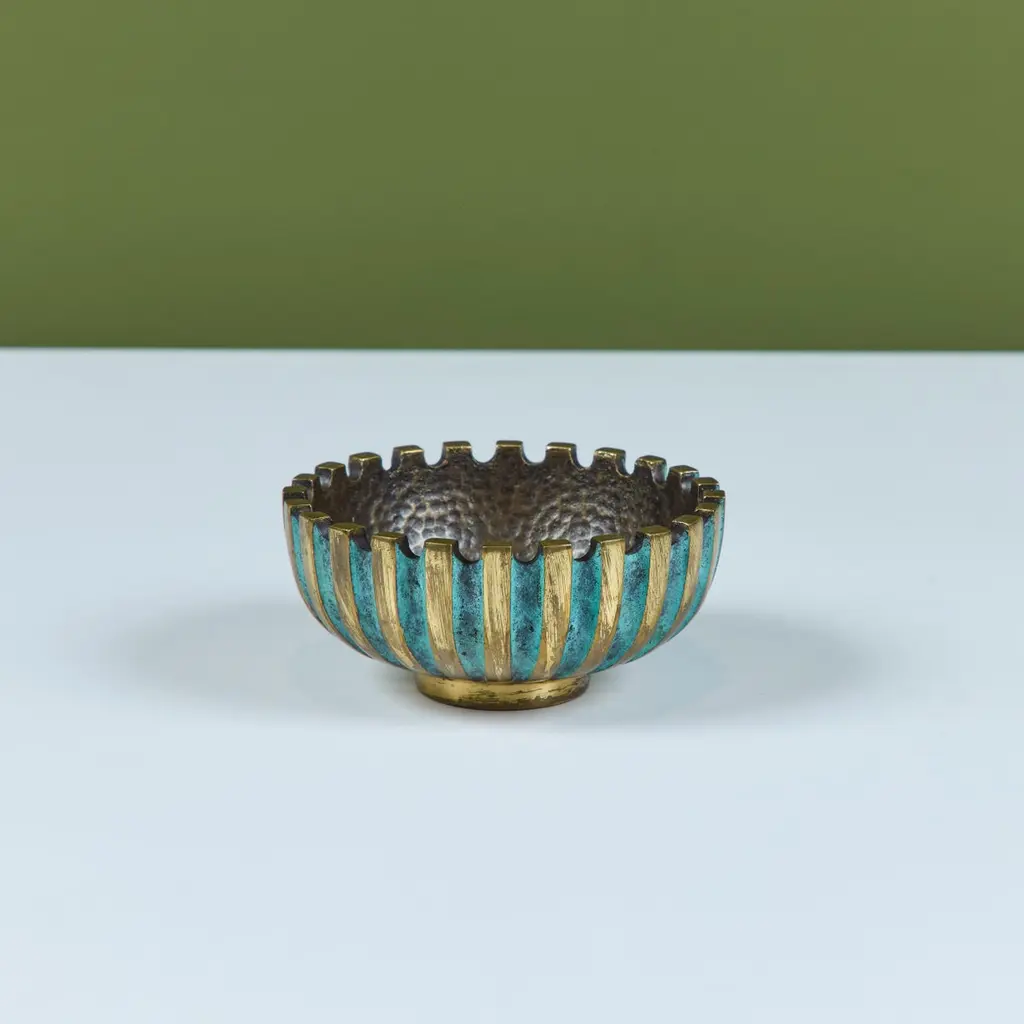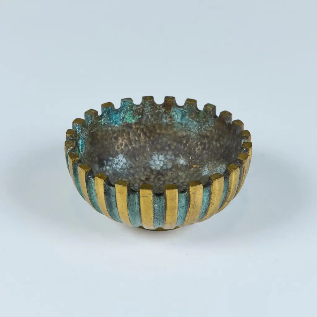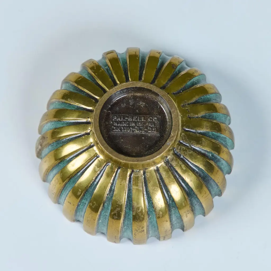 Mid-century cast bronze Pal Bell bowl. Features indented, ribbed exterior with alternating patinated bronze and verdigris stripes. The interior has a hand-hammered texture. An embossed stamp on the underside reads Pal-Bell Co. Made in Israel.Dimensions4" diameter x 2" height.ConditionGood vintage condition with age appropriate patina. Multiple available all with varying patina and coloring. Please inquire if you would like a specific coloration pictured.