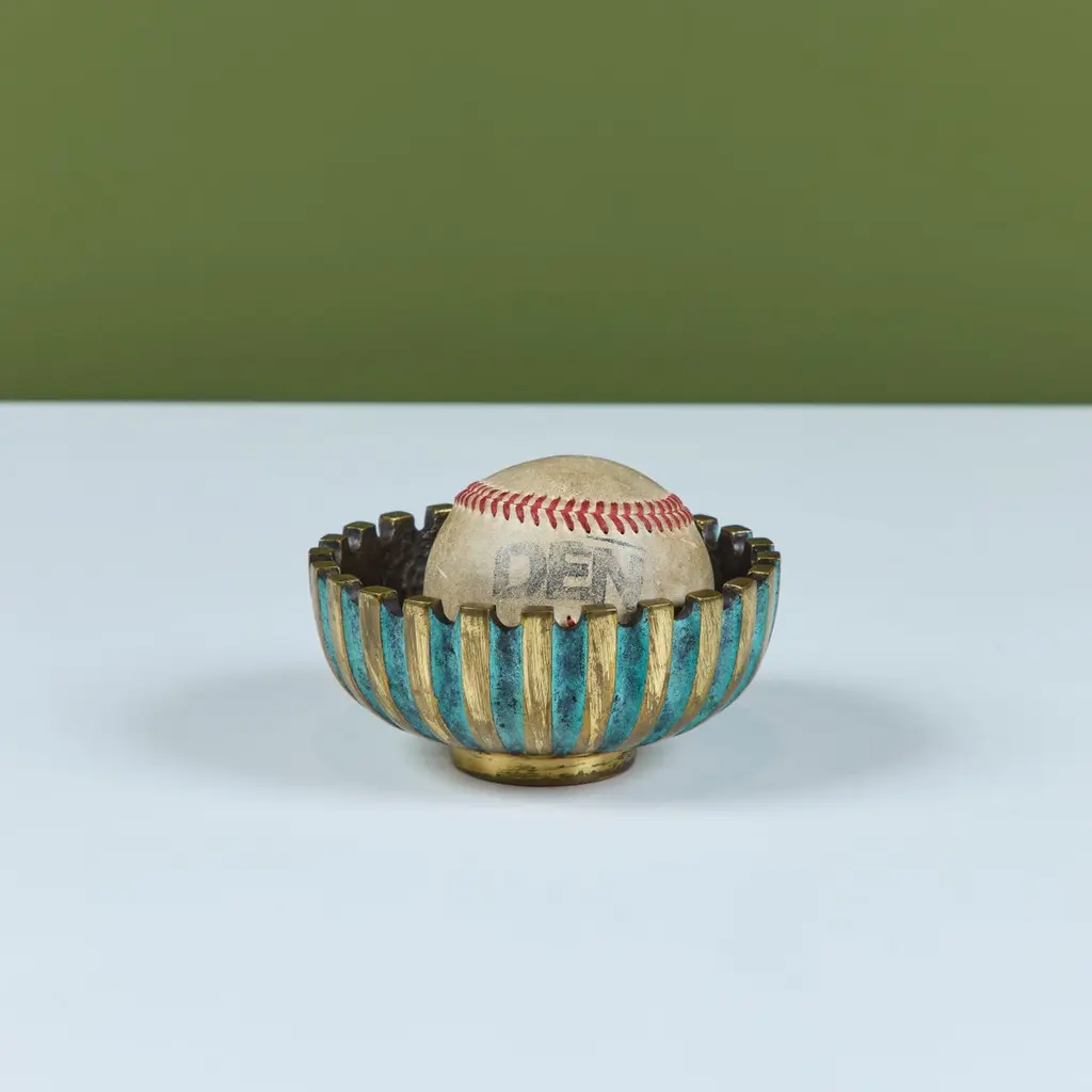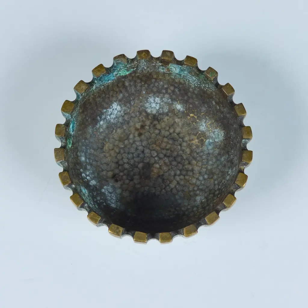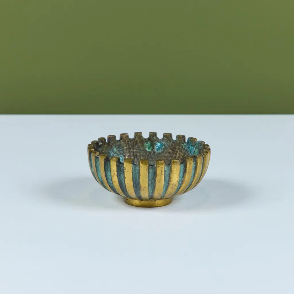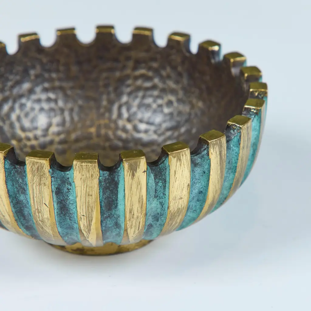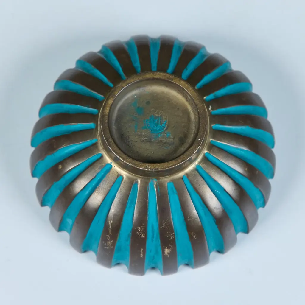 Mid-century cast bronze Pal Bell bowl. Features indented, ribbed exterior with alternating patinated bronze and verdigris stripes. The interior has a hand-hammered texture. An embossed stamp on the underside reads Pal-Bell Co. Made in Israel.Dimensions4" diameter x 2" height.ConditionGood vintage condition with age appropriate patina. Multiple available all with varying patina and coloring. Please inquire if you would like a specific coloration pictured.