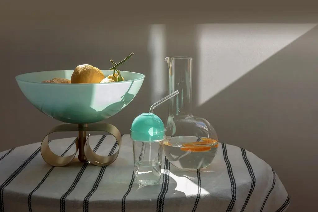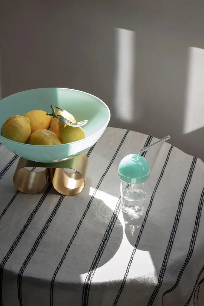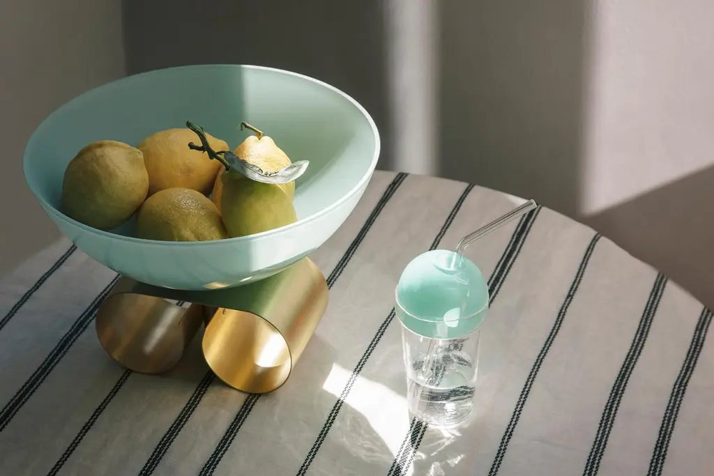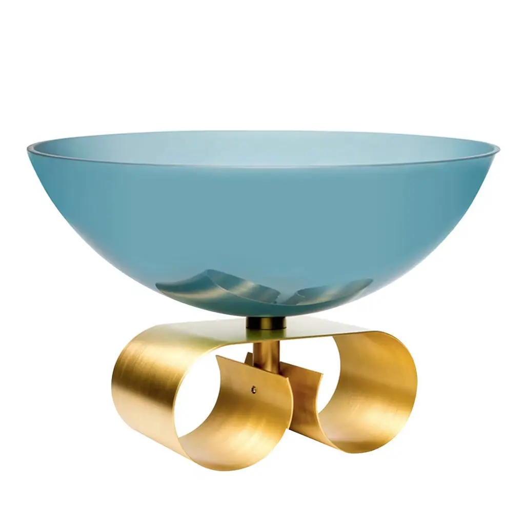 Large glass bowl with brass base, available in two colors versions: blue or light blue.Parure II, designed by Cristina Celestino, is part of Dolce Vita, a collection that celebrates in a contemporary tone the charme of Italy in the Fifties - an era addressed to levity and joie de vivre, irony and optimism - in which you could taste the beauty of the objects and the practices related to them. The collection includes items that belong to an ironic way of life, related to an idea of sophistication and elegance.