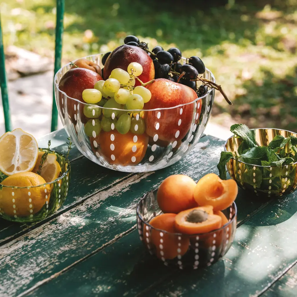 Designed by Federico de Majo, the Perle Bowl (Set of 4) from Zafferano offers an extraordinarily charming shape and accented exterior elevating all of your daily needs. Handcrafted by skilled master glassblowers, this bowl offers a transparent silhouette accented by a pattern of dots, resulting in stunning visual shadow play as light hits every angle. Available in a variety of colors to match your tabletop settings, this bowl set is dishwasher safe for easy cleaning and can stack effortlessly to store away when not in use.Highlights