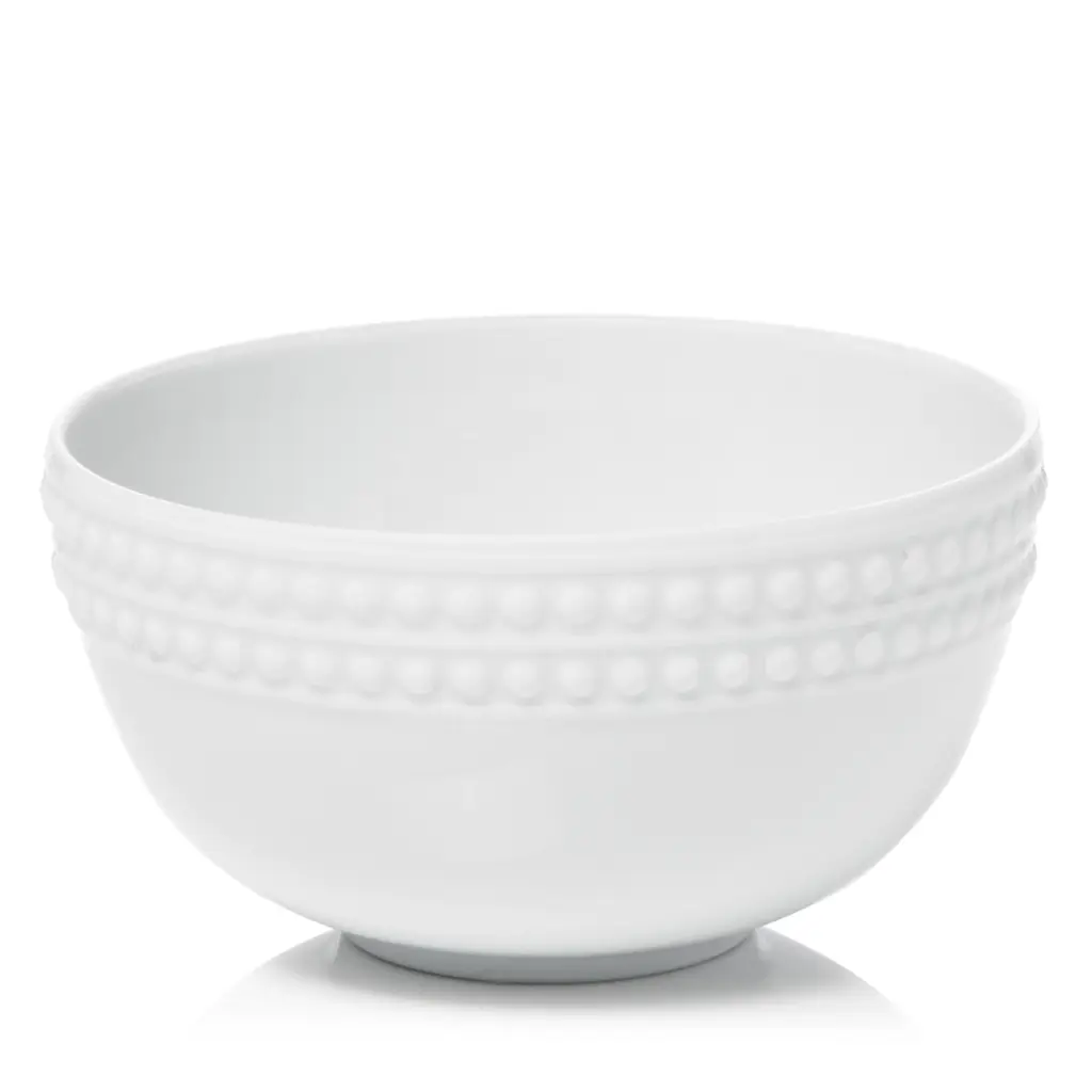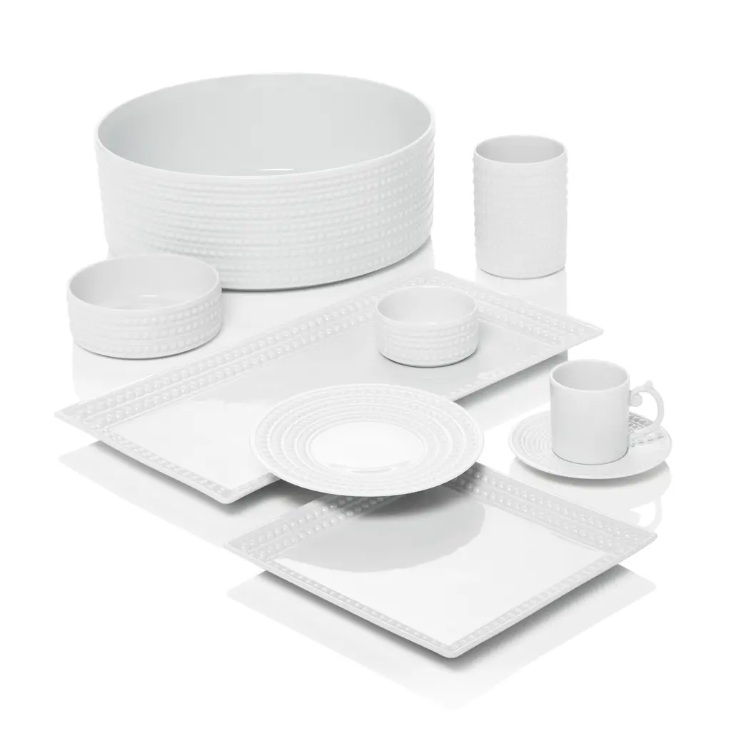 The refined beauty of natural pearls informed this elegant white porcelain dinnerware from L'Objet.