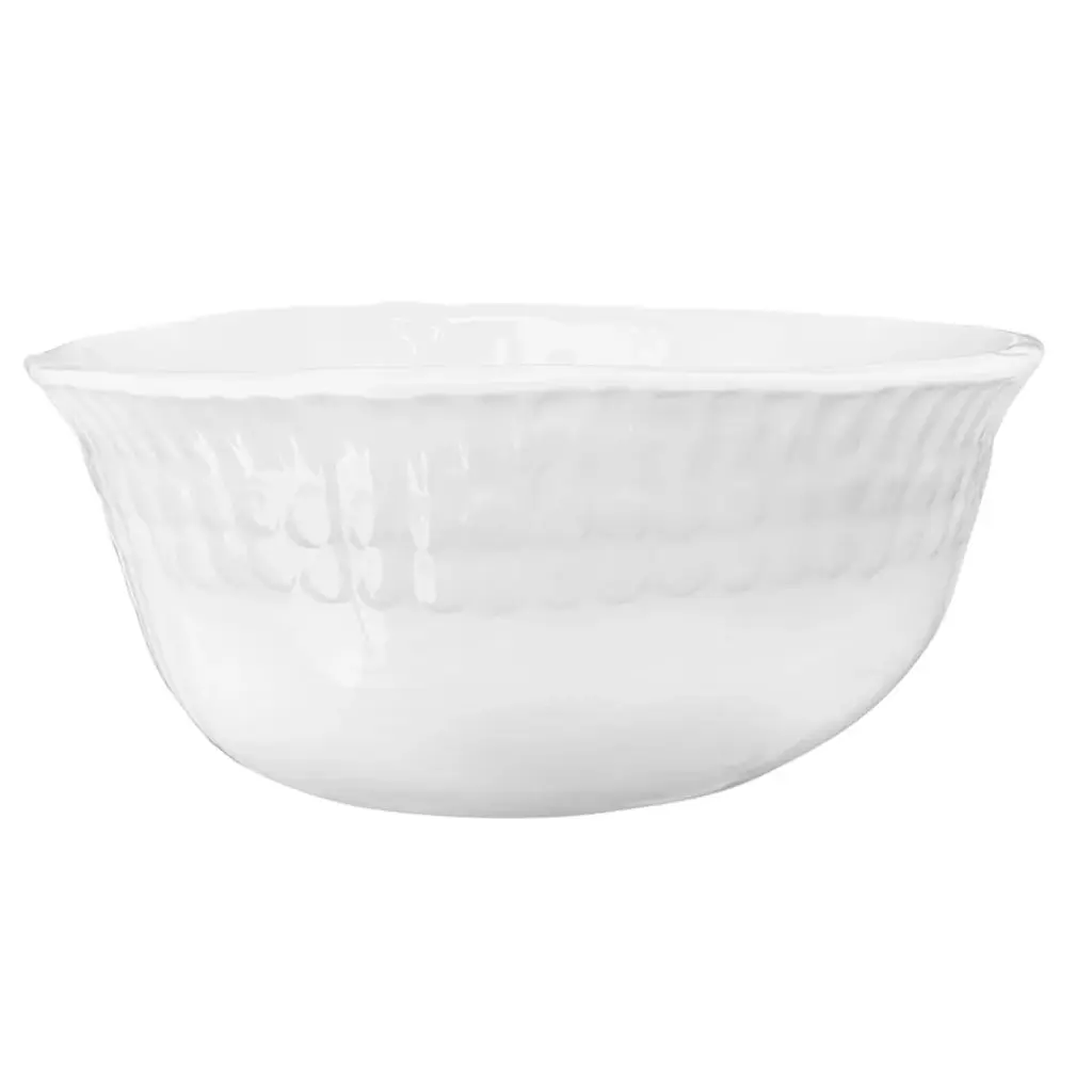 The refined beauty of natural pearls informed this elegant white porcelain dinnerware from L'Objet.