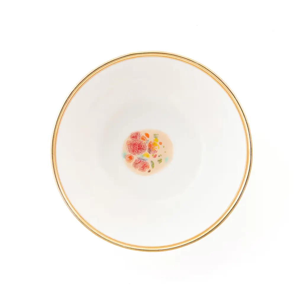 The Piazza del Popolo collection is named after a Roman landmark, and inspired by traditional Italian artisanal pottery yet decorated in a personal and elegant key. These Chestnut fruit bowls are painted on the outside in a warm sandy tone with multicolor dots; the inside is white while the bottom is decorated with a splotch of chestnut with multicolor dots. Due to the presence of real 24-karat gold, it is not suitable for microwaves. Non-aggressive soap and delicate washing are recommended.