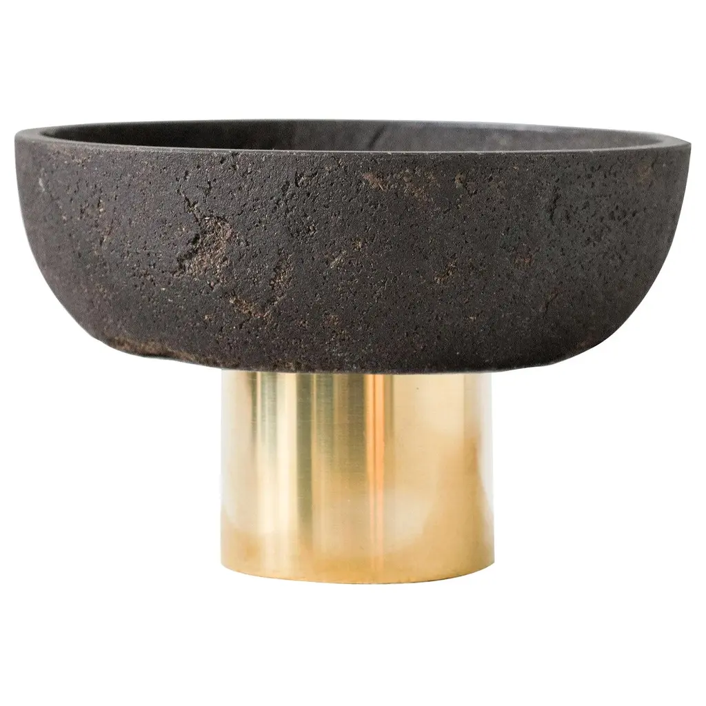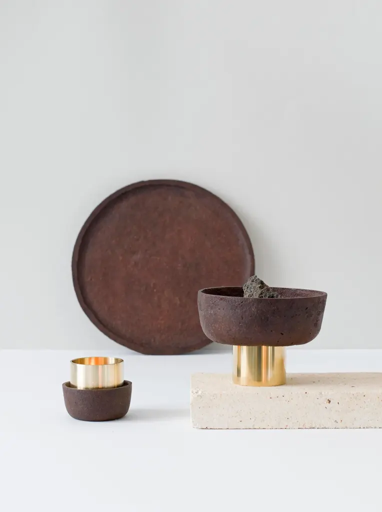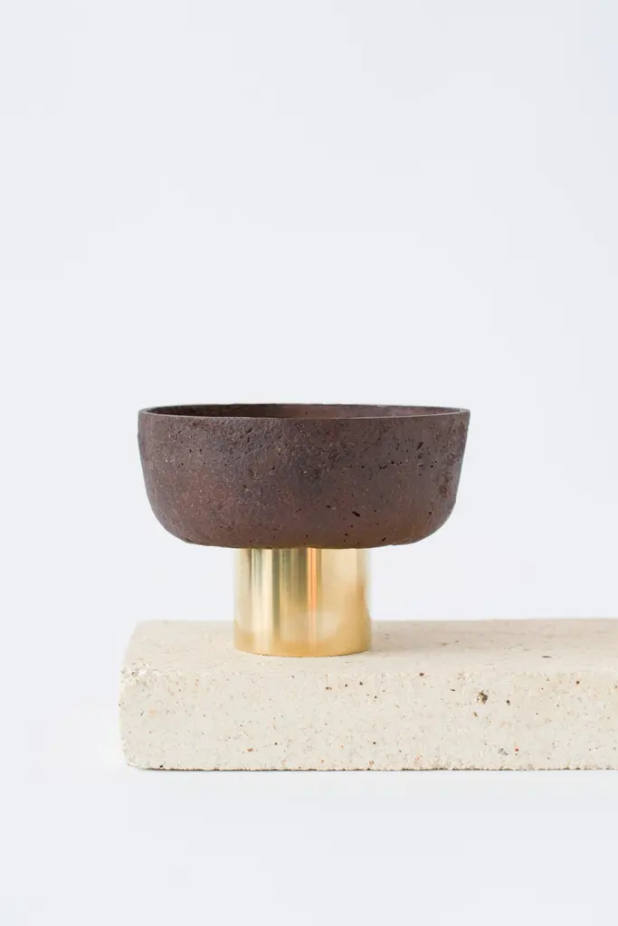 Pine pedestal bowl by Evelina Kudabaite StudioHandmadeMaterials: pine, brassDimensions: H 7.5 mm x D 12 mmColour: reddishNotes: for dry useSince 2015, product designer Evelina Kudabaite keeps on developing and making GIRIA objects. Designer firsthomeware collection launched in 2015 during the London Design Festival. Everyday objects are used, seen, touched. Tactility and expressive qualities of materials have important communicative value, so the design process requires for intense research on textures. GIRIA is a homeware collection balancing between tactility, shape and color. The project is aimed to pass the sensations of the forest through material, to establish a connection between the user and the object. This collection is result of an experimental process by which it was meant to show how materials, which are destined to become waste - tree bark and leaves - can be transformed into sustainable design through the traditional crafts.It is a research on the alternative and unconventional ways to shape wood, which reminds of the culinary process. During the research a recipe of a unique material that consists of harmless organic substances has been found. No two items in GIRIA are the same: each is made by hand and the bark dust of diferent kinds of trees gives a unique texture, varying in colour and roughness of a surface. It takes time to make a piece in GIRIA, that is considering preparation of the bark, drying time - from days, to weeks - and variability of the process. All the items are coated with mix of foodsafe oils to make it more durable. The materials in GIRIA may change slowly over time and the collection distinguishes itself from mass production, making the products as individual as their owners.Evelina is a product designer based in Vilnius, Lithuania. Her research usually starts from materials and processes which transform them into design objects. She is fascinated by the narrative hidden in a product and by its power of carrying knowledge, memories and emotions in a more concrete and tactile way. When designing something, she wants to tell a story, to create a reaction of wonder and curiosity in the people who are going to interact with the object.