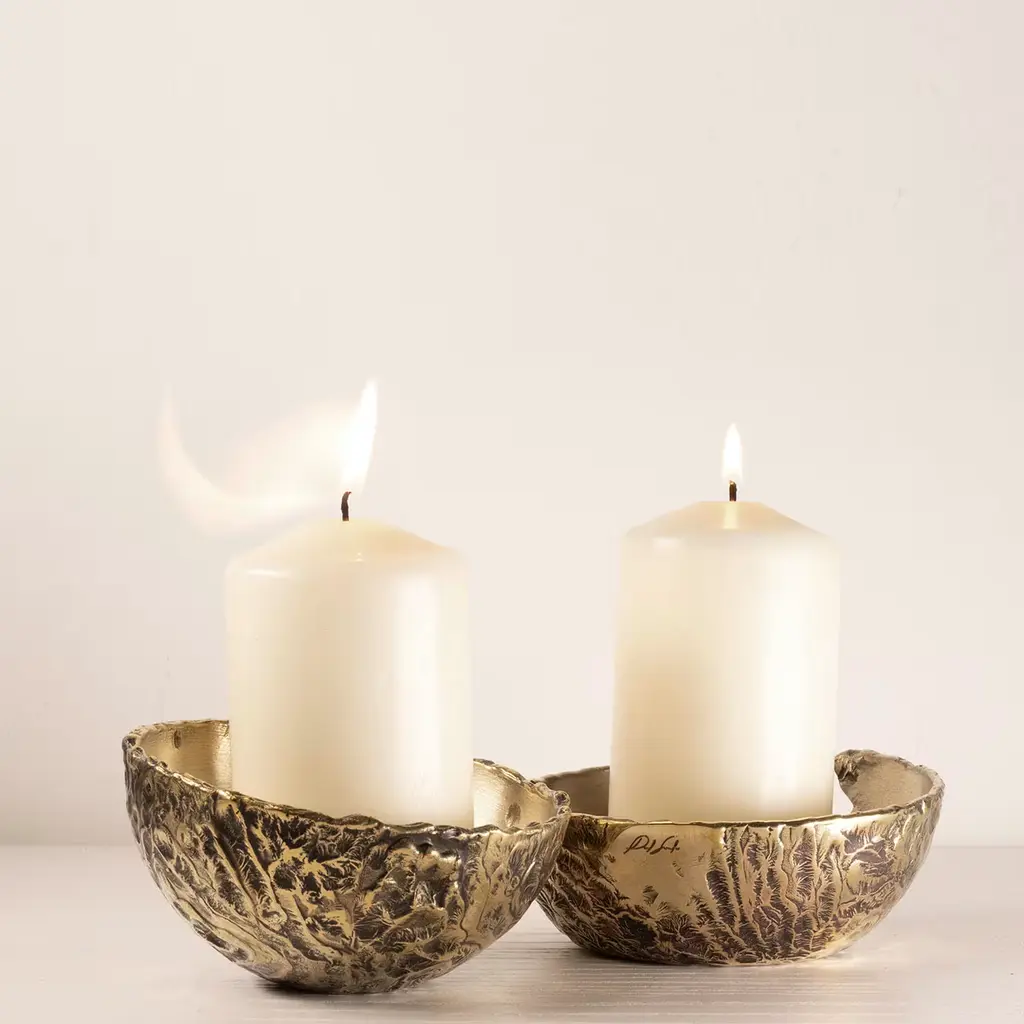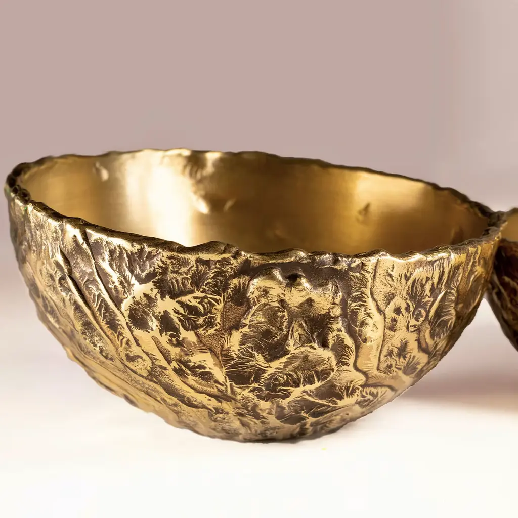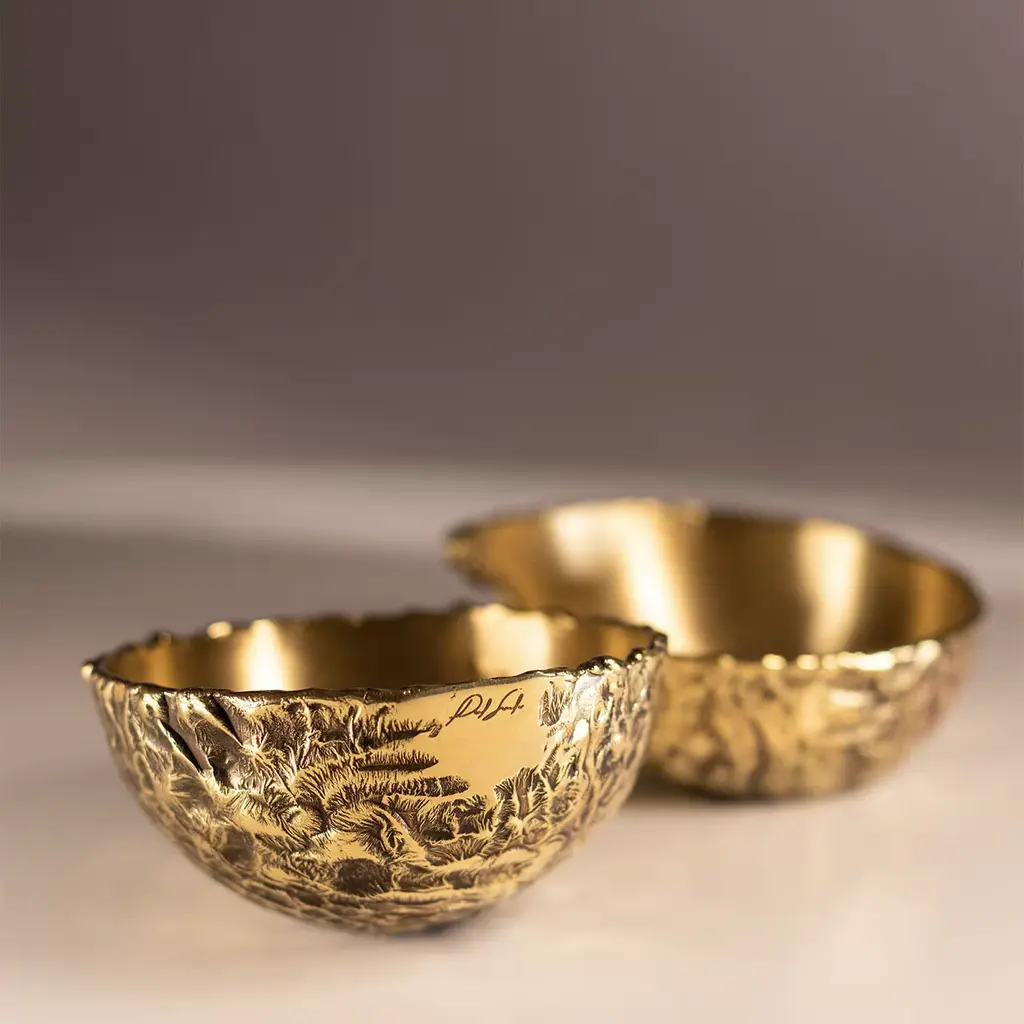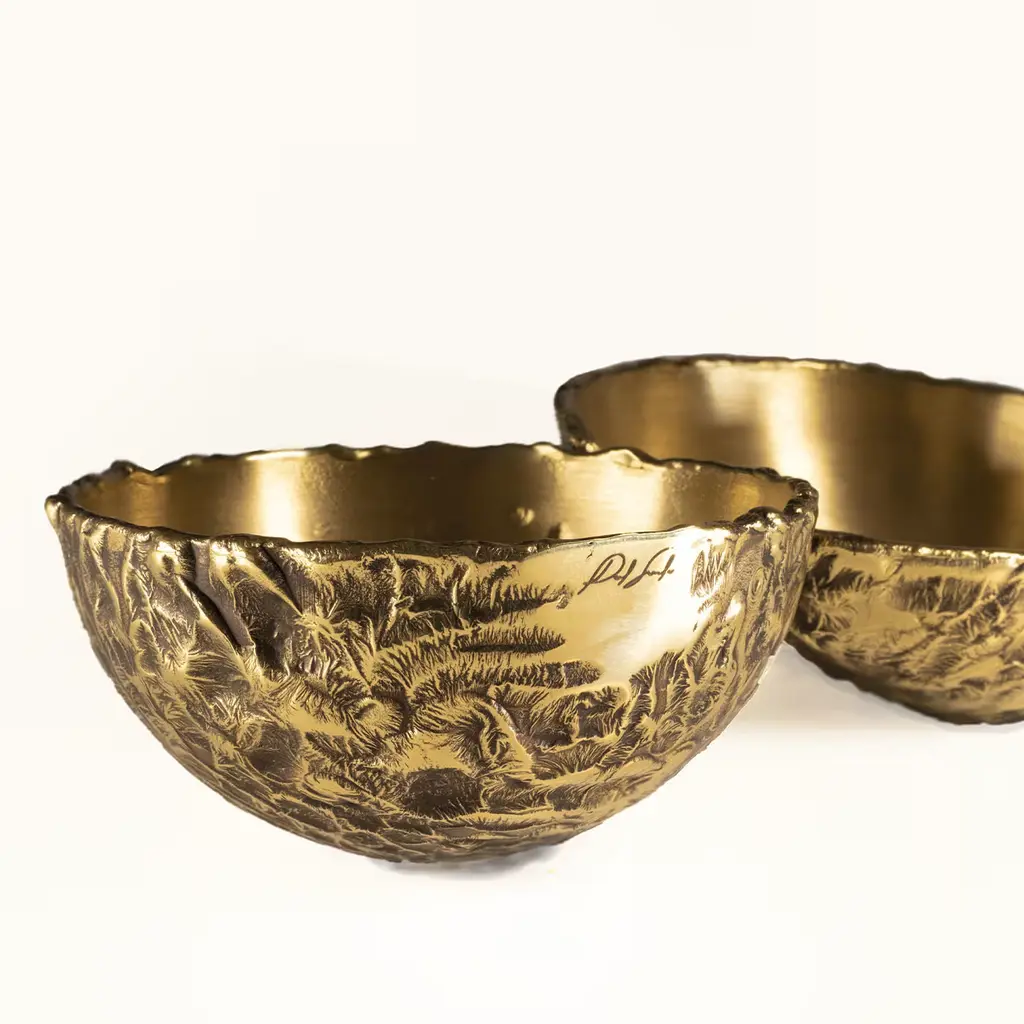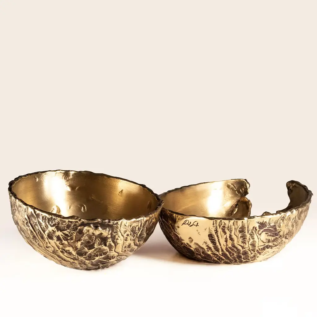 This luminous bowl brims with the allure of a rare handcrafted jewel, sure to create a special focal point on a coffee table or kitchen counter. It is crafted from waste brass, treated through an entirely manual process including the heating, the cleaning, and the polishing step. The textured and polished look of the outside contrasts with the hand-obtained satin finish along the interior. The piece belongs to a numbered series of 18 each with the logo etched onto the surface.
