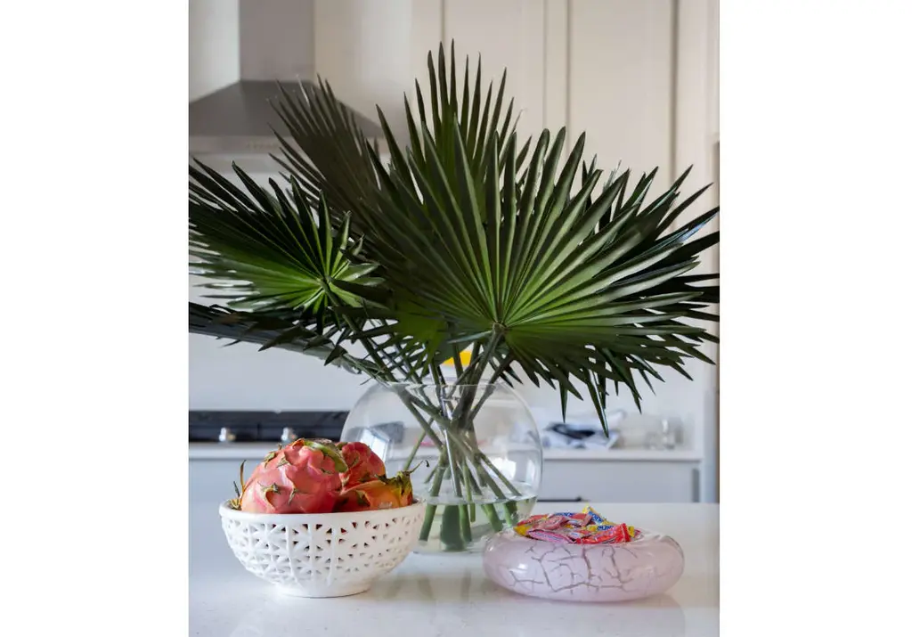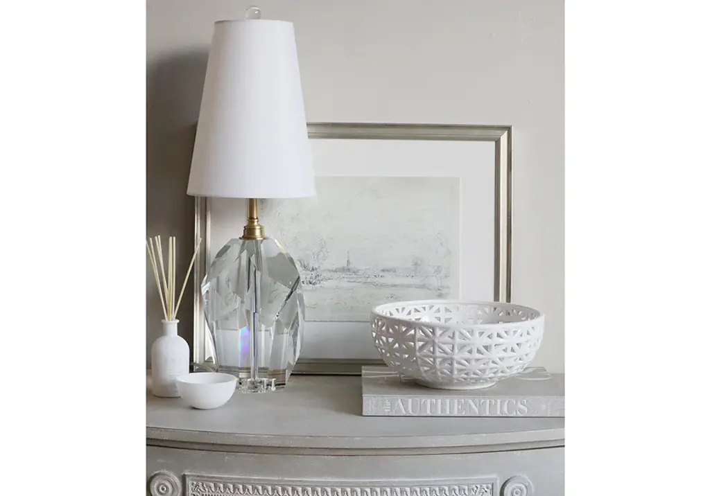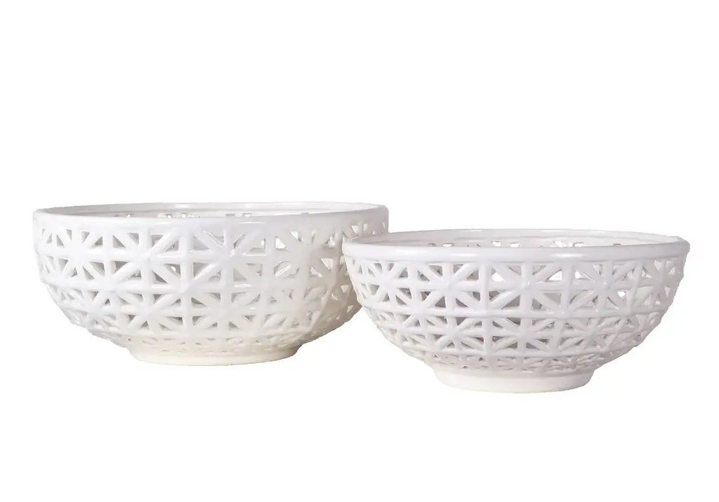 This elegant bowl lends a tasteful touch with its glossy white porcelain form and textured lattice pattern. Style alone or pair the different sizes together for a cohesive look.