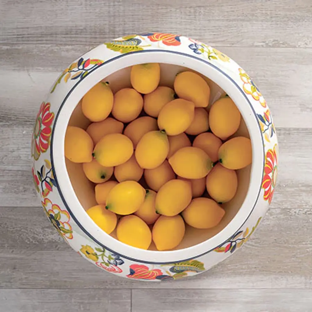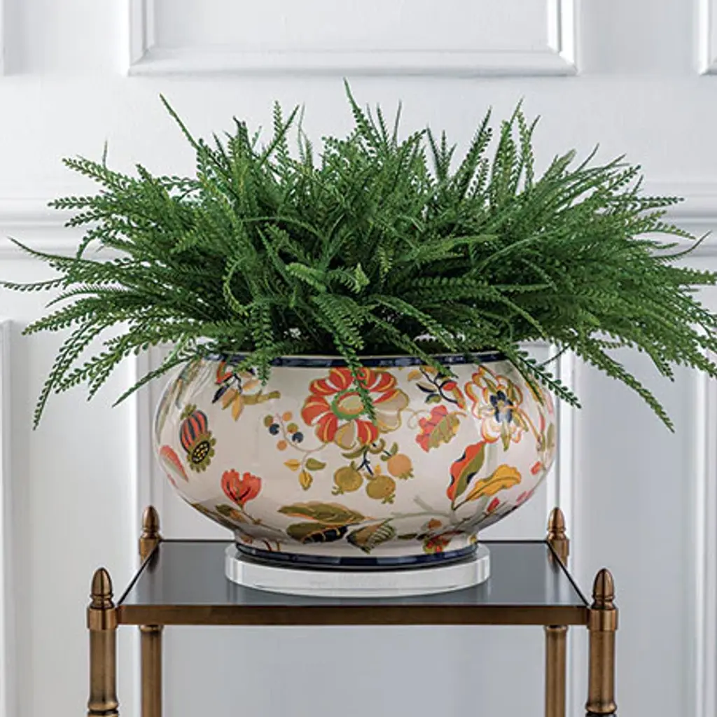 Garden of Eden is our whimsical porcelain collection inspired by a grand Jacobean floral pattern. The rich colorful pattern wraps around the porcelain basin. The center basin/bowl is accented with a navy detail band of color.