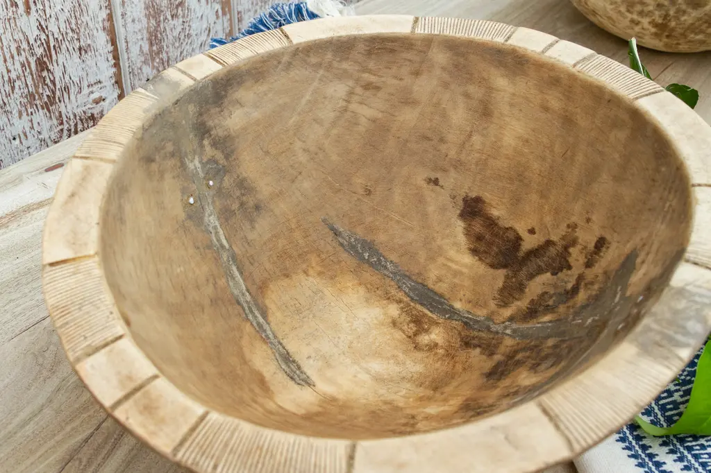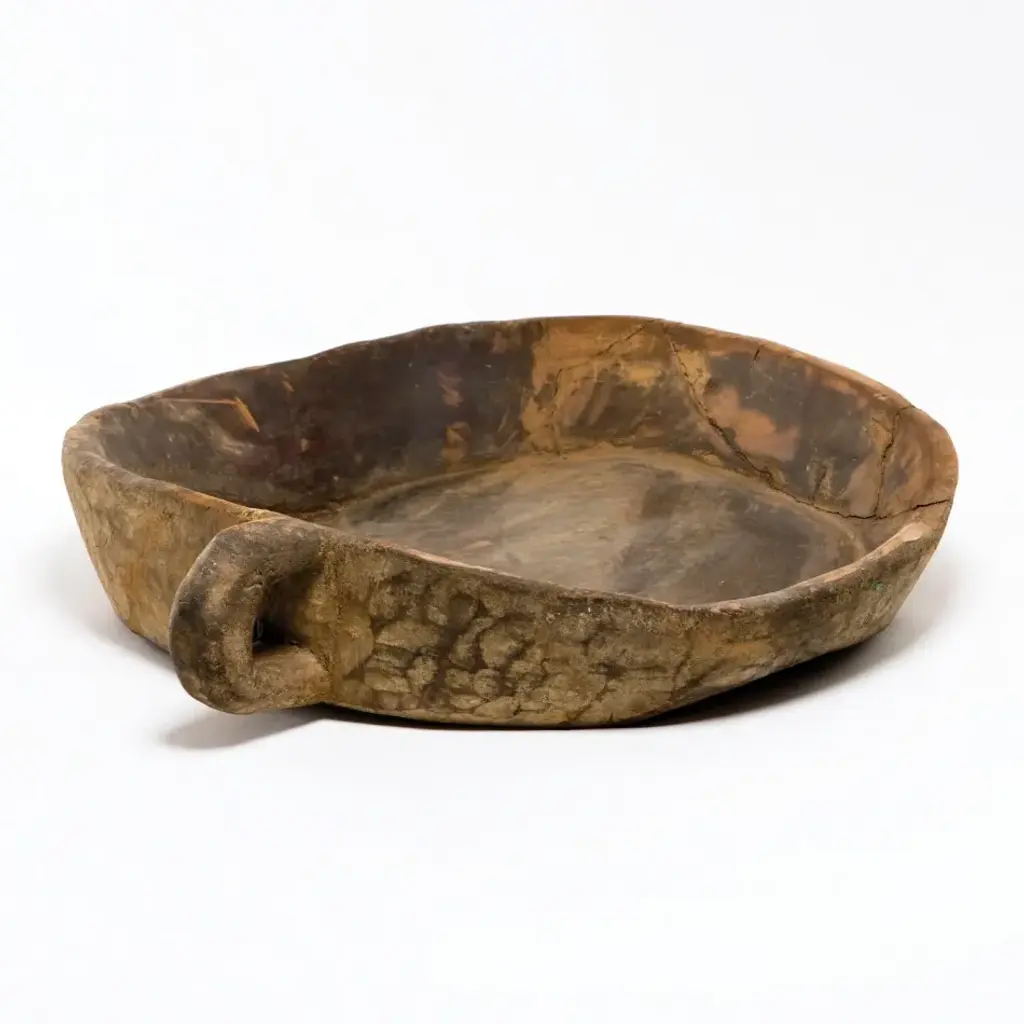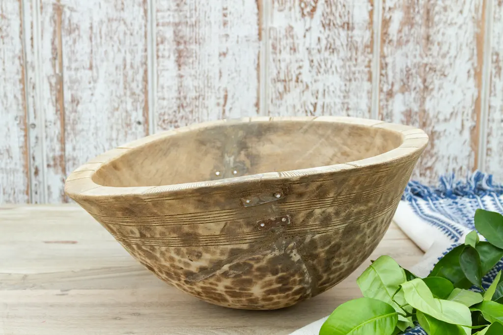 Hand-carved from single logs of indigenous hardwood in West Africa. The Tuareg community are a nomadic group traveling across the Saharan desert. Each bowl is unique featuring a fine decorative engraving with geometric lines or tribal design. These beautiful African bowls have a deep rounded shape and then have been used to transport and store milk and food. These bowls are authentic and will show wear, possible cracks.