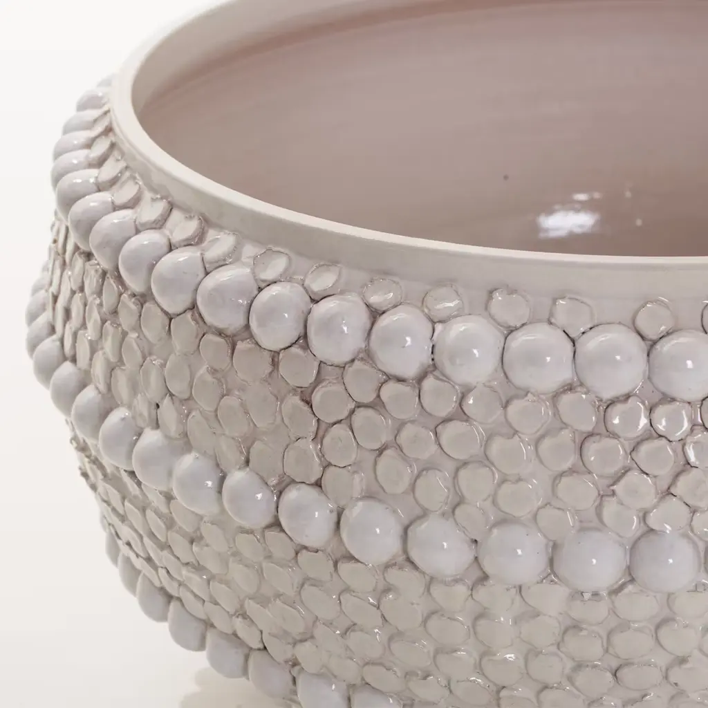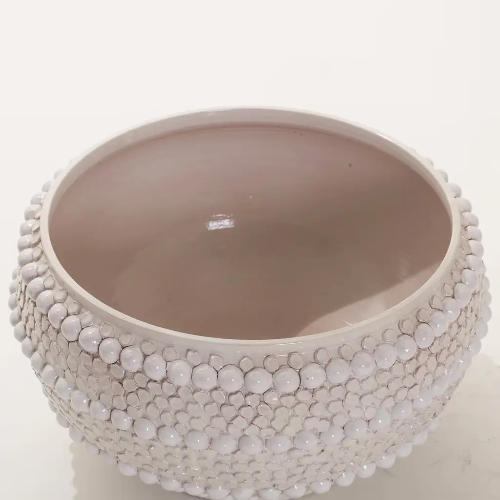This centerpiece bowl was entirely handcrafted by the artisans of the Tuscan atelier ND Dolfi. Gorgeous mosaic-like detail with buttons in relief combine modern design with traditional ceramic techniques in this pure white maiolica piece.