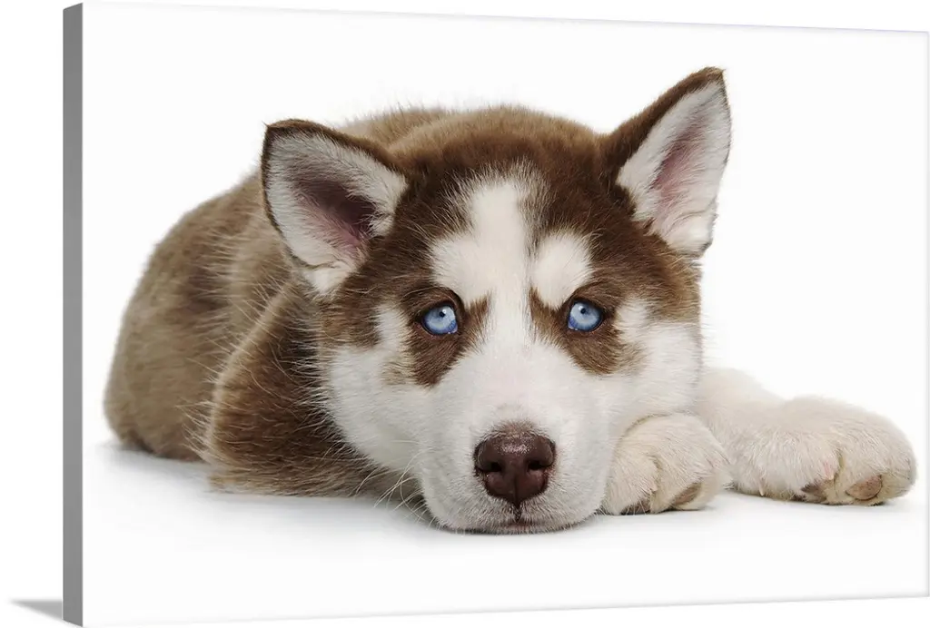 Happy Holiday Christmas cute Brown and White Siberian Husky Puppy laying down and eating out of his blue food dish with brown paw prints on the side of the dish