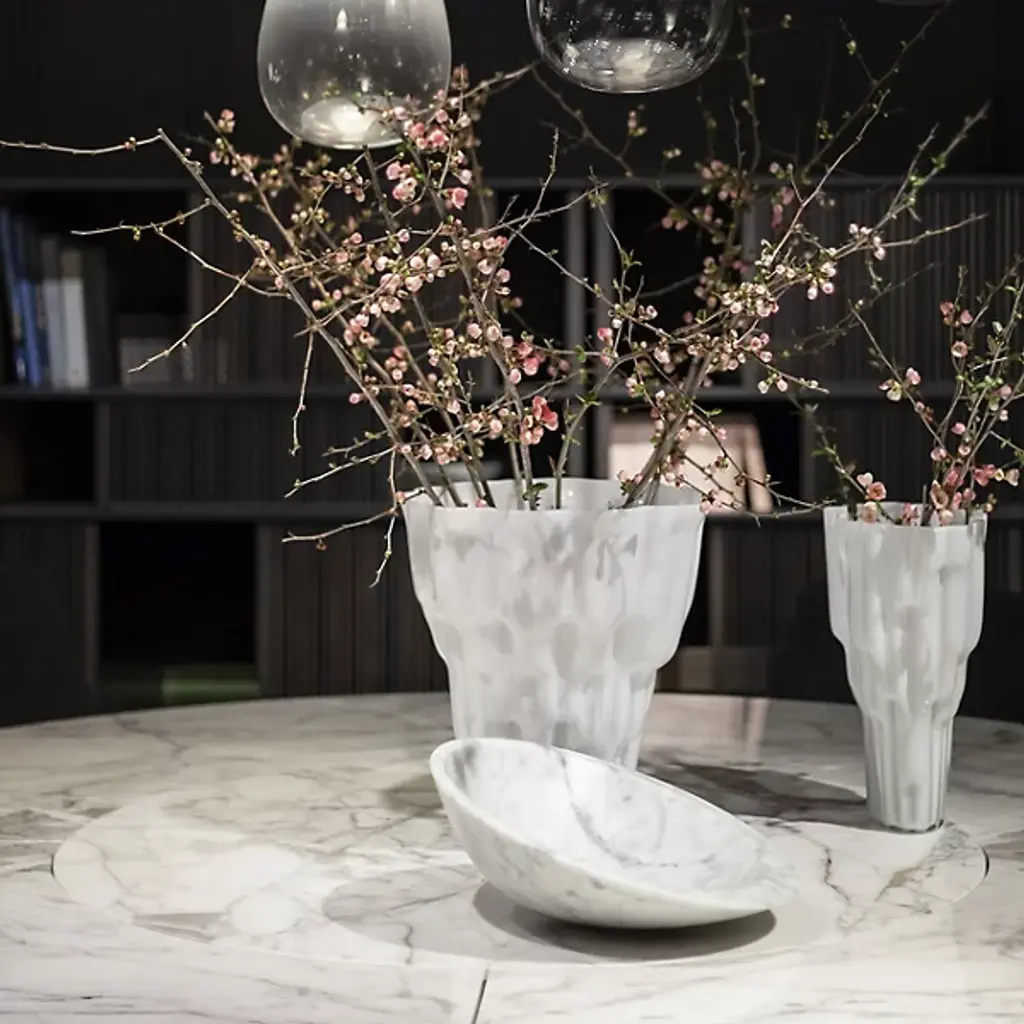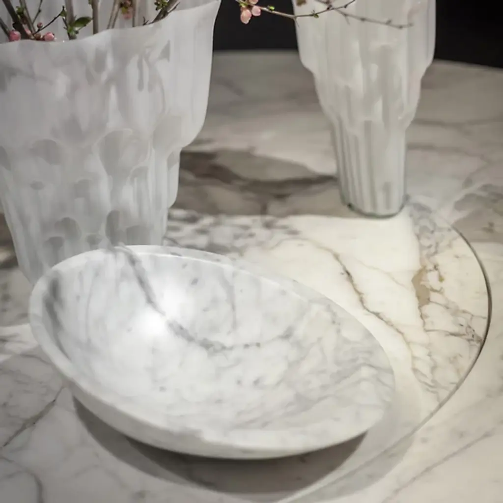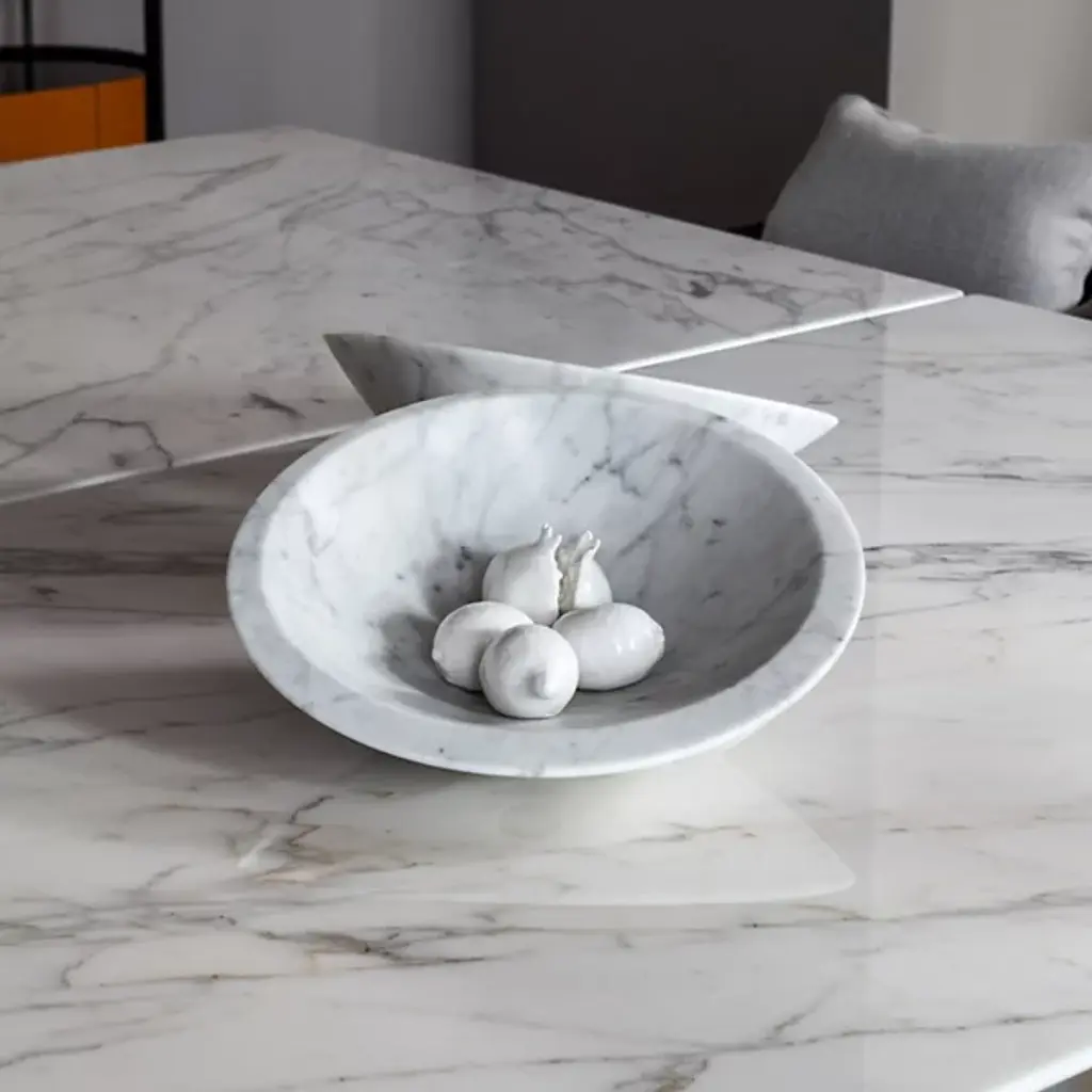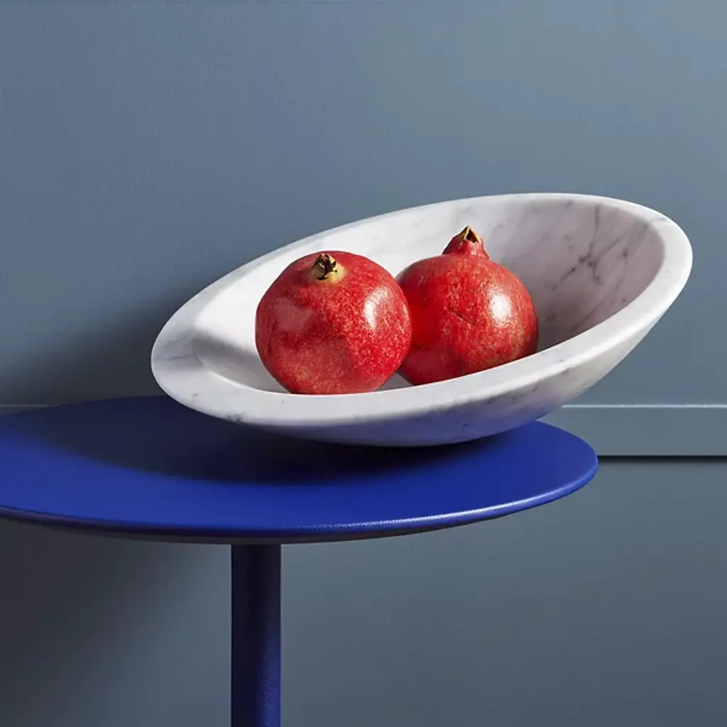 The Pura Bowl from Poltrona Frau’s asymmetrical design balances solids and voids, allowing it to rest naturally on one side. Crafted from marble using precision machinery, it is hand-smoothed to a semi-polished finish that retains its natural beauty. A circular brass plate with a Ruthenium finish on the underside is engraved with the designer’s signature and the Poltrona Frau logo, adding a refined touch.